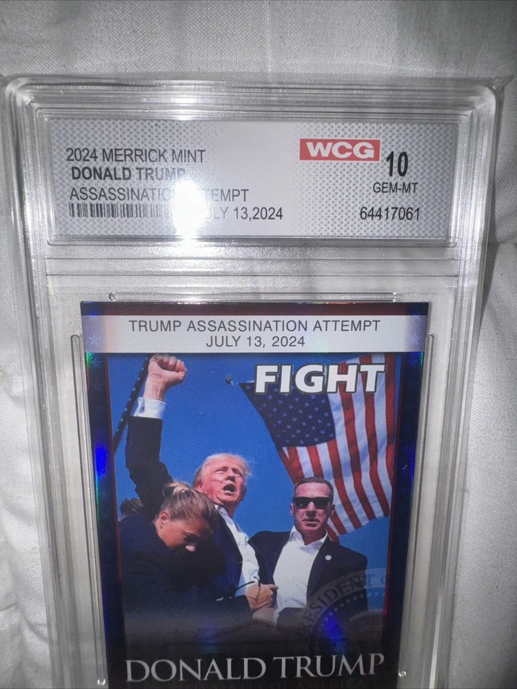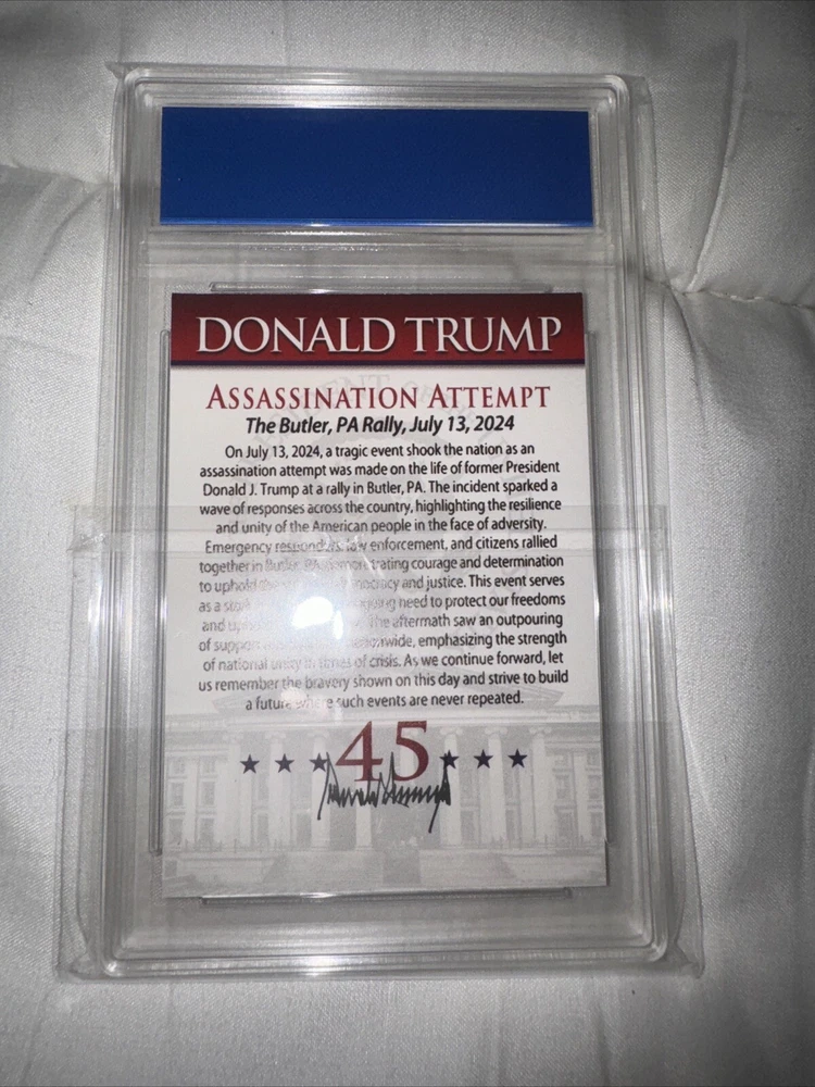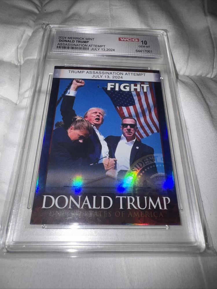 This Merrick Mint Donald Trump 2024 Assassination Attempt Card is a must-have for any collector of non-sport trading cards. This exclusive and collectors edition card features a chase design, with a standard size made from high-quality card stock material. The card is part of the Election set, with a parallel/variety that makes it unique from other cards. The card is in excellent shape, with no autograph, and is perfect for those interested in political, history, and military genres. It features Donald Trump, a famous US President, and is part of the US Presidents, Heroes, and Politics franchise. This card is a great addition to any trading card collection, and it is sure to impress.