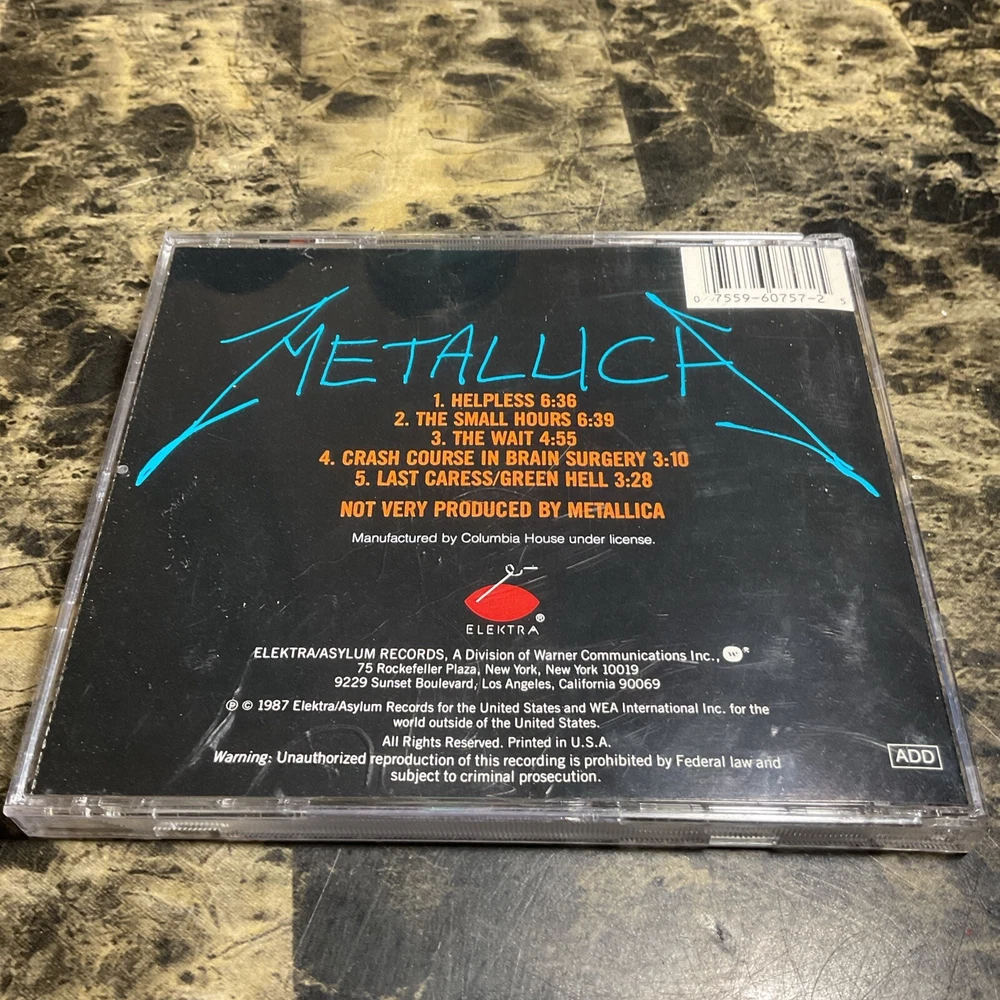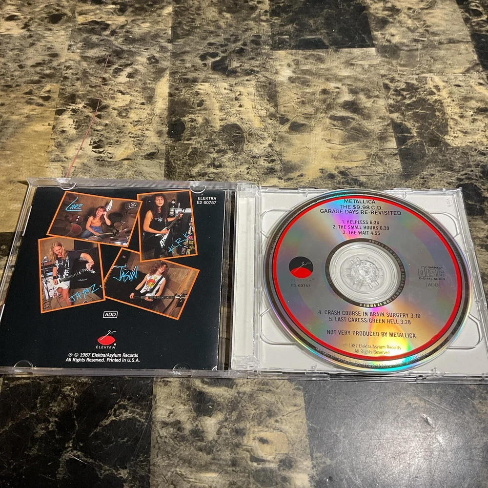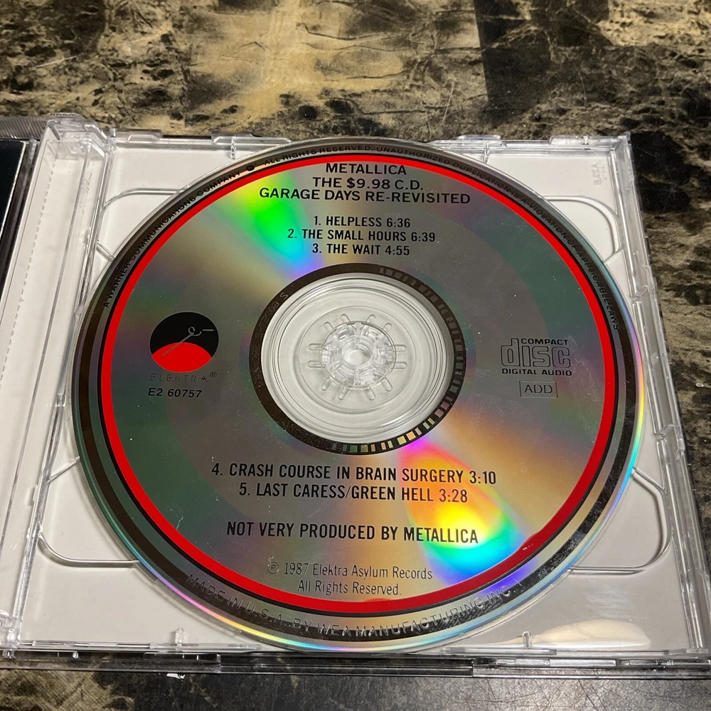 This is an excellent (EX) Metallica CD from 1987, featuring their iconic album "The $5.98 E.P.: Garage Days Re-Revisited." The CD comes in a standard jewel case and has a multicolor design. The inlay and case conditions are both rated as excellent (EX). The CD grading is rated as excellent (EX) and it is a first edition release. The album is in English language and produced by Metallica. This hard rock album from the 1980s has a run time of 25 minutes and is a must-have for any rock or hard rock fan.