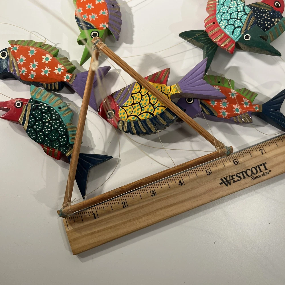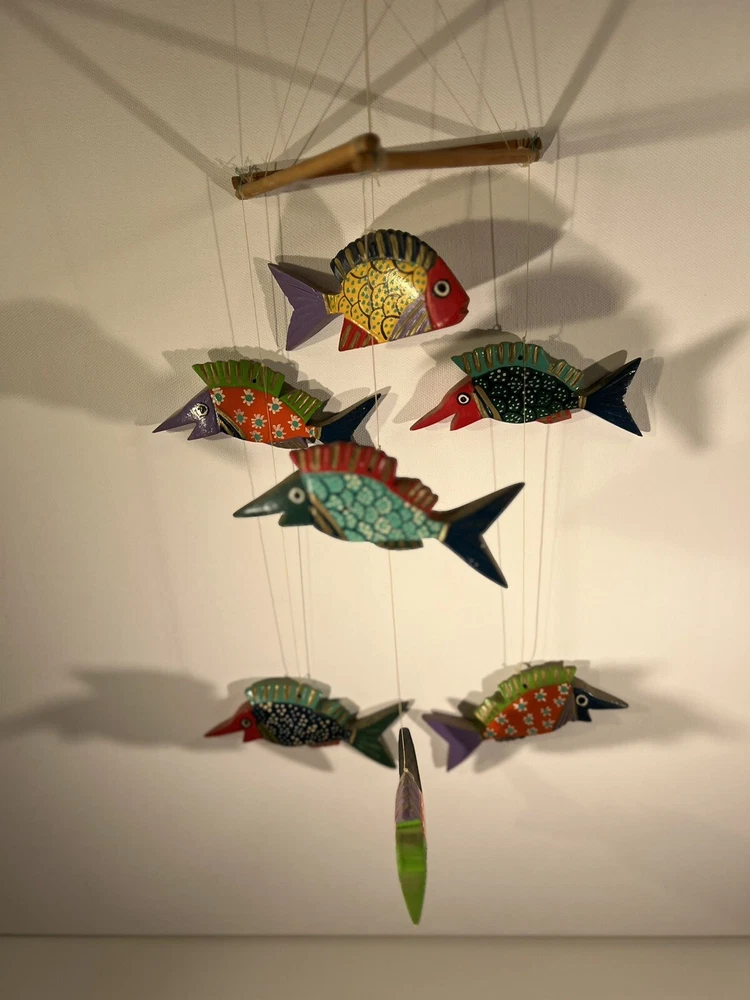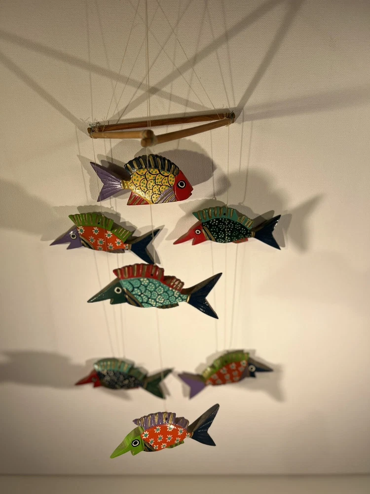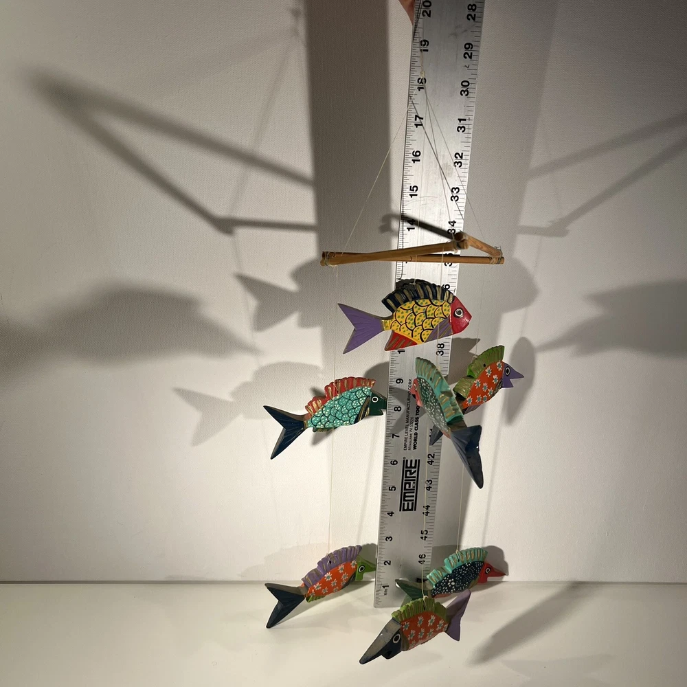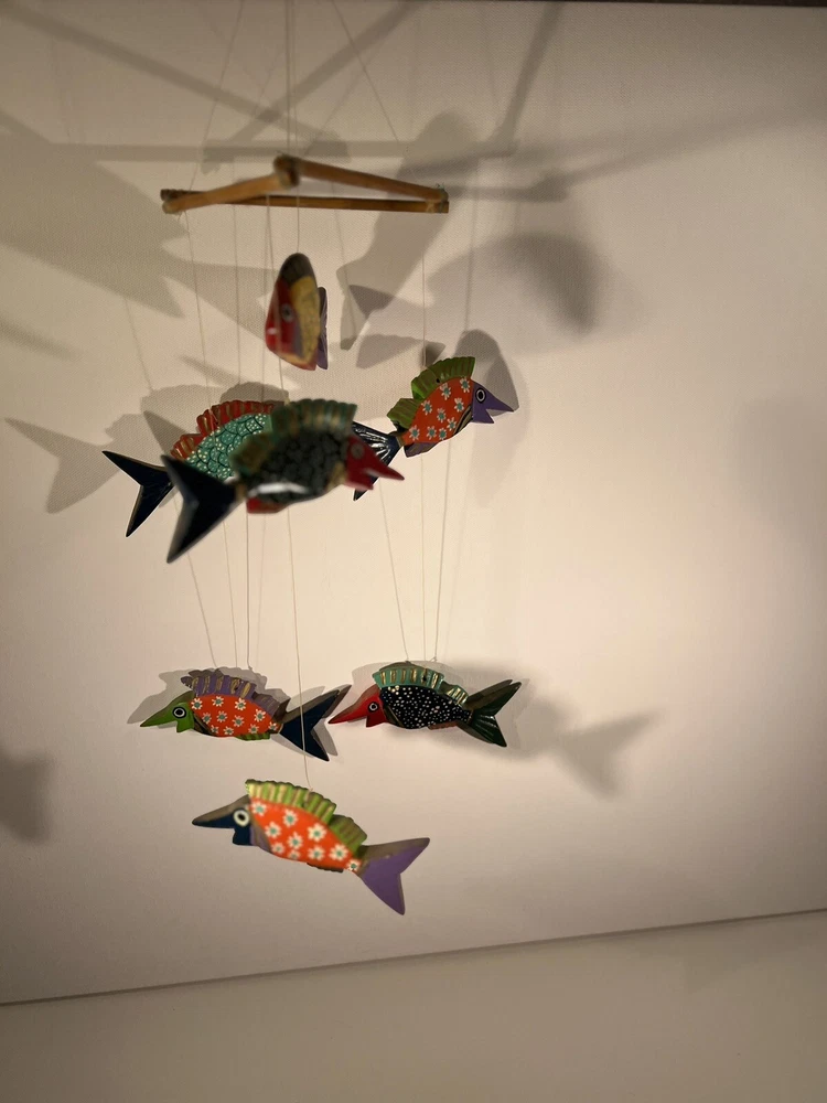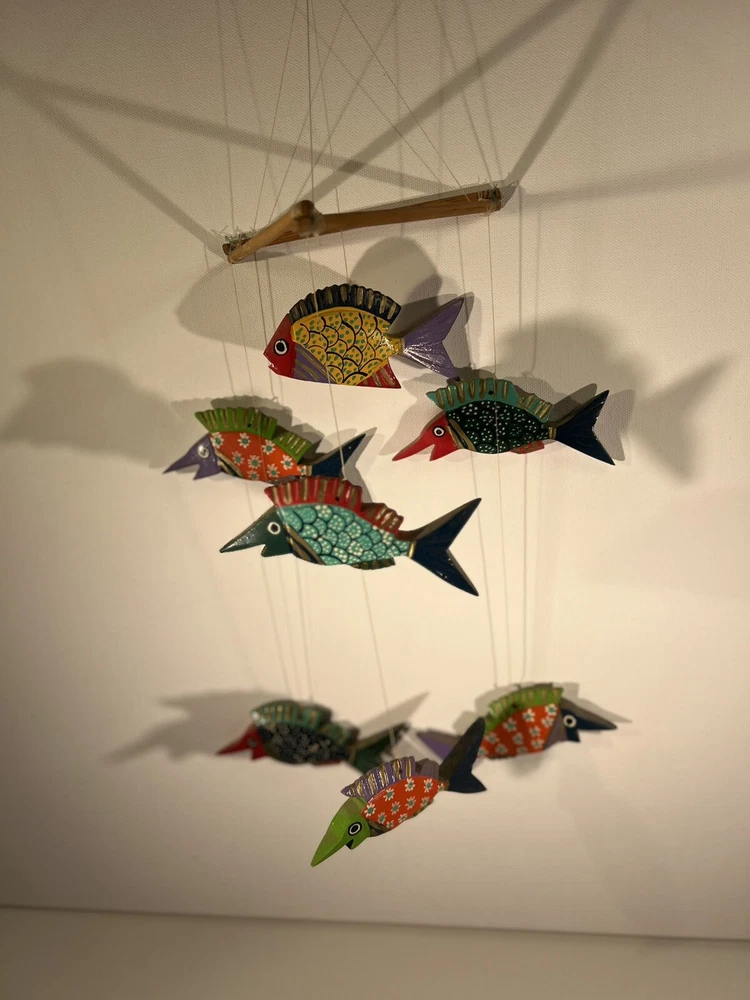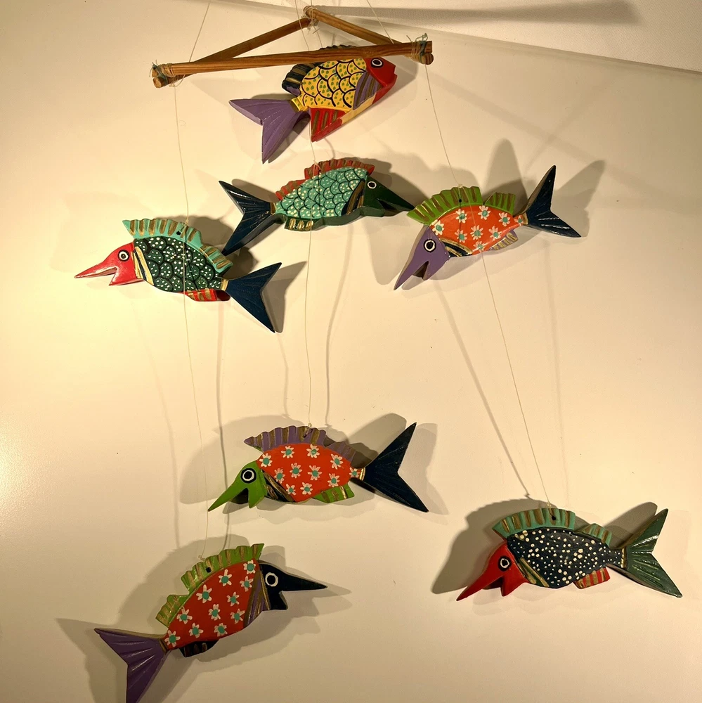 Bright, fun, colorful Mexican Folk Art Fish Mobile made of hand-painted carved wood fish. A decorative item that can be hung for a Caribbean beach house vibe, children’s room or any other place to add a touch of sea life, ocean culture to the ambiance. The mobile features several fish figures that are painted in vibrant colors, making it an eye-catching piece of collectible folk art. Beautiful condition, no flaws to note. Please see photos for measurements. Classic. Timeless. Modern.