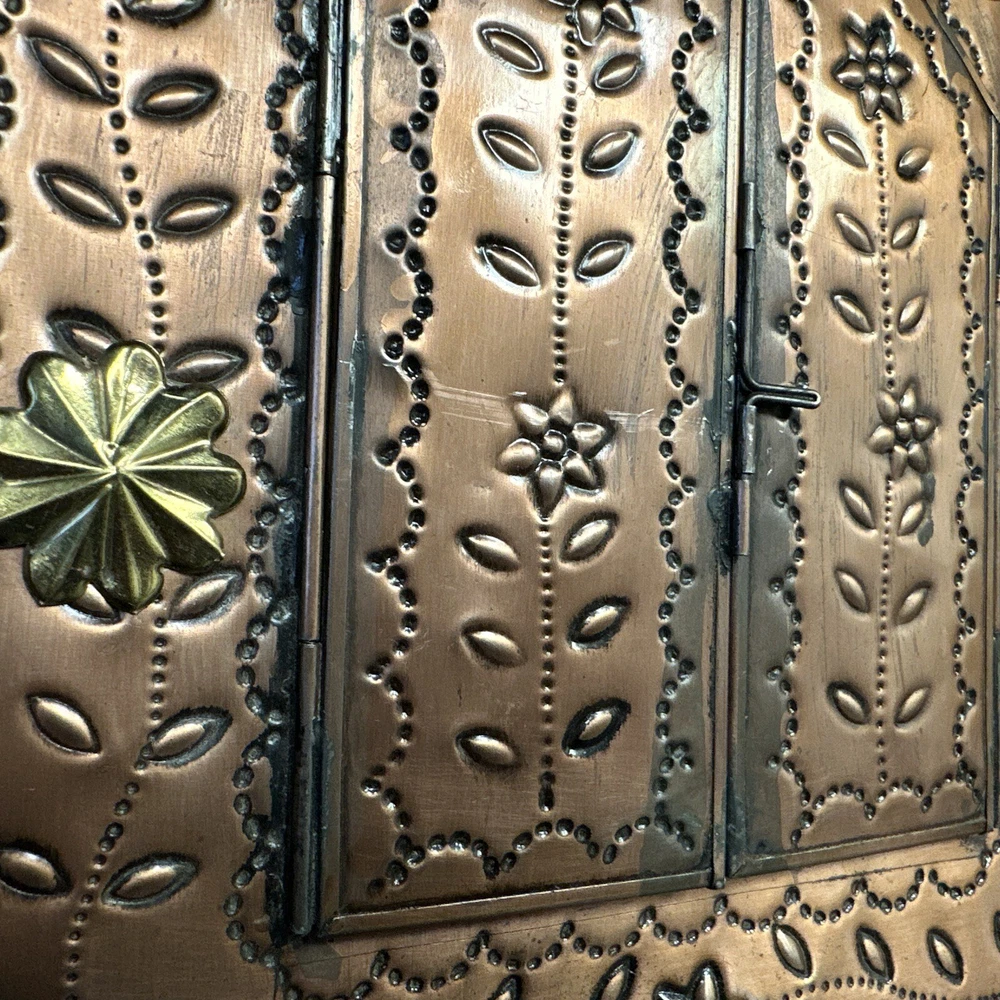 Some wear consistent with age of this piece. Please see photos as I will try to do closeup of any flaws. Have to close the doors at the same time in order to latch it. B102