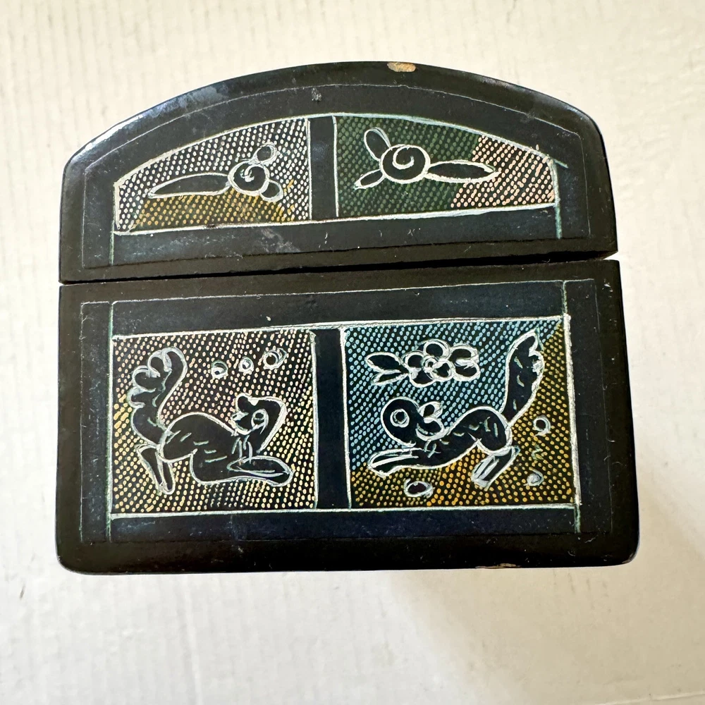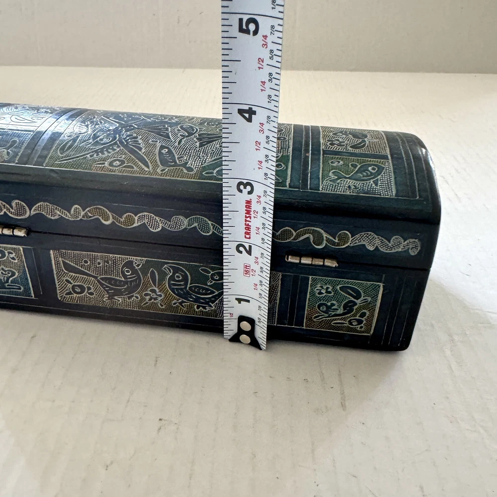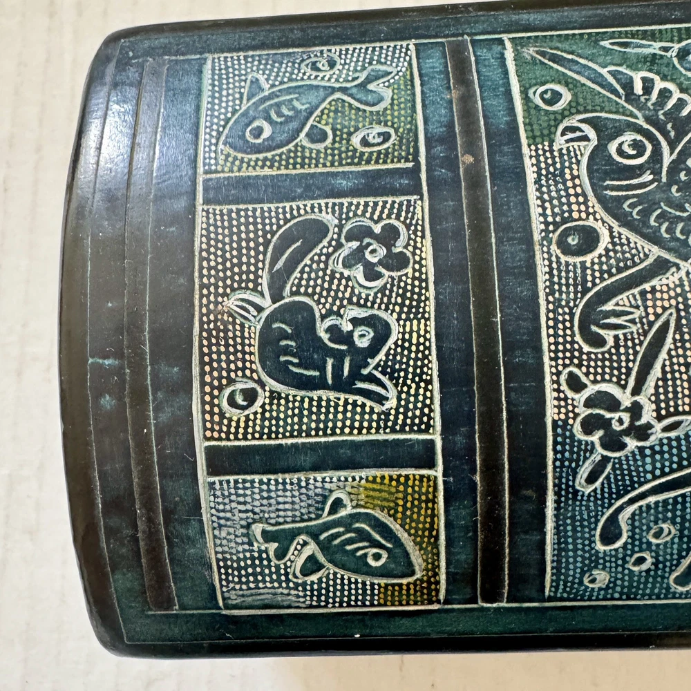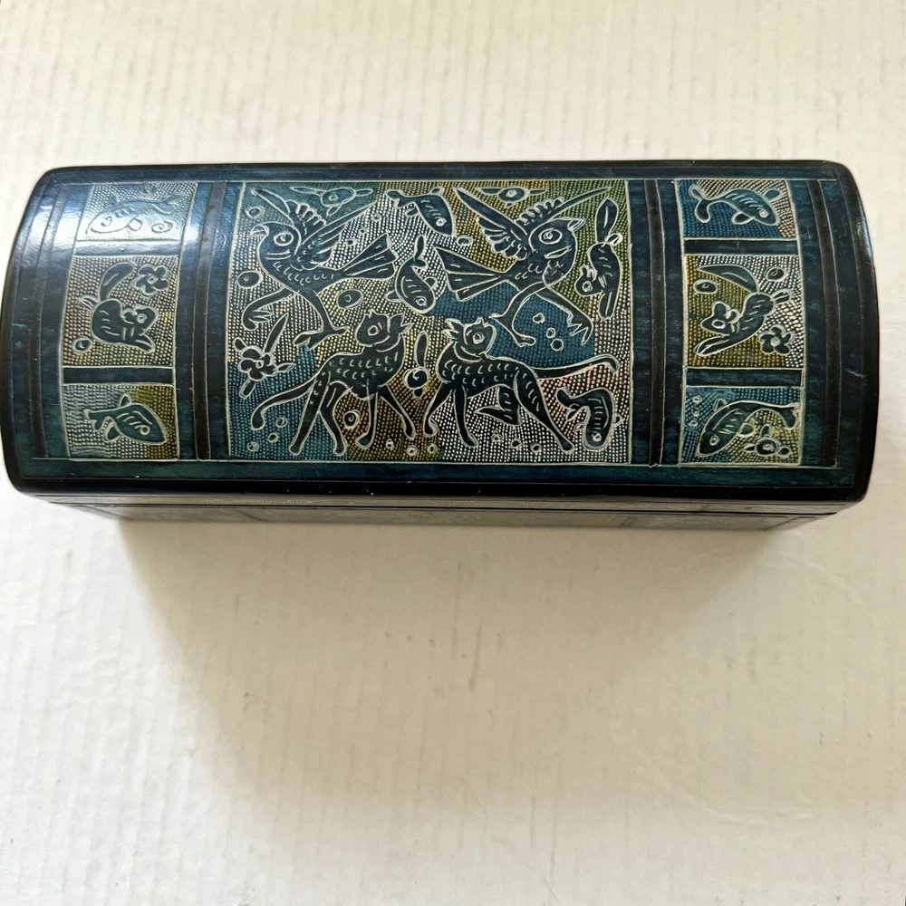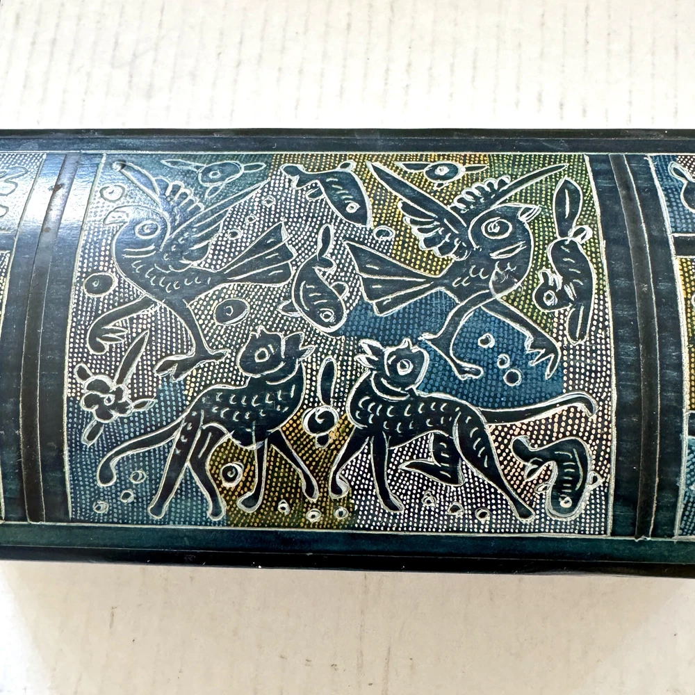 This Mexican Olinala box is a stunning piece of folk art, handcrafted from Linaloe Wood and hand-painted in vibrant colors. The box features intricate designs of green birds and the legendary Chupacabras, making it a unique and wonderful addition to any collection. Chupacabras! It took me awhile to figure that out, but I just sold a wood carved chupacabra from Oxaca, Mexico. There's also parrots and other birds, along with squirrel and fish. The squirrels may be chipmunks!! It's a great box and a great size for storage. It's about 7.5 x 3.25 x 3.25 inches. Important: There are three small spots of missing lacquer as shown in the photos. It would be easy to cosmetically repair these three little spots if you want to. Thank you!