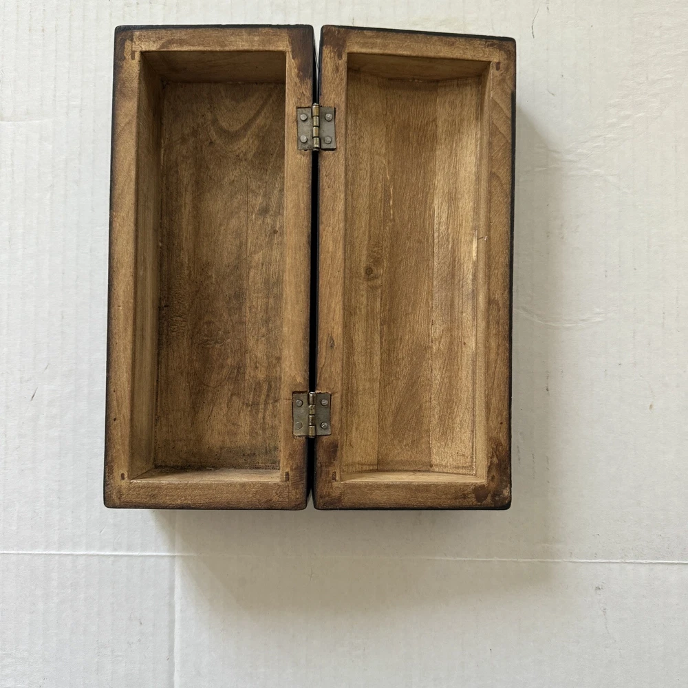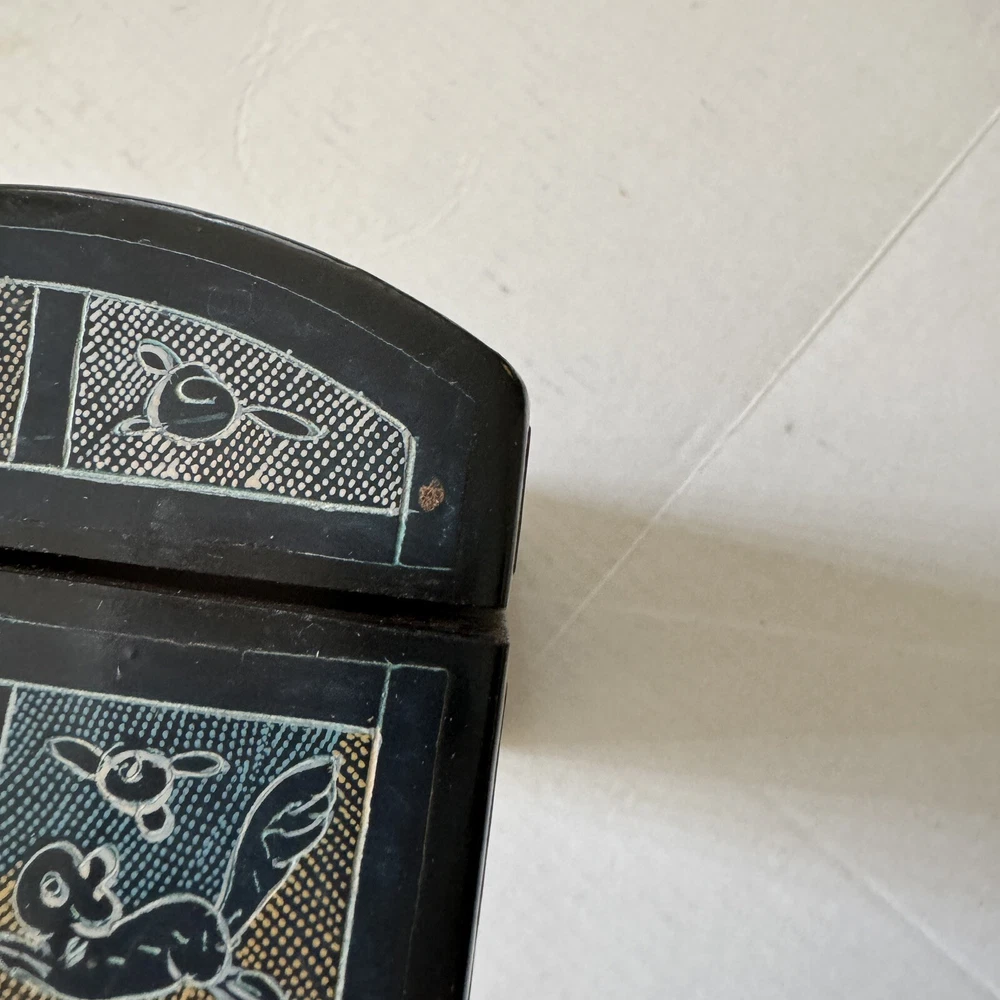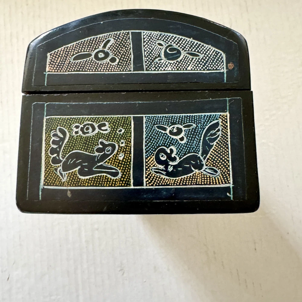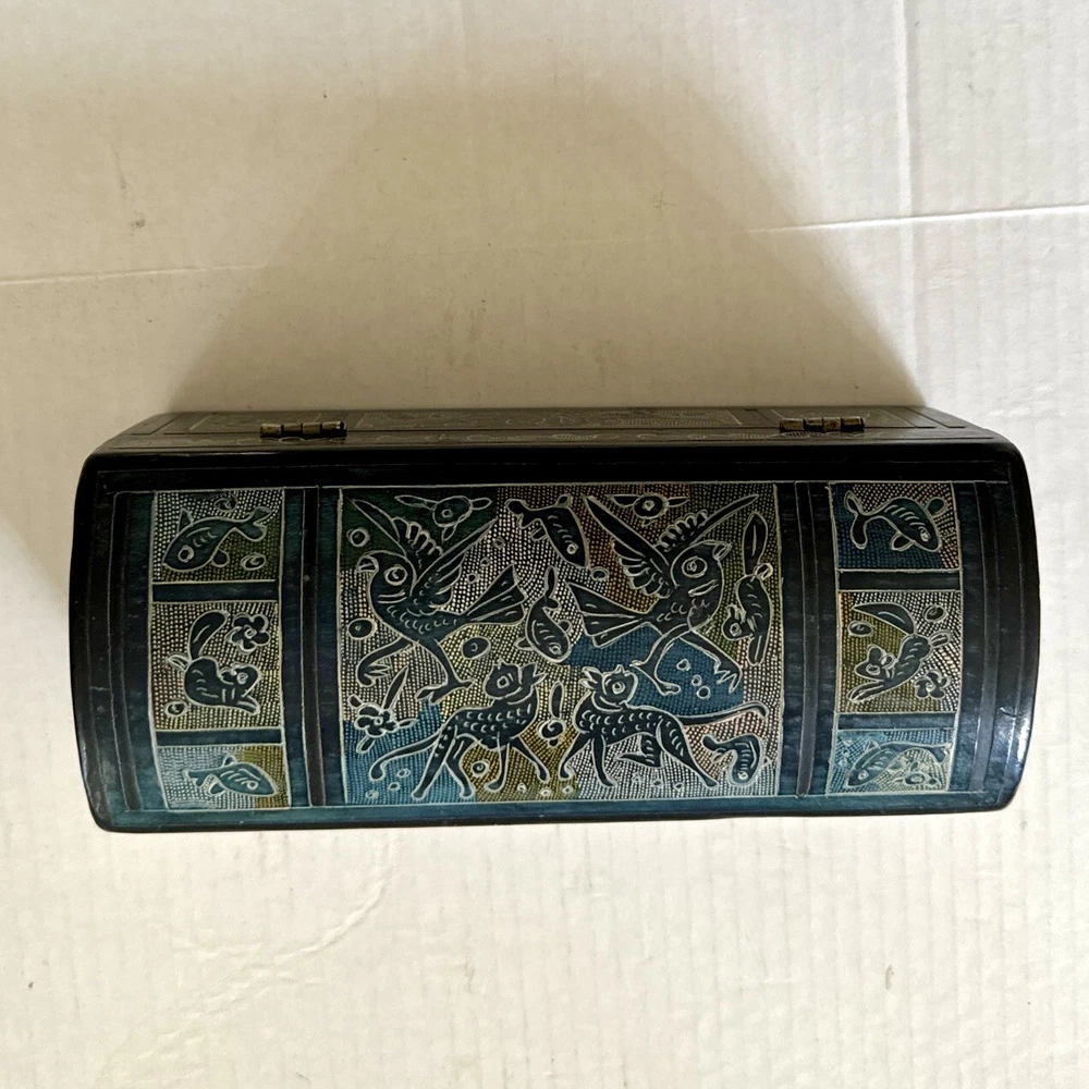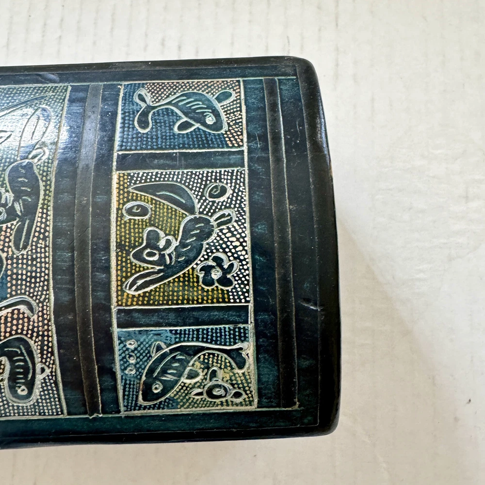 This Mexican Olinala box is a stunning piece of folk art, handcrafted from Linaloe Wood and hand-painted in vibrant colors. The box features intricate designs of green birds and the legendary Chupacabras, making it a unique and wonderful addition to any collection. Chupacabras! It took me awhile to figure that out, but I just sold a wood carved chupacabra from Oxaca, Mexico. There's also parrots and other birds, along with squirrel and fish. The squirrels may be chipmunks!! It's a great box and a great size for storage. It's about 7.5 x 3.25 x 3.25 inches. Important: There are three small spots of missing lacquer as shown in the photos. It would be easy to cosmetically repair these three little spots if you want to. Thank you!