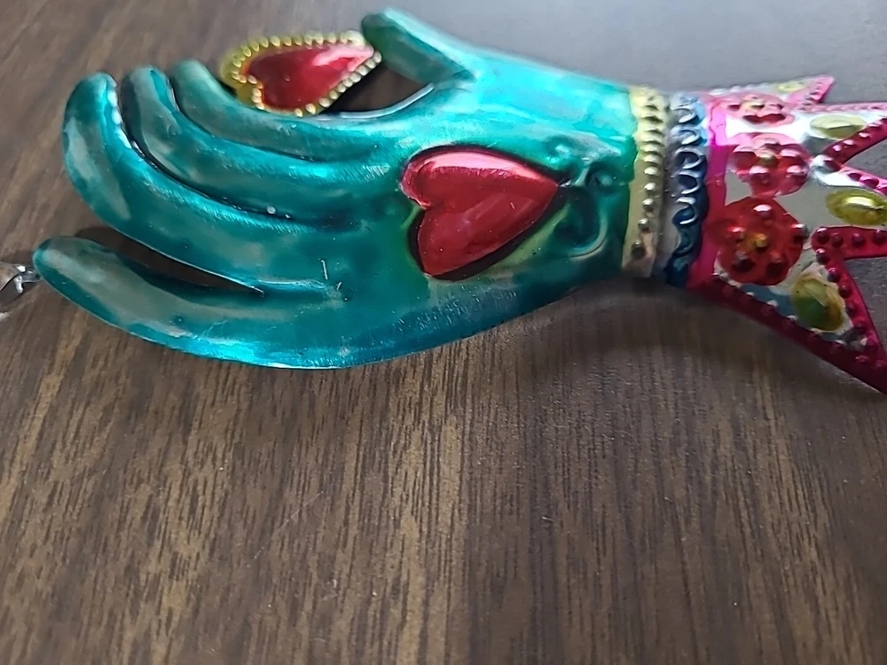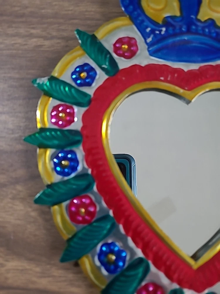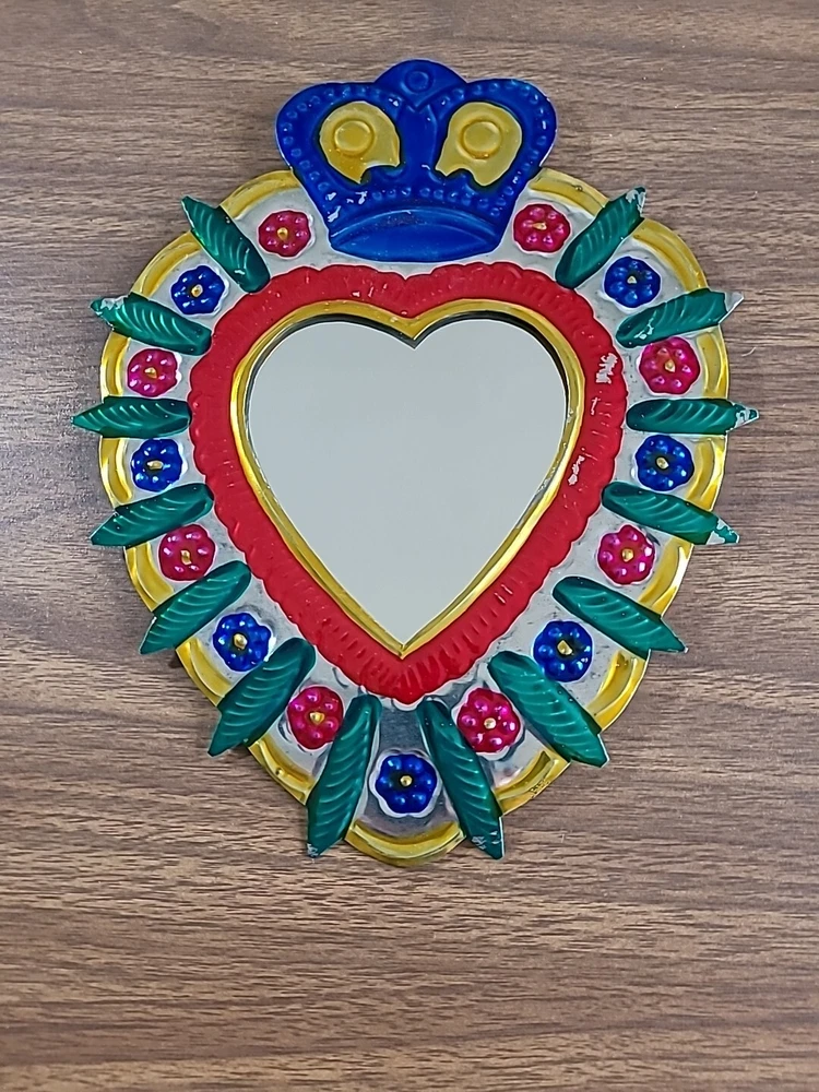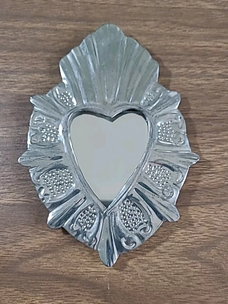 Set includes 2 mirrors - large measuring 8.5" long x 6.5" wide w/some paint loss. The smaller unpainted mirror is 5" tall x 3" wide. And 3 wall decor/ornaments. The heart w/wings measures 4" x 6" wide. Hand is 5" x 2.75" wide. Both have a couple faint scratches. Heart with fire is 4" x 2.25" wide. In very good condition. Please view all photos. Shipping by USPS Ground Advantage