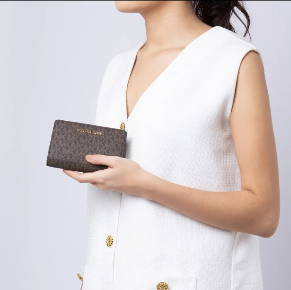 MICHAEL KORS Medium Bifold Zip Coin Credit Card Holder Wallet Signature Brown $258 Color: Brown Retail $258.00 Style: # 35F8GTVF2B Material: Crossgrain Leather. Size: 5.25"L X 3.5"H X 1.25"D Medium Gold-tone hardware.