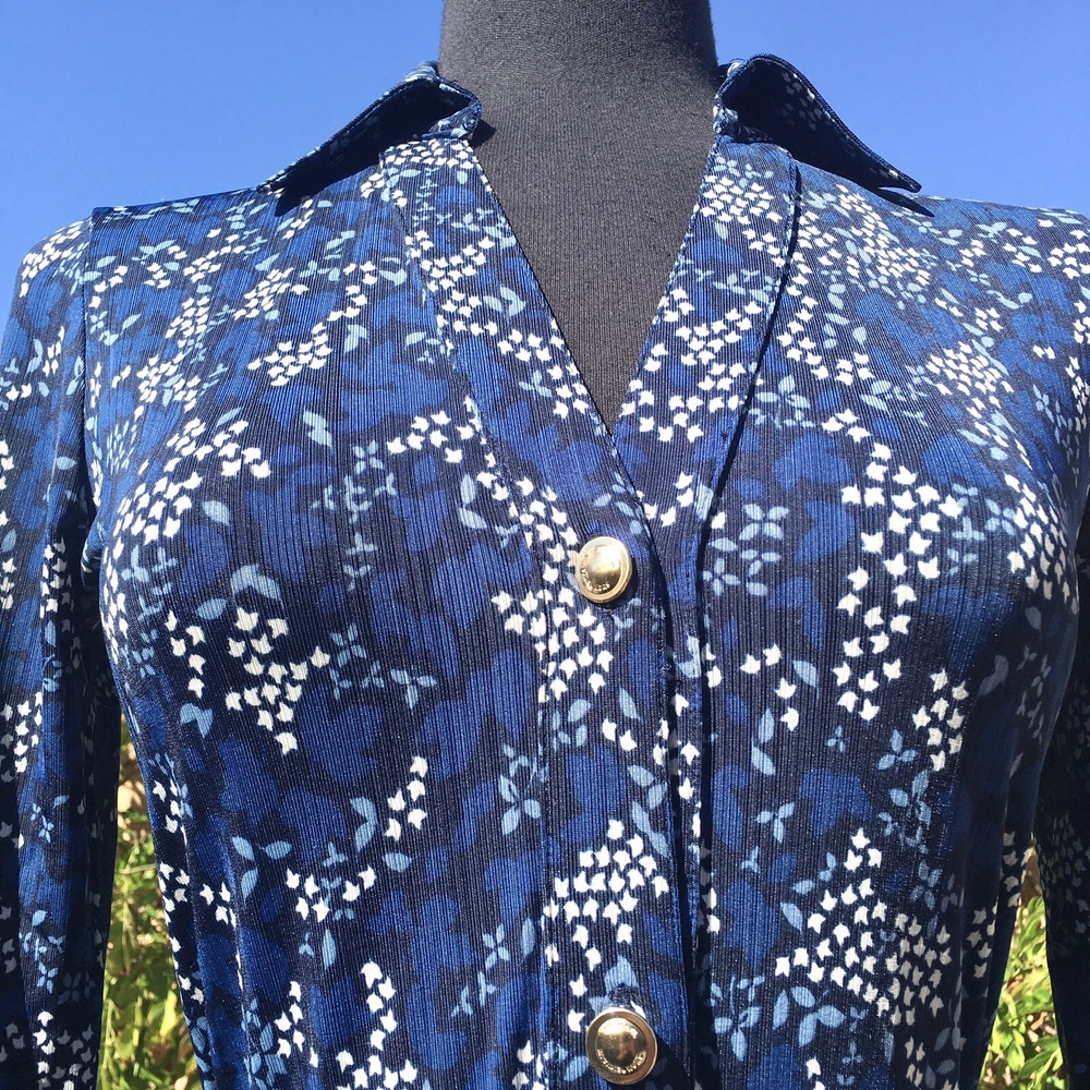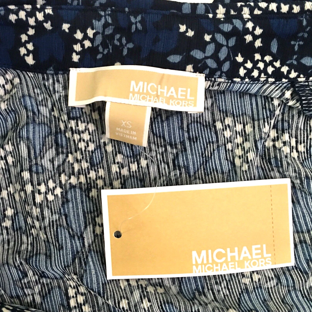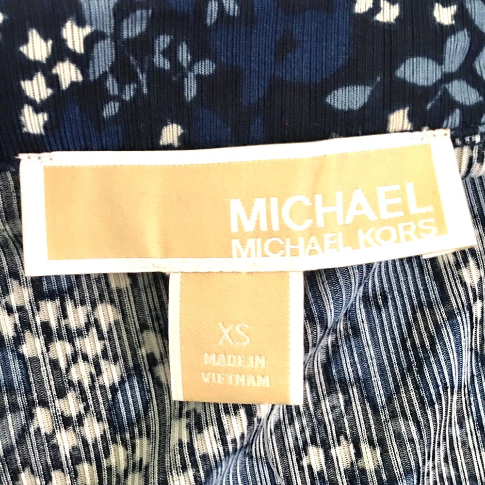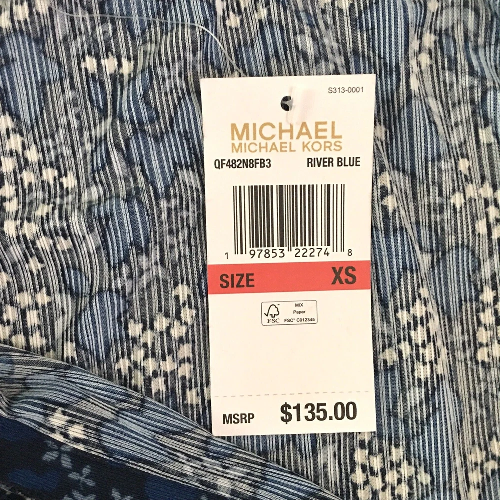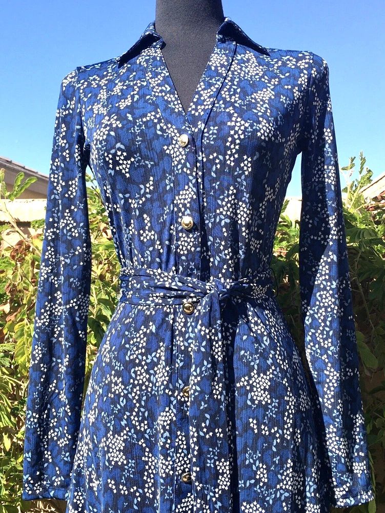 This Michael Kors shirt dress in size XS is perfect for any occasion. The dress features a beautiful blue and white floral pattern that is perfect for summer, fall, and spring. The V-neckline and button closure add a touch of elegance to the dress, while the waist sash and long sleeves make it suitable for both casual and formal events. The dress is made from a soft polyester blend jersey fabric that is machine washable for easy care. It is a collared dress with a fitted long sleeve style, and it comes in a unit quantity of one. The dress is not personalized, vintage, or handmade, and it is suitable for women of all ages. MSRP$135.00