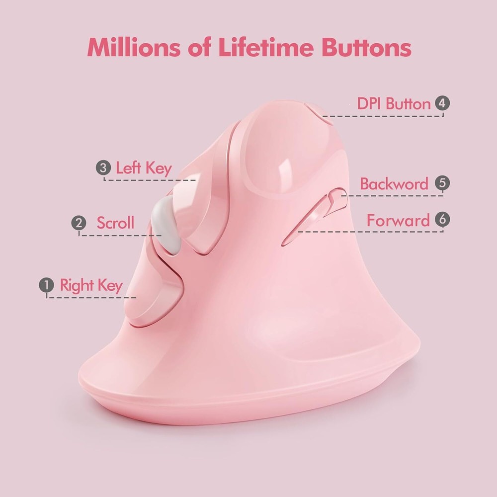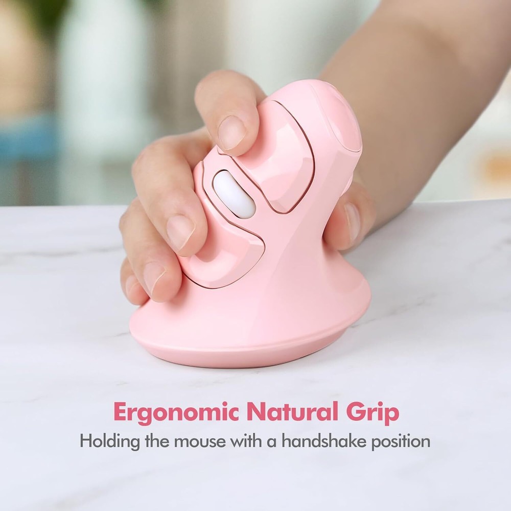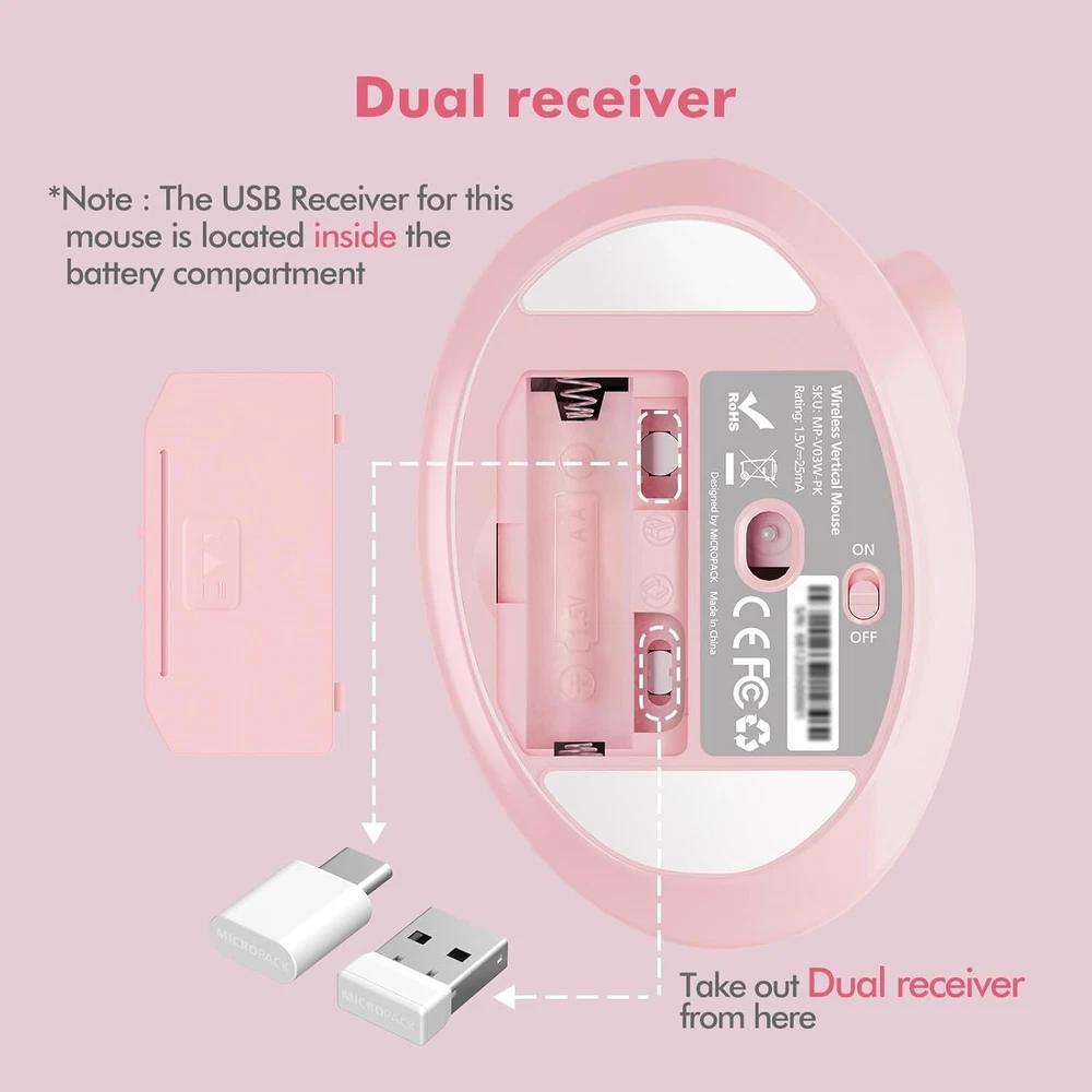 MicroPack Ergonomic Mouse, Vertical Wireless Mouse Pink & Type-C Receiver Product Details Package Dimensions: 4.57 x 3.82 x 3.43 inches Item Weight: 8.4 ounces Manufacturer: MicroPack Country of Origin: China Brand: MICROPACK Digitally Yours Color: Pink & Type-C Receiver Connectivity Technology: Wireless, USB Special Feature: Wireless, Portable, Lightweight, Ergonomic Design, Soundless Movement Detection Technology: Optical 【Unique Vertical & Ergonomic 60º Natural Handshake Posture】Compared to traditional horizontal mice, MicroPack new upgrade mouse with silent clicks is meticulously crafted with vertical shape, adopt an ergonomic design that can naturally adapt to the natural posture of the human palm. It reduces strain and fatigue in the wrist, forearm and arm, helping users maintain a comfortable and healthy working state. 【High Precise Tacking & 3 Adjustable DPI】This comfortable mouse with natural grip achieves high-precision cursor control, providing a smoother mouse operation experience. Multiple adjustable sensitivity settings up to 1600 DPI can adjust the speed and accuracy of the mouse, easily switch DPI with a simple press of the switch, making it ideal for gaming, design work, and other demanding tasks. 【Auto-Sleep Power Saving Mode For Long Battery Life】Thanks to the automatic sleep function, our durable mice with smooth scrolling can automatically enter sleep mode after 60s of staying idle to preserve battery. Only a AA battery needed, it can work up to 8 months. (Battery not included); This reliable WIRELESS MOUSE allow you to get rid of messy cords, providing a more flexible working experience. 【Silent Buttons & Wide Compatibility】MicroPack long lasting grip comfort mouse with USB A & Type-C Receiver is compatible with multiple operating systems, including Windows, Mac OS, Linux, etc. Noise-reducing buttons make it suitable for office, home, gaming, shared workspaces or quiet environments. 【Forward And Backword Button】The dedicated forward and backward buttons offer a convenient and efficient means of navigation. Our user friendly vertical mouse is made of high-quality materials, with excellent durability and reliability, and can work stably for a long time. Please note that the product cannot be programmed.