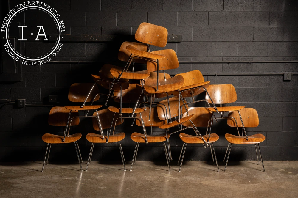 c. 1940s - 1950s; Herman Miller Inc. - Zeeland, MI Nutwood and chrome DCM (Dining Chair Metal) dining chair designed by Charles and Ray Eames in 1946 for Herman Miller. This iconic chair features the classic mid-century look people have come to associate with Eames. It features a molded walnut veneer supported by a polished chrome frame. These chairs all have some measure of damage, including holes through the seats, holes through the back rests, additional supports added, missing feet glide components, as well as other miscellaneous damage. All chairs are sold as is. Listed individually, but please contact us to buy the full set (15). 20.5" W x 20.5" D x 29.5" H Seat: 17" H Please refer to photos regarding condition. For more info regarding delivery of your order, please review our shipping Terms and Conditions. MM - 6626 - 121423 TERMS & CONDITIONS PARCEL SHIPPING We offer free shipping to the continental US on smaller items. All parcel packages are fully insured and shipped through USPS or UPS. FREIGHT SHIPPING NOTE: All shipments are considered Free on Board (FOB), meaning the buyer assumes all responsibility for the shipment the moment it leaves our loading dock. Any damages or loss that may occur after this point are the buyer's responsibility. In the event of damage or loss, we are happy to assist buyers in the claims process if we helped coordinate the shipment. However, we are not responsible for any damages, loss, or deductibles. Free freight shipping to a terminal is available for most large items (some terms apply). Free shipping is only offered to orders in the continental US. Our shop also works with a number of private drivers, and we are happy to assist buyers in finding private shipping for their order if desired. Please reach out to us for more information about your shipping options. A 2 - 4 week period is to be expected for freight delivery. Packaging your freight safely and contracting with the most valuable broker is our highest priority in order to save you money and time. Please provide a phone number for our shipping carriers to contact you regarding delivery or pickup. This is required after purchase. INTERNATIONAL CUSTOMERS Due to the high value of some of our items, many items shipped internationally cannot always be insured for their full value. In these cases, we will insure them to the full extent available, but will not be responsible for additional damages above the available insured amount. International items are shipped via USPS or UPS; please become familiar with the insurance policy associated with your country. BUYERS ARE RESPONSIBLE FOR ANY DUTIES AND TAXES THAT MAY APPLY. OTHER Our items may contain rust, dust, grease, or grit. All of our pieces are reclaimed from industrial environments where they may have been exposed to years of use and weathering. As such, each piece has character. Industrial Artifacts cannot be held responsible for matters of taste regarding the character of a piece. Bulbs for light fixtures are not included unless specified. Returns: Returns are not accepted. Refunds: A 10% restocking fee will be applied to refunded purchases wherein the buyer no longer wishes to complete the transaction. Please refer to photos regarding condition. For more info regarding delivery of your order, please review our shipping Terms and Conditions. MM - 6626 - 121423 TERMS & CONDITIONS PARCEL SHIPPING We offer free shipping to the continental US on smaller items. All parcel packages are fully insured and shipped through USPS or UPS. FREIGHT SHIPPING NOTE: All shipments are considered Free on Board (FOB), meaning the buyer assumes all responsibility for the shipment the moment it leaves our loading dock. Any damages or loss that may occur after this point are the buyer's responsibility. In the event of damage or loss, we are happy to assist buyers in the claims process if we helped coordinate the shipment. However, we are not responsible for any damages, loss, or deductibles. Free freight shipping to a terminal is available for most large items (some terms apply). Free shipping is only offered to orders in the continental US. Our shop also works with a number of private drivers, and we are happy to assist buyers in finding private shipping for their order if desired. Please reach out to us for more information about your shipping options. A 2 - 4 week period is to be expected for freight delivery. Packaging your freight safely and contracting with the most valuable broker is our highest priority in order to save you money and time. Please provide a phone number for our shipping carriers to contact you regarding delivery or pickup. This is required after purchase. INTERNATIONAL CUSTOMERS Due to the high value of some of our items, many items shipped internationally cannot always be insured for their full value. In these cases, we will insure them to the full extent available, but will not be responsible for additional damages above the available insured amount. International items are shipped via USPS or UPS; please become familiar with the insurance policy associated with your country. BUYERS ARE RESPONSIBLE FOR ANY DUTIES AND TAXES THAT MAY APPLY. OTHER Our items may contain rust, dust, grease, or grit. All of our pieces are reclaimed from industrial environments where they may have been exposed to years of use and weathering. As such, each piece has character. Industrial Artifacts cannot be held responsible for matters of taste regarding the character of a piece. Bulbs for light fixtures are not included unless specified. Returns: Returns are not accepted. Refunds: A 10% restocking fee will be applied to refunded purchases wherein the buyer no longer wishes to complete the transaction.