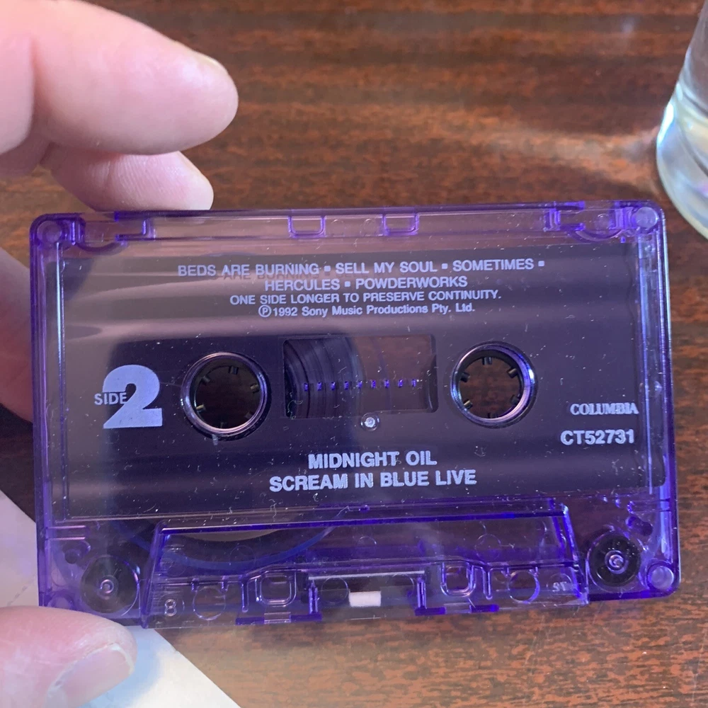 Midnight Oil - Scream in Blue Live (cassette tape, 1992) Sony Music, Australian, CT52731 Columbia Records. The purple cassette is really cool.