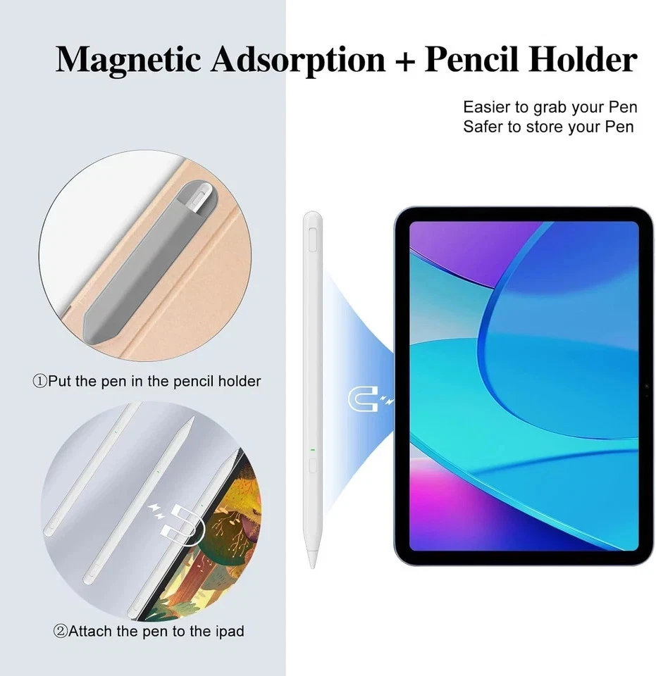 Color White Brand Milikilo Material Aluminum Number of Batteries 1 Lithium Ion batteries required. (included) Item Weight 0.42 Ounces Battery Average Life Standby 365 days Compatible Devices iPad & iPad Pro(2018 -2025), iPad Air 3rd/4th/5th/M2/M3 Gen, iPad Mini 5th/6th Gen, iPad (6th/7th/8th/9th/10th/11th Gen), iPad Pro (11"/12.9"/M4) iPad & iPad Pro(2018 -2025), iPad Air 3rd/4th/5th/M2/M3 Gen, iPad Mini 5th/6th Gen, iPad (6th/7th/8th/9th/10th/11th Gen), iPad Pro (11"/12.9"/M4) Item dimensions L x W x H 6.53 x 0.39 x 0.39 inches Are Batteries Included Yes Batteries Required? Yes See less About this item 【Smooth&Perfectly Precision】The iPad stylus pen is equipped with a 0.9mm upgraded POM tip, which makes it more sensitive and precise. No lagging, no skips, no scratches, giving you a better experience like a real pencil. the tilt technology makes your writing and drawing more freedom than ever. 【Pencil Holder&One-piece Dust Plug Design】Comes with a pencil holder,Strong adhesive keeps the pencil holder securely in place,holds your pen more securely, allowing you to grab or store the pen quickly and easily.The improved version of the 2025 Apple Pen solves the trouble that the old split dust plug is easy to lose after taking off, and the innovation is improved to the one-piece dust plug. When you need to charge the pen, first remove the one-piece dust plug on the charging hole, insert the charging interface and charge at ease, and you don't have to worry about the small dust plug being lost. 【Palm Rejection&Tilt Sensitivity】- Stylus for iPad pencil 10th generations palm rejection design can free your hands, You can easily use your hands on the screen.Stylus for iPad pencil 10th generations utilizes the latest tilt technology, Tilt function enables you to paint different stroke of thickness and depth by varying stylus pen for iPad tip dip, perfect for drawing or writing on iPad. 【Fast Type C Charging Port & LED Indicators】Compatible with Apple pencil 2nd generation can be fully charged in 40minutes and provides up to 10hours of working time.The iPad pencil also has an LED indicator,green light is on when starting and using, the red light is steady on when charging, and the red light is off when fully charged.And there is no use of the automatic shutdown function within1hour, saving power. 【Easy to Use Stylus Pen&Ideal Gift】- Without any APP required.Single press the button of the stylus to turn on/off easily without connecting via Bluetooth. Only weights 0.42ounce even little kids can use it perfectly! so this apple pen is perfect gifts for children at home learning, drawing, writing, and taking notes. A very good alternative to the more expensive Apple pencil. It is also the Best gift for Christmas, Thanksgiving, Valentine's Day,Mother's Day,Father's Day to your family and friends. 【Compatible with 2018-2025 iPad】Stylus for New 2025 iPad Air 11-inch & 13-inch(M3/M2),iPad Pro 11&13-inch (M4),Pencil for iPad 11th/10th/9th/8th/7th/6th Gen, iPad Air 3rd/4th/5th Gen, iPad Pro 11 inches,iPad Pro12.9 inches 3rd/4th/5th/6th Gen,iPad Mini 5th/6th Gen. For models that do not support charging, we have equipped with a Type cable: ⭕❌Not work for iPad mini7th, iPad pro 1st&2nd, iPad pro 10.5", iPad pro9.7", Earlier versions for iPad, iPhone, Android, Microsoft device.
