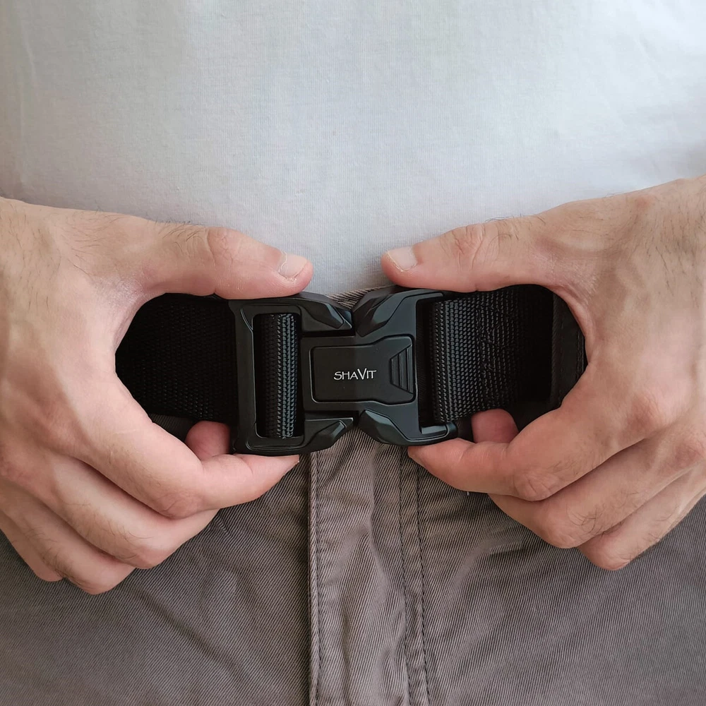 SHAVIT's Tactical Belt Military Style Belt Heavy-Duty Police Utility Nylon Rigger Belt with Quick-Release Metal Buckle Belt for Men Black HEAVY-DUTY BUCKLE: made of heavy-duty zinc alloy, strong and durable QUICK RELEASE DESIGN: a simple push on the golden tabs and the buckle is released. Easy to operate and convenient to carry How to Wear - 1.Remove the buckle from the webbing. 2. Get the webbing through you belt loops. 3. Adjust it to your perfect size. Total Length 125cm/49 inch Fits Waist 33"-43" KT Deals Military Tactical Belt is not only Army fans’ favorite, but also the outdoor sports and field training friends’ good partnersand can the belt prior to a camping trip . This belt is the best choice for you Quick Release - The metal quick-release buckle makes fastening and releasing the belt extremely convenient and quick. No Holes - No holes on the belt, the tactical belt is full adjustable to a certain waist size. Heavy Duty - The tactical belt is with a metal alloy buckle, it can bear a large pulling force. Belt Size: Belt Width: 3.8cm / 1.5in Belt Length: 125cm / 49in in this tactical style belt comfortably fits up to a 43” waist.