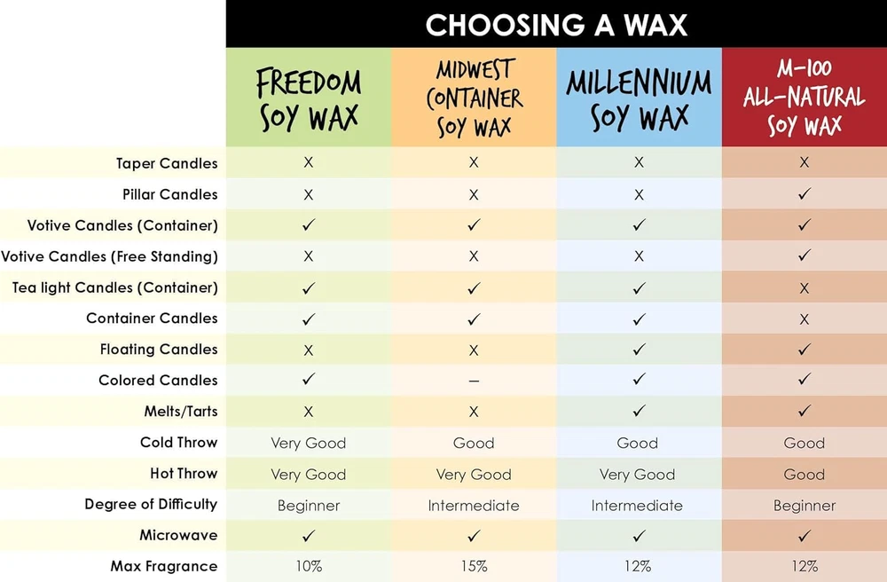 eBay NATURAL SOY WAX BEADS - Best candle making supplies make the best soy candles! These safe, ethically produced, microwavable and paraffin-free soy wax beads are smooth and creamy in appearance, perfect for container candles, tealights and melts. IMPROVED COLOR RETENTION - This soy wax is designed to retain color better, reducing frosting and resulting in a more visually appealing candle. It's an excellent choice for creating vibrant, colored candles by mixing in candle dye. ADVANCED DIY CANDLE MAKING - While still hassle-free and a favorite of many, this soy wax for candle making requires some patience to learn to use. However, it results in exquisite candles with a warm, aggressive burn and tremendous fragrance throw. PERFECT CANDLE CREATIONS - Our premium soy wax beads ensure smooth tops and consistent scent in every candle. Ideal for DIY candle making, these beads mix well with scents, dyes, and wicks, perfect for scented soy candles and wax melts. SAFE AND ECO-FRIENDLY - Made from soybeans grown in America’s Midwest, paraffin-free and beeswax-free, our candle making wax beads are sustainable and ethically produced. With a melting point of 127-131°F, this wax is safe to handle and burn. Product Description Experience Better Candlemaking Set yourself free from the difficulties of soy candle making with American Soy Organics’ special FREEDOM SOY WAX recipe. It’s Soy Candles Made Easy! Easy to Use! Microwavable Heat and Pour! All-Natural Wax Non-toxic, Renewable, Mindful production. Bead form makes it very easy to use and store. Variety! Multiple blends of proprietary recipes to offer the perfect wax for whatever your needs: jar candles, pillars, wax melts, tealights and more! Made in the USA. Midwest grown soybeans, renewable, ethically sourced. Add to Cart Add to Cart Add to Cart Add to Cart Add to Cart Add to Cart Customer Reviews 4.6 out of 5 stars 264 4.7 out of 5 stars 5,450 4.7 out of 5 stars 4,539 4.6 out of 5 stars 2,133 4.6 out of 5 stars 462 4.6 out of 5 stars 257 Price $22.95 $ 22 . 95 $22.95 $ 22 . 95 $22.95 $ 22 . 95 $22.95 $ 22 . 95 $25.95 $ 25 . 95 $23.95 $ 23 . 95 Pillar Candles (freestanding) ✓ Votive Candles (container) ✓ ✓ ✓ ✓ ✓ Tea Light Candles ✓ ✓ ✓ ✓ Container Candles ✓ ✓ ✓ ✓ ✓ Floating Candles ✓ Colored Candles ✓ ✓ ✓ ✓ ✓ ✓ Melts/Tarts ✓ Cold Throw Very Good Very Good Good Good Good Hot Throw Very Good Very Good Very Good Very Good Good Degree of Dificulty Beginner Beginner Intermediate Intermediate Intermediate Beginner