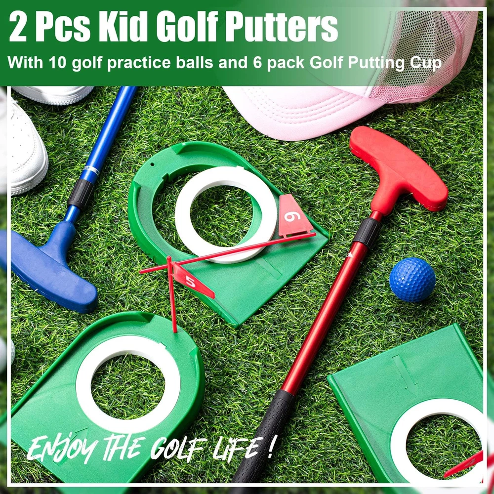 Mini Golf Putting Set Include 2 Golf Putter Adjustable Length 2 Way for Right or Left Handed Golfers 10 Practice Balls 6 Putting Cup with Flags for Kids Indoor Gift Office Tournament Comprehensive Package: our package includes 2 golf putters, red and blue, 10 golf practice balls in 5 colors, white, red, blue, green, and orange, 2 for each color; And 6 golf putting cups with red flags and numbers; This comprehensive package allows players to establish varied and effective practice routines indoors or outdoors Ideal Sizes: the golf clubs can be adjusted between 20.87-36.61 inches, adjustable and flexible, making it ideal for players of different heights, you can teach your children how to play golf and enjoy parents and child time; The diameter of the golf practice balls is about 1.65 inches/ 42 mm, suitable for both beginners and experts Adjustable and Versatile: featuring a 2 way design, our golf set for backyard caters to both left handed and right handed players, beginners or experts, children or adults; The putter's flexibility enhances comfort and usability, making it a versatile tool for golf enthusiasts Variety of Scenarios: the kids golf set is lightweight and portable, making it ideal for carrying around and using in both indoor and outdoor practice sessions, you can take it to golf clubs or golf courses, or you can use it at your backyards, courtyards or even mini office tournament supplies Easy Installation: our golf equipment can be installed quickly on various carpeted surfaces or putting greens, enabling players to practice effectively; All you have to do is place the putting cups at different distances and locations for diverse practice routines Features: Reliable material: The adjustable golf club is made of a sturdy combination of aluminum and plastic that ensures longevity and performance. The golf balls are crafted from PU and the plastic golf putting cup is tough and reliable, ensuring long term use. Vibrant color design: Our golf practice balls come in a variety of colors: white, red, blue, green, and orange. These lively colors not only add aesthetic appeal but also assist players in locating their golf balls with ease. Specifications: Material: Golf putter: aluminum and plastic Golf practice balls: PU Golf putting cup: plastic Color: White red blue green orange Size: Golf putter: about 20.87-36.61 inches/ 53-93 cm, adjustable Golf practice balls: about 1.65 inches/ 42 mm in diameter Package includes: 2 x Golf putter 10 x Golf practice balls 6 x Golf putting cup with flag and number Notes: Manual measurement, please allow slight errors on size. The color may exist a slight difference due to different screen displays. Shipping We offer FREE shipping on all orders! We ship within Three business days of payment, usually sooner. We use a selection of shipping services such as UPS, FedEx, USPS etc. We only ship to the lower 48 states, no APO/FPO addresses or PO Boxes allowed. Local pickups and combined shipping options are not provided at this time. Return You can return a product for up to 30 days from the date you purchased it. Any product you return must be in the same condition you received it and in the original packaging. Please keep the receipt. Payment We accept payment by any of the following methods: PayPal Please pay as soon as possible after winning an auction, as that will allow us to post your item to you sooner! Feedback Customer satisfaction is very important to us. If you have any problem with your order, please contact us and we will do our best to make you satisfied. Contact Us If you have any queries, please contact us via ebay. We usually respond within 24 hours on weekdays. Please visit our eBay store to check out other items for sale! Thank you for shopping at our store.