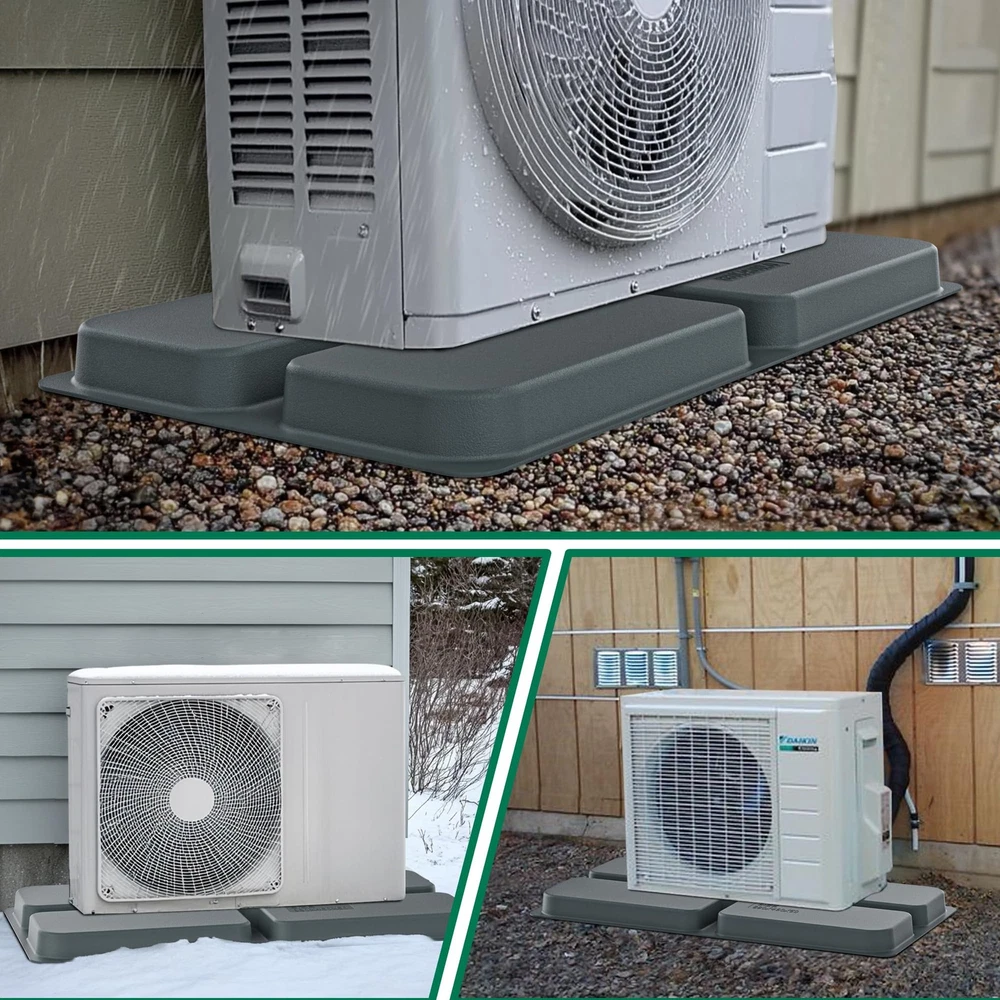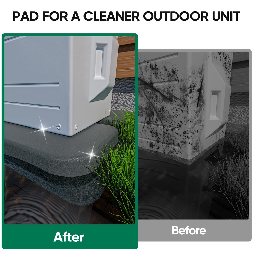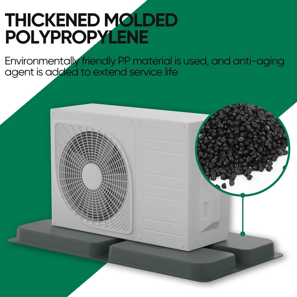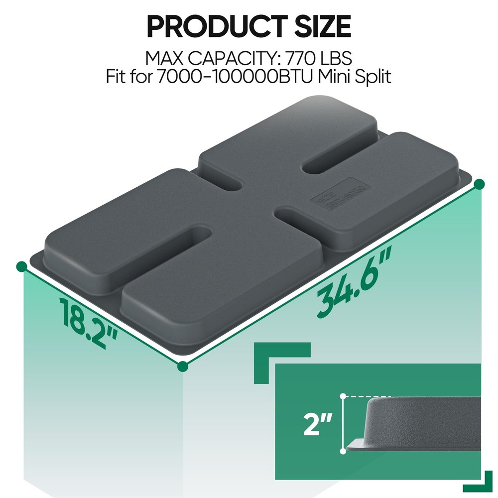 The mini split condenser pad provides a leveled surface above ground, reducing moisture exposure and preventing cracks. Its cross-hatch design evenly distributes weight, avoiding sagging or deformation. Recessed grooves allow for expansion bolt installation, ensuring stable placement. Measuring 34.6 x 18.1 x 2 inches, it fits most mini split units (7000-100,000 BTU). Made from eco-friendly PP material, it resists pressure, corrosion, and aging, lasting up to 8-10 years. Drillable for secure installation on flat surfaces, it supports up to 740 lbs Strong Equipment Pad: The mini split pad provides a leveled surface above ground, reducing moisture exposure. This air conditioner pads for outside has a unique styling design construction that prevents cracks and offers superior load-bearing capacity Special Design: The mini split condenser pad features a cross-hatch pattern on the surface to distribute weight evenly, preventing sagging or deformation. Recessed grooves of the pad allow for the installation of expansion bolts, ensuring stable placement Universal Size: Measuring 34.6 x 18.1 x 2 inches, this equipment pad is the perfect base for mini split condensers and air conditioner heat pump systems. Ideal for supporting mini split condenser units, this condenser pad ensures stable installation Lightweight and Durability: The condenser pad is made from eco-friendly PP material, offering pressure resistance, anti-corrosion, and anti-aging properties. New materials further extend its lifespan up to 8-10 years, ensuring long-lasting performance Considerate Notice: The mini split pad is drillable for securing the mini split ac/heating system and should be placed on flat soil or a hard surface. Suitable for AC units (7000-100,000 BTU) and offers a maximum loading capacity of up to 740 lbs