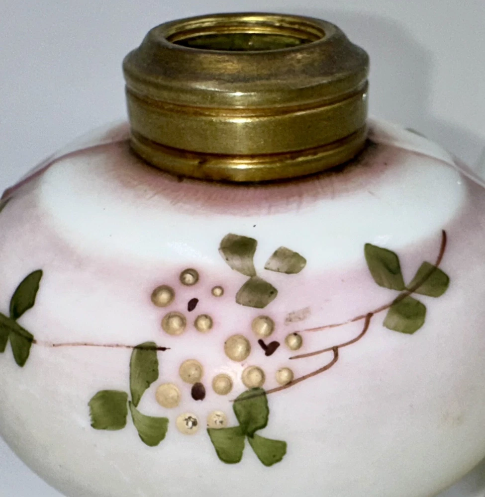 Antique miniature oil / kerosene table or bedside lamp Opal glass with a satin finish and enameled floral motif - very pretty! Clear glass chimney included Antique burner included with working wick Very nice antique condition with no chips or cracks - ready to use Approximate measurements ( may vary slightly ): 9 1/4" high to top of shade 4 3/8" high to top of brass collar 3" diameter base Please look closely at the pictures; they are part of the description. We are describing what we see but you are the expert. If described as VINTAGE or ANTIQUE, it should never be expected to look like new. Color or image quality displayed on your device may not be exactly as the item appears in person, but we do not alter our pictures. SHIPPING - Please Read: Our items are typically shipped UPS with prices fixed by the carrier. We have added the USPS option in the case of shipping to a P.O. Box. The selling platform retains a percentage of our shipping fees so not all of what you pay actually comes to us. Shipping charges outside the U.S. are not set by us since we use ONLY the eBay International Shipping Program for that. We are not able to invoice you or offer shipping discounts for international sales. Please consider that you are easily able to browse our listings to purchase items that cost us time (hours at auctions and "clean-up" time) and money (travel, shipping supplies, etc.) to present to you. Please contact us with any serious concerns before posting low feedback or star ratings. We will do our best to respond promptly. 1 4E 25 Track Page Views With Auctiva's Counter