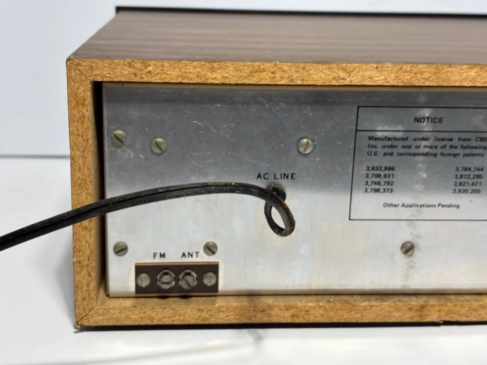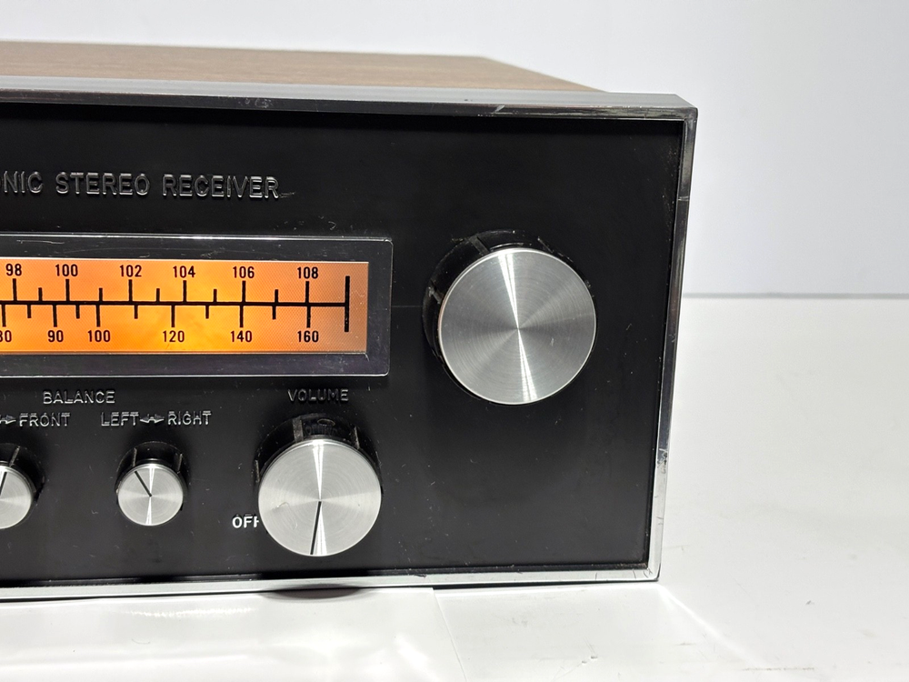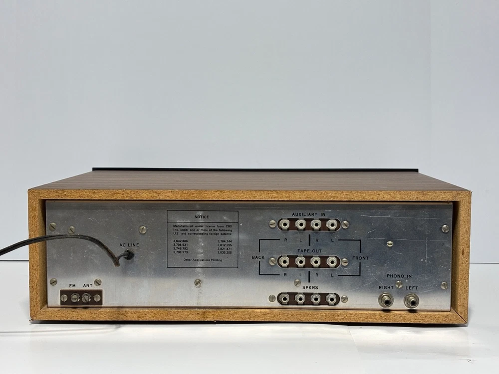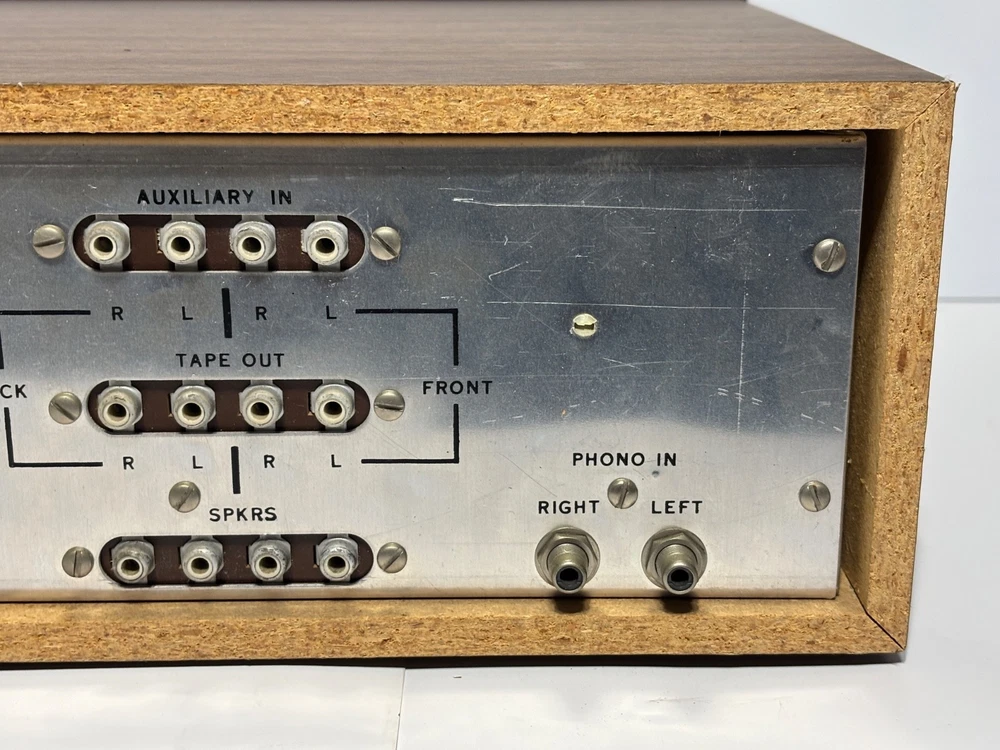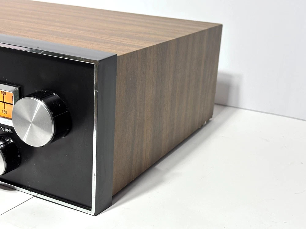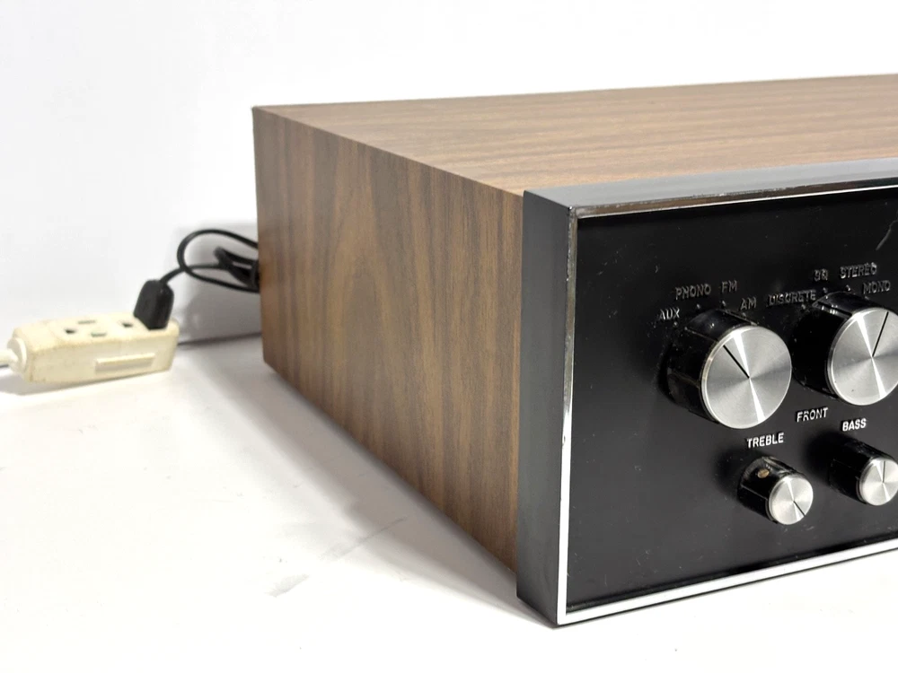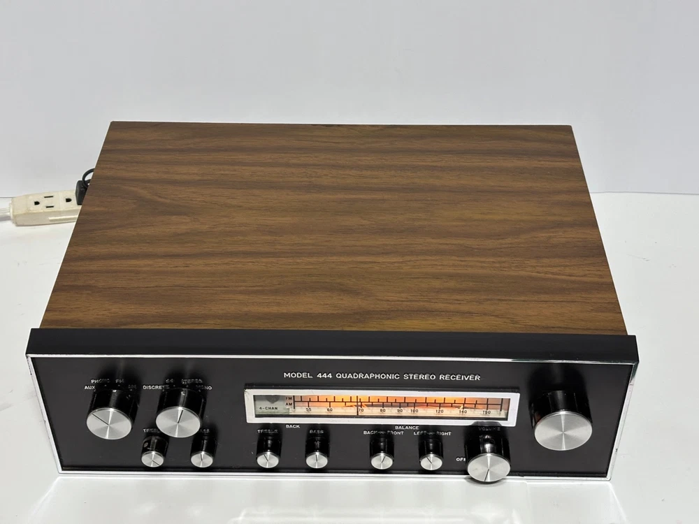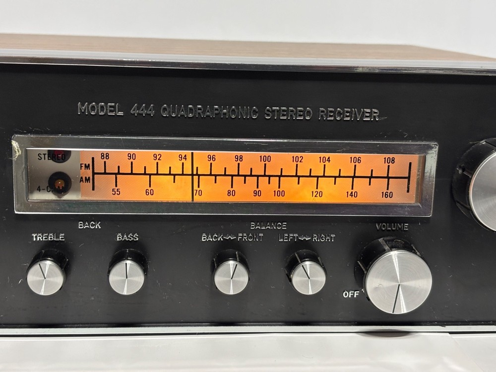 Excellent overall cosmetic condition with minor wear consistent with age. The tuning dial lights up beautifully, and all knobs and switches are intact. Tested for power and basic functionality — receives FM stations clearly and produces clean sound. Not all inputs have been fully tested. Description: A true retro gem from the quadraphonic era, the Model 444 delivers vintage stereo warmth and charm. With its beautiful illuminated analog tuner, woodgrain cabinet, and chrome knobs, it’s a perfect piece for any vintage audio setup or collector’s shelf. Features: 4-channel (quadraphonic) receiver Inputs for Phono, AUX, Tape, and AM/FM Separate front/back and left/right balance controls Treble and bass adjustment for both front and rear channels Illuminated analog tuning dial Classic simulated woodgrain cabinet Condition Notes: Faceplate and knobs are in great shape Tuning dial light fully functional Back panel connections clean and intact What’s Included: Model 444 Quadraphonic Stereo Receiver (as pictured) Power cord (attached) Shipping: Carefully packed with foam and double-boxed for safe transport. Ships fast via UPS or FedEx Ground.