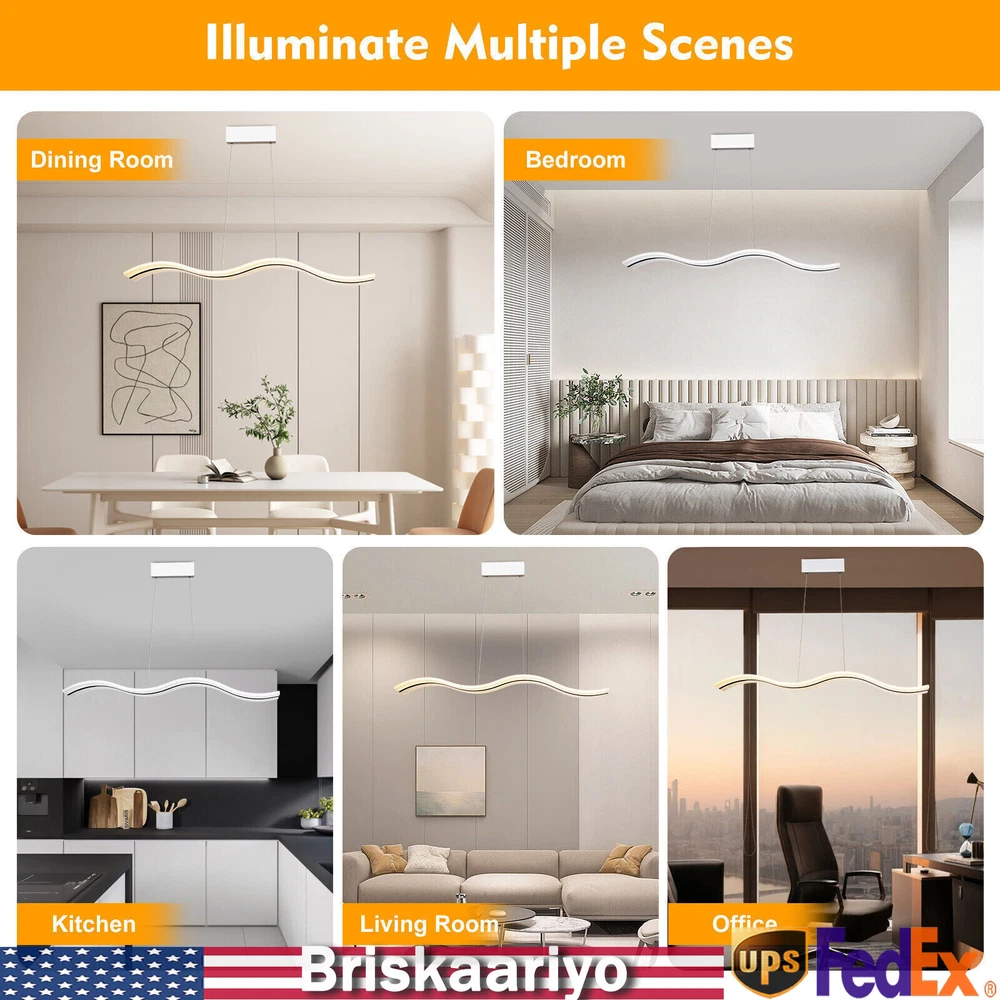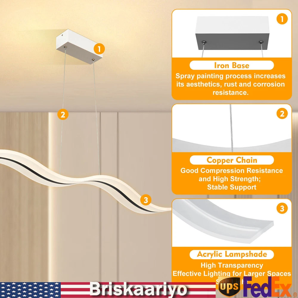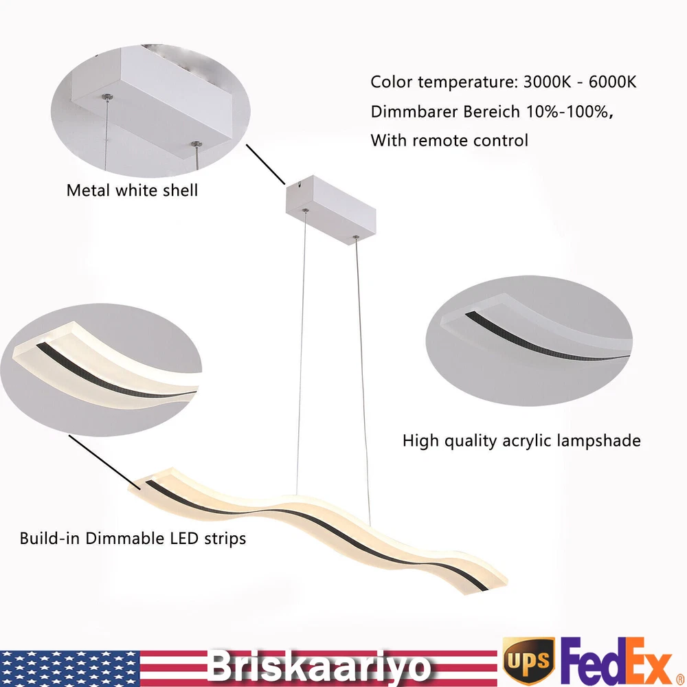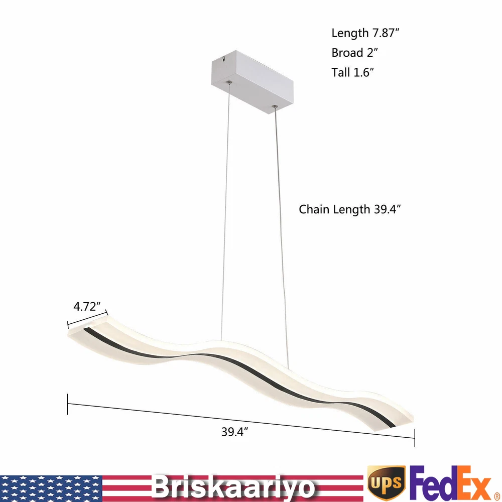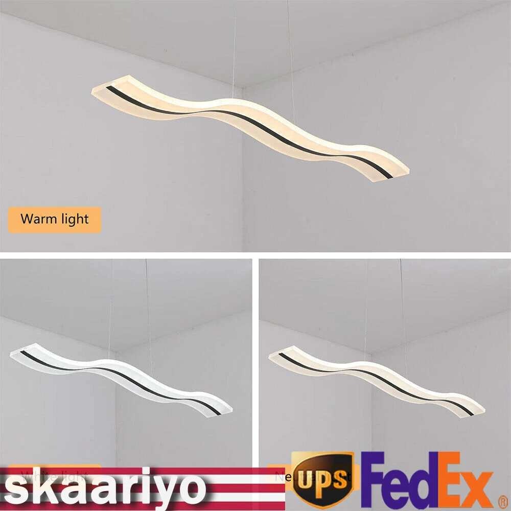 Specification Material: Acrylic Color: White Light Type: LED (Included) Light Color: Warm White, Neutral White, Cold White Color Temperature Adjustment Range: 3000-6500K Power: 36w Voltage: 110-240v, 50/60Hz Lighting Range: 6-10 ㎡/64.5-107.6ft2 Package Size: 102*23.75*12.35cm/40.2*9.3*4.9in Board Size: 20*8*6cm/7.87*2*1.6in Chain Length: 100cm/39.4in Light Size(L*W): 100*12cm/39.4*4.72in Gross Weight: 4kg/8.8lbs Net Weight: 3.5kg/7.7lbs Package Included 1*LED Pendant Light 1*Remote Control 1 Set* Screws 1*English Instruction Modern Acrylic Chandelier LED Ceiling Lamp Pendant Light Linear Wave Shape 38W Modern Acrylic Chandelier Wave Shape LED Ceiling Light Pendant Lamp Remote 36W Description Elegance is not only a temperament but also a life attitude. Let this LED pendant light bring you the charm of natural light and add fashionable and elegant texture to your home. It is a creative design with the shape of waves, adding a bit of fun to the environment. It adopts the reinforced wire suspension line to make sure safety. Its different light colors can make you feel different comfort, and it will be gorgeous no matter in the day or at night. Key Highlights Creative Design : The modern luxury wave design of the LED pendant light makes you feel like you are on the sparkling seaside, blooming the natural charm of light, and adding fashion to your home! Great Durability : It is made of advanced acrylic, which has good waterproof and dust-proof performance. At the same time, the steel wire suspension line of this lamp is specially reinforced, which makes it of high load-bearing capacity, meanwhile ensuring safety during use. Easy to Install : You don't need to buy additional tools to install it, just connect it directly to the reserved wire and start using it. Infinite Dimming : According to different scenes, you can use the remote control to adjust the color temperature (3000-6500K), and there are different modes for you to switch (warm white, neutral white, cold white). Infinite dimming can well control the brightness and protect your and your family's vision. Energy-saving and Environmental Protection : It has a built-in energy-saving chip, which has a good refraction effect, making the light more uniform and stable, so it is energy-saving and environmental protection. High Brightness: Compared with ordinary lampshade, acrylic lampshade has better light transmission. In addition, it uses high-quality LED lights, so high-brightness lights can be more evenly and softly lit. Easy to Clean : It uses acrylic lampshade, which has excellent hardness and scratch resistance, so you can use a soft cloth to wipe it, which is very convenient for cleaning and maintenance. Quality Service: We stand behind all our guests and look forward to assisting you with your purchase. It is our pleasure to answer your confusion and questions. So please feel free to contact us if you have any problems with the product. Details 39.4inch Light Length: The whole light is 39.4inch long, so it has a wider range of illumination than ordinary household lamps. Remote Control : This is a pendant light that can be remotely controlled, so you can switch and adjust the brightness without leaving the warm quilt. Application It is suitable for residential and commercial applications such as cafes, restaurants, bars, offices, living rooms, bedrooms, and kitchens to provide lighting and decorative functions with an illuminated area of about 64.5-107.6ft 2 . Specification Material: Acrylic Color: White Light Type: LED (Included) Light Color: Warm White, Neutral White, Cold White Color Temperature Adjustment Range: 3000-6500K Power: 36w Voltage: 110-240v, 50/60Hz Lighting Range: 6-10 ㎡/64.5-107.6ft 2 Package Size: 102*23.75*12.35cm/40.2*9.3*4.9in Board Size: 20*8*6cm/7.87*2*1.6in Chain Length: 100cm/39.4in Light Size(L*W): 100*12cm/39.4*4.72in Gross Weight: 4kg/8.8lbs Net Weight: 3.5kg/7.7lbs Package Included 1*LED Pendant Light 1*Remote Control 1 Set* Screws 1*English Instruction Notes Please read the user manual carefully before use and pay special attention to the safety precautions included. Please allow the slight color difference caused by the shooting light and 1-3cm error due to manual measurement, and make sure you do not mind before you place the order. Payment Delivery details Terms of sales About us Contact us Payment We accept ebay payment 。 Fees such as import duties, taxes are not included in the item price or shipping costs. These charges are the buyer's responsibility. Delivery details Shipping: 2-9 working days to: USA Terms of sales We maintain high standards of excellence and strive for hundred percent customer satisfaction. Feedback is very important to us. We hope that you contact us immediately before you give neutral or negative feedback, so that we can address your concerns. It is impossible to address issues if we do not know about them! About us Your satis faction is our ultimate goal. We work hard to earn your trust and future business. Our certified technicians have tested each item before shipping. The unit comes with 1 year limited warranty on all manufacturing defects. a) If you receive a defective item, you may return it or ask for a discount. Please contact us within 14 days after you receive the package. b) What you returned must be intact and in its original packaging as re? u. Customer is responsible for shipping costs of the returned item. c) We will cover the cost of shipping back t with the shipping rate indicated in the registration page. We will send you a new unit or refund the full payment you paid. Thank you. Contact us Business Hour Business Hour: Monday To Friday: 8:30 AM to 5:00 PM (Beijing China time) Due to time zones, our reply to your questions may not be immediately. But within above working time, we will reply your email within 24 hours. If it's non-workdays, please kindly be patient and wait till Monday. Please contact us with ebay message. Please feel free to contact us if y