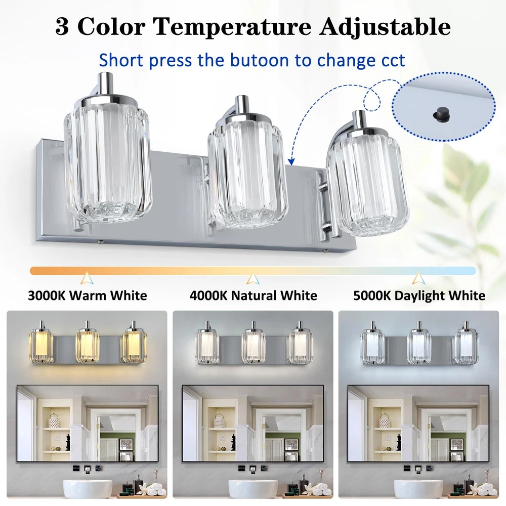 Three Color Changeable: Our bathroom light fixtures is with three colors temperature according to your need, there is a shift key on the top of the vanity lights, and freely choose warm white/cool white/day light temperature to meet your mood Unique Dimmable Design: Our this vanity light has a unique design that you can directly adjustable brightness through the button on the light fixture, long press the button to dimmable, don't need to use a dimmer or a dimmable switch, which is more convenient Energy Saving & Durable: Bathroom light over mirror designed with integrated LED light source, no bulb needed, color rendering index 80+, energy saving up to 90%. Reducing the hassle of frequent bulb replacements. Each light head can provides 400 lm brightness High-Quality Materiel: Led bathroom vanity light is made of high quality metal material and acrylic cover, the light is elegant and beautiful, through the shade can make the light is not harsh Up & Down Reversible Mounting: This bathroon light fixture can be installed facing upwards or downwards, perfect for you indoor bathroom fixtures as vanity lights for mirror, dressing table mirror lights for makeup, led lights for bathroom cabinet, restroom lights for vanity mirror, powder room wall light fixture, etc