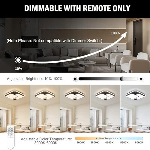 Return Policy Fast Delivery Trusted seller Modern LED Ceiling Light Fixture, 15.7in Dimmable Black Flush Mount LED Ceiling Light with Remote, Upgraded Square Bedroom Ceiling Lamp LED Chandelier for Living Room Kitchen Hallway,60W Product Description ✅【Dimmable with Remote + Various Functions】—Brightness: 10-100%. Color Temperature: 3000-6000K. According to your preference, you can adjust the modern LED ceiling light through the remote. Memory Function & Nightlight Mode can also be achieved via the matched remote.【PS: NOT compatible with wall dimmer switch】 ✅【Upgraded LED Chip + Stable Performance】—Power: 60W. Luminous Flux: 3600lm. (Please watch the display video.) Voltage: 110V-240V (Suitable for local electricity standards). With upgraded LED light source, the semi flush mount LED ceiling light is more efficient and energy-saving, stable and no flicker, soft light protects your family's eyes. The square LED ceiling light has CRI 80+ to capture all natural colors of the objects to get a more comfortable visual experience. ✅【Suitable Size + Widely Used】—Close to ceiling light fixture Length=Width=15.75in/40cm. Fixture Height: 2in/5cm. With its modern design and versatility, this modern LED ceiling lamp is suitable for all interior design styles, can be used in bedroom, living room, kitchen, dining room, hallway, entry way, office, laundry room, porch, hotel,etc.【It can also be installed on sloped ceiling.】 ✅【High Quality Materials + Long Service Life】—This black ceiling light with remote is made of metals and silicone, light transmission over 95%. With exquisite painted craft, the small LED chandeliers ceiling light do not rusts, faded prevention, anti-scratch. Average lifespan: >40,000 hrs. Manufacturers direct source, higher cost performance. ✅【Cost-effective + Easy to Install】—The instructions in the package have detailed steps and legends, you can also scan the QR code to watch the installation video. If you have any questions about the modern light fixtures ceiling, please contact us via the Message Box. Our engineers will reply within 6 hrs. Factory warranty: 2 years. Shipping Returns Payment Shipping Shipping is FREE to all addresses other than APO/PO boxes in the lower 48 states. All our stock ships from US-based warehouses. Shipped via USPS or UPS (depending on location and package weight) Unless stated otherwise, all orders will ship within 24-72 hours of your payment being processed. Check our feedback to see the great reviews of FAST shipping we offer. Returns Seller does not accept returns Payment We currently accept payment via eBay managed payments only. Once payment is cleared, we will dispatch your shipment within 1-3 business days. Please refer to the "Shipping" tab for more information regarding shipping speed to your destination.