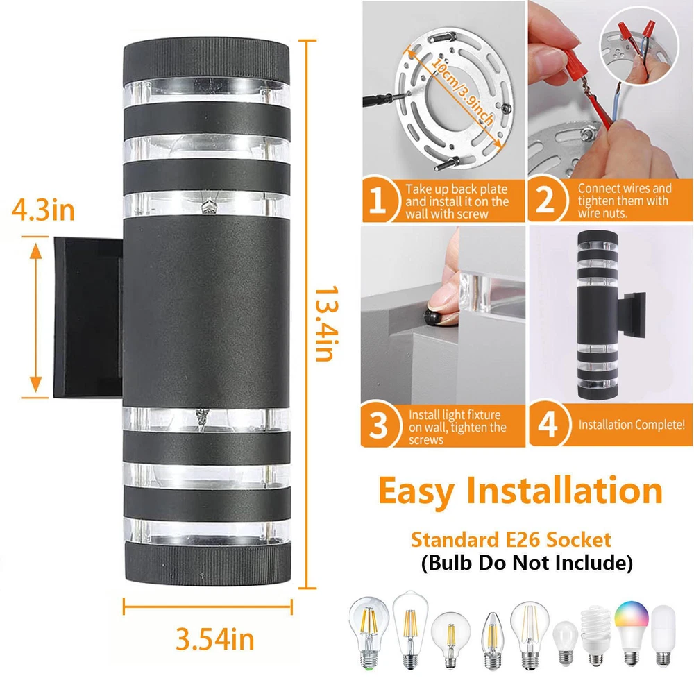 Modern LED Up Down Wall Light Sconce Dual Head Lamp Fixtures Outdoor Waterproof Product Description Features: 1.Modern up down dual head LED wall light with two E26 sockets for ouoor and indoor use. 2.High quality aluminum shell with extended reliability. 3.360 degrees lighting produces a unique, bright, up and down light effect on exterior walls. 4.IP65 waterproof rated to ensure high reliability and longevity ouoors. 5.No UV or IR radiation, low power consumption, extremely long life up to 50,000 hours. 6.Each light need two E26 LED bulbs. Bulbs are not included. 7.Easy installation, simple replacement, convenient using. 8.Perfect for door, entryway, walkway, wall, shed, patio, porch, garden, courtyard, patio, aisle, fence, deck, pathway, balconies, deck, steps, garage, driveway, carport, backyard, coop, farm shed, lawn, ect. Specifications: Material: Aluminum + Plastic Shape: Cylinder/Square Beam Angle: 360 Degrees Waterproof: IP65 Light source: AC 85-265V Soclet Type:E26(Bulb not included) Shell Color: Black Fixtures Diameter: 3.54" Size: 3.54*5.91*13.39" (L*W*H) Package Included: 1x Wall Light (Bulbs not included) 4x Screws Payment Before you palce an order, please kindly make sure that you have a paypal account. We accept PAYPAL payment only. Payment should be completed within 2 days after auction closed, or unpaid dispute will be filed for an closing auction. An unpaid case will be filled after 4 days. Delivery details We only ship to USA ! We ship to your eBay address. Each package will be shipped to Australia by AU Post Regular Parcel with tracking number. Please check your shipping address carefully before checkout, it can't be changed if order completed. All items will be shipped within 1-2 business day upon receipt of payment.Orders placed on weekend will be shipped within 3 days. If you do not receive your item in 7-10 business days.please contact us immediately for further assistance. We will be responsible for any damages or losses incurred in the shipping process. About us We maintain high standards of excellence FIVE STAR and strive for 100% customer satisfaction! Positive Feedback is very important to us. We hope that you contact us immediately Before you give us neutral or negative feedback, so that we can satisfactorily address your concerns. We promise to offer the lowest price and high quality produce. Our working time: From Monday to Friday(9:30 am to 18:00pm), we don't working on holidays ,hope you can understand and know that , thank you. Please always talk to us via ebay Message. We appreciate your business and look forward to growing our e-Bay sales with satisfied customers. Feedback Contact us If you have any questions, please feel free to contact with us by ebay Message during our business hours ( 9:30a.m. to 5:30 p.m.), or email us through eBay, we will try our best to help you to resolve it. For any presale or after-sale questions,please do feel free to email us! Due to the time difference, each email will be replied within 1 working day,and weekend will be delayed a bit.
