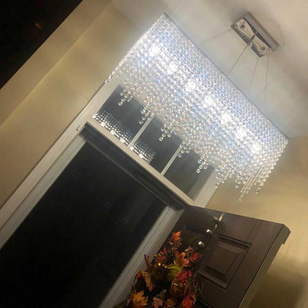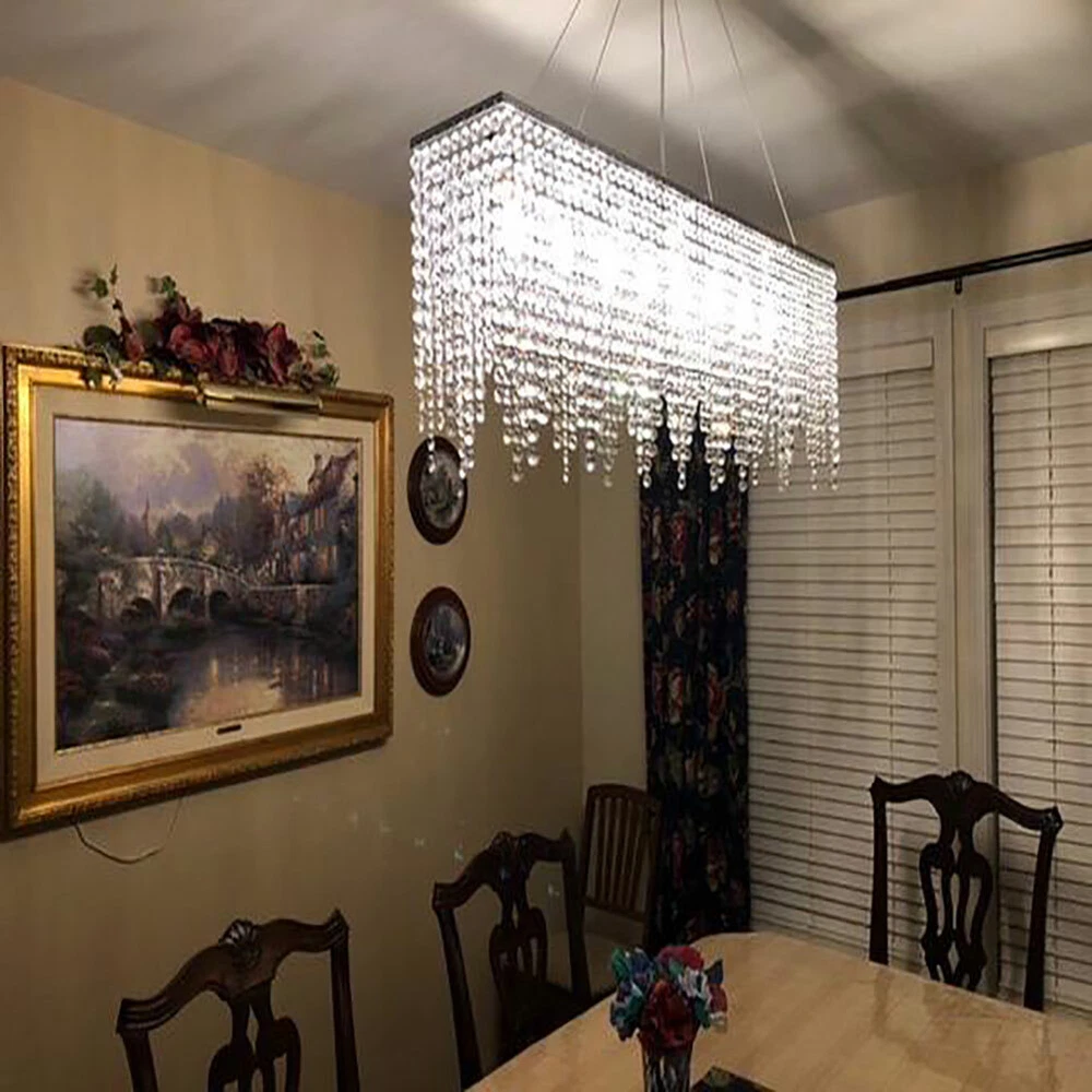 Description: Rain drop collection, sparkles from every angle. Full Assembly Required with time and effort. Feature: Material: Polished chrome stainless steel canopy and frame, top K9 clear crystal Dimension: Length 32" (80cm), Width 8" (20cm), Height 16" (40cm). Pendant wire: adjustable 59"(150cm) Light Source:E12 x 7 Bulbs Required (Max 40W each, NOT included). Works with incandescent, LED, CFL, halogen or color changing bulbs up to 40W. Fully dimmable when used with dimmable bulbs and a compatible dimmer switch (not included). Application: Ideal for living room, dining room, kitchen island, bedroom, foyer, indoor, farmhouse, sloped ceiling, bar, restaurants, galleries, exhibition room, hotel, coffee shop, office. Modern Rectangular Raindrop Crystal Chandelier Light Ceiling Light Pendant Lamp Description: Rain drop collection, sparkles from every angle. Full Assembly Required with time and effort. Feature: Material : Polished chrome stainless steel canopy and frame, top K9 clear crystal Dimension : Length 32" (80cm), Width 8" (20cm), Height 16" (40cm). Pendant wire: adjustable 59"(150cm) Light Source : E12 x 7 Bulbs Required (Max 40W each, NOT included) . Works with incandescent, LED, CFL, halogen or color changing bulbs up to 40W. Fully dimmable when used with dimmable bulbs and a compatible dimmer switch ( not included) . Application: Ideal for living room, dining room, kitchen island, bedroom, foyer, indoor, farmhouse, sloped ceiling, bar, restaurants, galleries, exhibition room, hotel, coffee shop, office. Payment Delivery details Terms of sales About us Contact us Payment We accept ebay payment 。 Fees such as import duties, taxes are not included in the item price or shipping costs. These charges are the buyer's responsibility. Delivery details Shipping: 2-9 working days to: USA Terms of sales We maintain high standards of excellence and strive for hundred percent customer satisfaction. Feedback is very important to us. We hope that you contact us immediately before you give neutral or negative feedback, so that we can address your concerns. It is impossible to address issues if we do not know about them! About us Your satis faction is our ultimate goal. We work hard to earn your trust and future business. Our certified technicians have tested each item before shipping. The unit comes with 1 year limited warranty on all manufacturing defects. a) If you receive a defective item, you may return it or ask for a discount. Please contact us within 14 days after you receive the package. b) What you returned must be intact and in its original packaging as re? u. Customer is responsible for shipping costs of the returned item. c) We will cover the cost of shipping back t with the shipping rate indicated in the registration page. We will send you a new unit or refund the full payment you paid. Thank you. Contact us Business Hour Business Hour: Monday To Friday: 8:30 AM to 5:00 PM (Beijing China time) Due to time zones, our reply to your questions may not be immediately. But within above working time, we will reply your email within 24 hours. If it's non-workdays, please kindly be patient and wait till Monday. Please contact us with ebay message. Please feel free to contact us if you have any questions. Monday To Friday: 8:30 AM to 5:00 PM (Beijing China time) Due to time zones, our reply to your questions may not be immediately. But within above working time, we will reply your email within 24 hours. If it's non-workdays, please kindly be patient and wait till Monday. Please contact us with ebay message. Please feel free to contact us if you have any questions. Features Durable Category Lighting Number of Bulbs 7 E12 Bulbs ( Not Included) Material Aluminum, K9 Crystal Item Length 80cm/31.5inch Pendant Wire Adjustable 150cm/59inch Voltage 110-120V Item Height 35cm/13.77inch Style Crystal, Modern Item Width 20cm/7.87inch Recommended Room Size 15-20㎡/161-215sq. ft Ceiling Chassis Size 17.5*8.89cm/6.89*3.5inch * Feature * Creative Design,Durable Material,Beautiful Appearance Note: Do not send to Brazil Bundle Description: No Feature 1 *Stable characteristic*, *high reliability* shipping notice Can not ship to Puerto Rico,Alaska/Hawaii Item location: CA /NJ /Austell Transportation does not include: canarias Power Source Hardwired MPN Does Not Apply Shade Shape Rain Drop Power Consumption Max 40W each, NOT included Room Bedroom, Dining Room, Home Office/Study, Living Room, Porch Lighting Technology LED Installation Area Indoor Manufacturer Warranty 2 years Department Adults Light Color Warm White Finish Polished Brand Unbranded Color Clear Item Diameter 16 in Type Chandelier