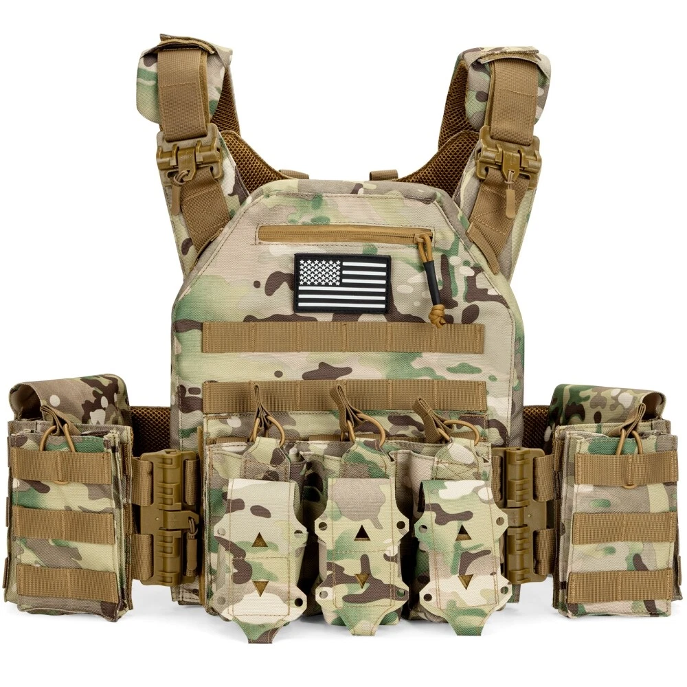 【HIGH QUALITY】 The weight vest composed of 900D fabric, high-tensile strength thread, and webbing is equipped with a map pouch and three modular heavy-duty mag panels.It comes with two stable side straps as well as adjustable padded shoulder straps. The weight vests are fully padded with breathable 3D mesh, which are comfortable and keep you cool by allowing air circulation. 【FUNCTIONAL-RAPID OPEN】 This weight vest is built with rapid-open connectors on the shoulders and waist that make it easy to quickly put it on and take it off. The unique cummerbund features integrated pockets that can even be accessed through the side for added protection in case it's required. The ideal tool for training, hiking, camping, extreme challenges, and fans alike. 【MOLLE SYSTEM】 Throughout the weight vest, there are MOLLE webbing attachment points and optional personalization options. Map pockets with snap-and-hook closures keep important documents within reach, and pockets offer easy access to soft pocket as needed. Shock-cords and cord locks can be hidden in the back of the vest, not only can the waist and size be adjusted, it can also enhance the feeling of comfort. 【 PERFECT SIZE 】 Adjustable shoulder strap and cummerbund fit most people from size S to XXXL size: maximum waist 52 inches, minimum waist 32 inches. Retro kit integrates seamlessly with carriers that use hook-and-loop flap systems to fit different waist sizes. In addition, waist belts and shoulder straps can also achieve the effect you want. 【USE SCENES】 Target for tactical training. Packaging: 1x Tactical Vest , other items not included.