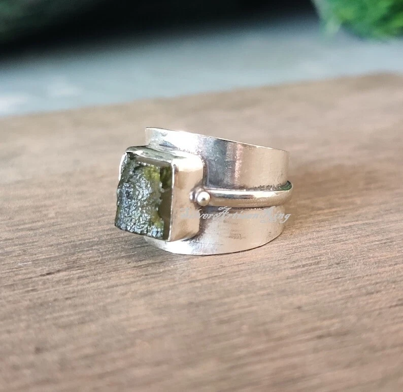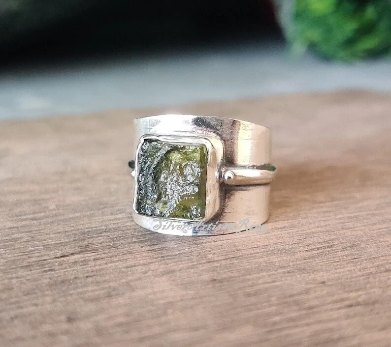 Welcome To My Shop Moldavite Gemstone Ring* Beautiful Band Ring* Handmade Ring* 925 Sterling Silver Ring* Amazing Ring* Stylish Ring* Gift For Her/ Him*** All my Designs are original. Stone - Moldavite Size - All Size Ring Setting - Bezel This Ring is for Women You will receive a Ring like the one in the pictures This Ring have 925 Stamp Suitable for use in everyday situations, or can also be used as a gift. Unique design will make a special attraction for the wearer. I make my jewelry with passion and love. The perfect gift for a Special occasion Wholesale Orders Accept on Wholesale Price All Pieces Have 925 Stamp