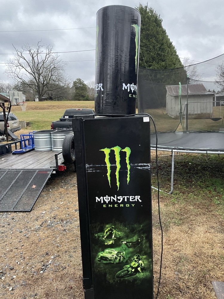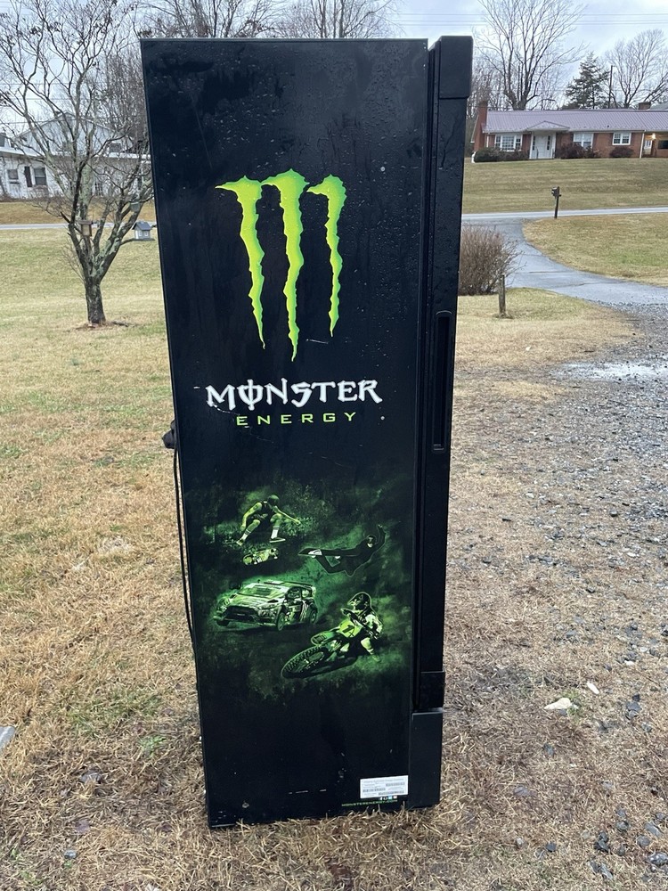 20”x22”x64. 160 pounds. Note: has small streak of mild wear on one side of the refrigerator. Perfectly operational. The Monster Energy Refrigerator/Cooler is a stylish black table-top mini fridge with a single door. With a sleek matte finish and low operating sound rating of less than 25 dB, this Monster Energy brand refrigerator is perfect for keeping drinks cool in any home, retail, or man-cave setting. This freestanding unit is a convenient addition for those looking for a compact and efficient cooling solution.
