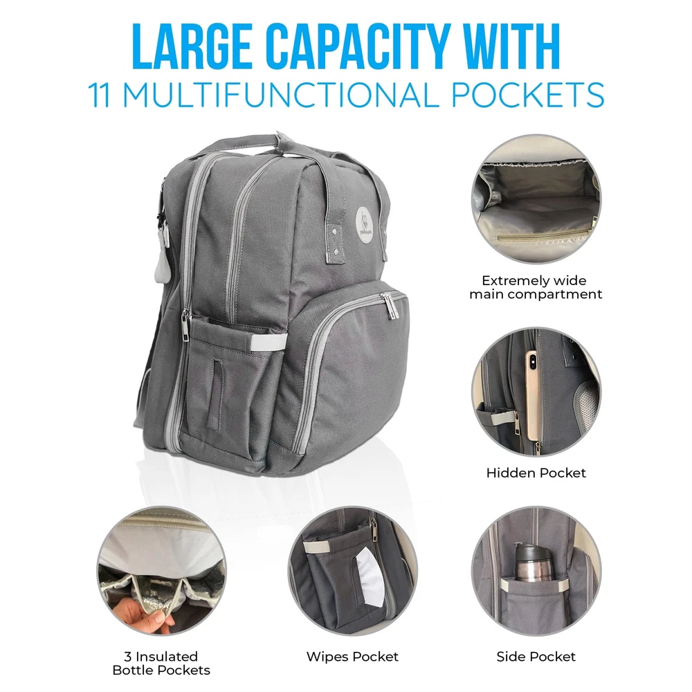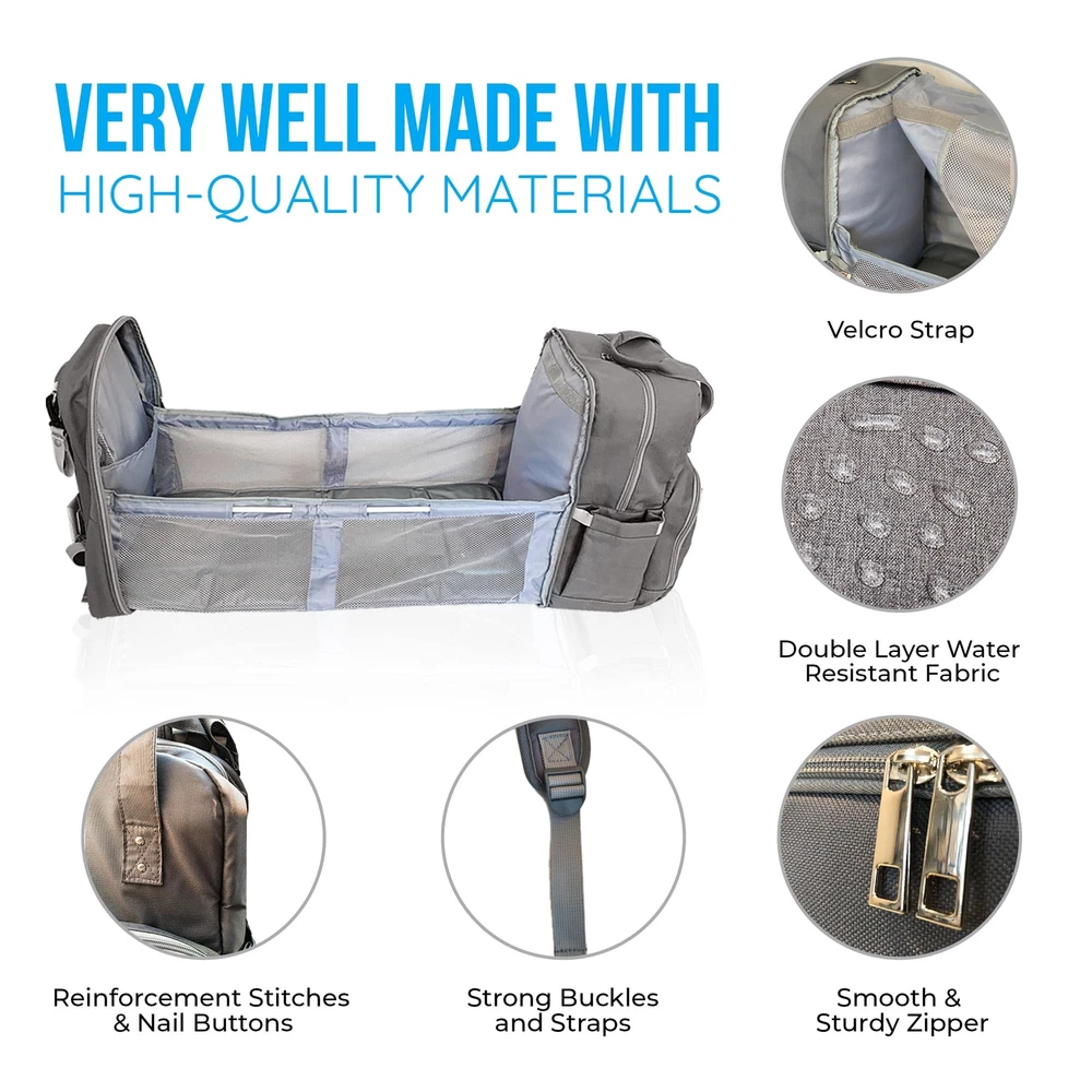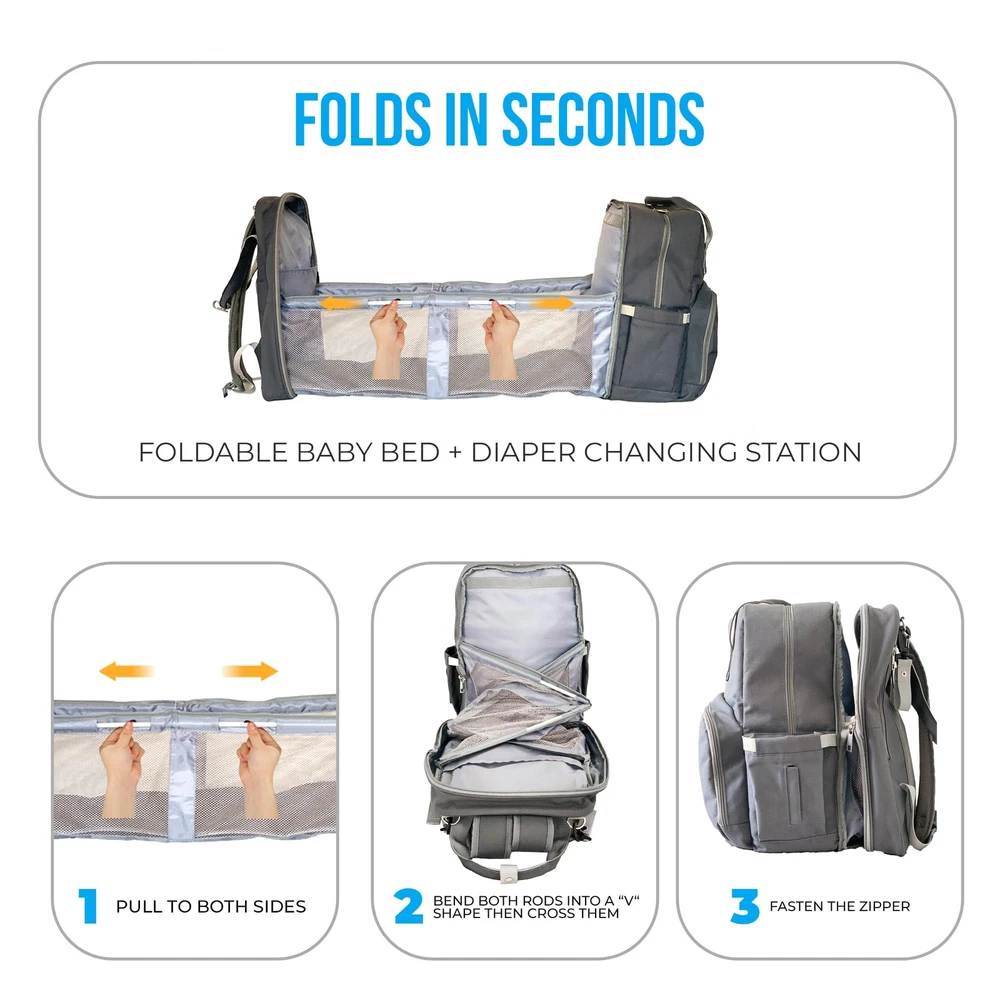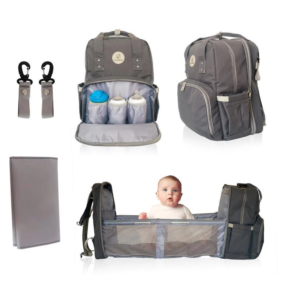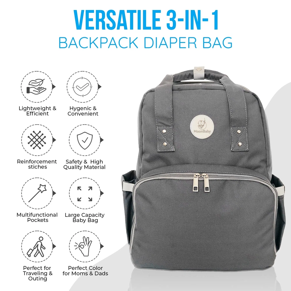 MoonBaby Backpack Diaper Bag Foldable Changing station Portable Crib Bassinet Brand: MoonBaby Color: Gray Assembled Product Weight: 3.6 lb Assembled Product Dimensions (L x W x H): 28.80 x 12.00 x 8.80 Inches MoonBaby Backpack Diaper Bag – Foldable Changing station | Portable Travel Bassinet | Baby Nap Crib for Boys and Girls | Large Capacity Baby Gear for Mom & Dad | Baby Shower Gift | Modern, Sleek Design, Unisex. Product Description: Meet MoonBaby - The Revolutionary Backpack Diaper Bag. Are you sick of a small and traditional diaper bag!? Have you ever been confused about where to lay down your sleeping angel when you are outside!? Do you feel disgusted changing for your baby on the public changing stations!? Never Worry About Finding a Safe and Clean Place For Your Baby While Outing. Large capacity with multiple pockets baby bottle warm. The dimension of the crib after assembly is 28.8x12x8.8inch (L x W x H). Please allow 1-2" variance due to manual measurement. How to install the foldable crib? 1. Unzip the crib part and extend the nappy bag.2. When installing for the "rst time, the foldable rods need to be inserted into the slots. 3. Lay the changing mat in the crib. How to close the foldable crib: 1. Take out the changing mat. 2. Hold the rod by your two hands and pull the rod backward (to the left and right sides), toward the outer side of the bag. 3. Bend it toward the middle of the crib into V shape. 4. Do the same with the second rod and cross the two rods. 5. Fasten the zipper. Safety warning: Your baby’s safety is one of the ultimate important aspects when using any baby product. Please note and follow the following points:1) Don't leave your baby unattended while using the bag, always use adult supervision. 2) This product is designed for quick diaper changes and naps. 3) Always keep the bag away from edges and any raised surfaces. VERSATILE BACKPACK DIAPER BAG – Innovative design combines a diaper bag, a foldable changing station, and a portable travel crib in one large capacity, convenient and fashionable backpack. Lightweight and efficient, perfect for traveling, outings, camping, and on the beach. Don’t worry about sun glare, insect bites, or noisy bites, thanks to the built-in sunshade and insect net. VERY WELL MADE WITH HIGH-QUALITY MATERIALS - We choose the best materials and water-resistant Oxford fabrics so that the bag lasts longer and makes it worth the money spent. The double zipper is sturdy, smooth, and conveniently glide. The zipper head is made from high-quality steel. The stitches are sewed neatly, securely, and beautifully. SAFE, HYGIENIC AND EASY TO USE -The carefully thoughtful outsidepockets will help you keep the frequently used items very handy. This backpack doesn’t scream diaper bag, but whenever your adorable babyneeds a diaper change or a quick short nap, just unzip and expand the COMFORTABLE, MULTIPLE CARRY METHODS WITH PLENTY OF ROOMS - PERFECT BACKPACK FOR EVERYONE MoonBaby Backpack Diaper Bag Foldable Changing station Portable Crib Bassinet Brand: MoonBaby Color: Gray Assembled Product Weight: 3.6 lb Assembled Product Dimensions (L x W x H): 28.80 x 12.00 x 8.80 Inches MoonBaby Backpack Diaper Bag – Foldable Changing station | Portable Travel Bassinet | Baby Nap Crib for Boys and Girls | Large Capacity Baby Gear for Mom & Dad | Baby Shower Gift | Modern, Sleek Design, Unisex. Product Description: Meet MoonBaby - The Revolutionary Backpack Diaper Bag. Are you sick of a small and traditional diaper bag!? Have you ever been confuséd about where to lay down your sleeping angel when you are outside!? Do you feel disgusted changing for your baby on the public changing stations!? Never Worry About Finding a Safe and Clean Place For Your Baby While Outing. Large capacity with multiple pockets baby bottle warm. The dimension of the crib after assembly is 28.8x12x8.8inch (L x W x H). Please allow 1-2" variance due to manual measurement. How to install the foldable crib? 1. Unzip the crib part and extend the nappy bag.2. When installing for the "rst time, the foldable rods need to be inserted into the slots. 3. Lay the changing mat in the crib. How to close the foldable crib: 1. Take out the changing mat. 2. Hold the rod by your two hands and pull the rod backward (to the left and right sides), toward the outer side of the bag. 3. Bend it toward the middle of the crib into V shape. 4. Do the same with the second rod and cross the two rods. 5. Fasten the zipper. Safety warning: Your baby’s safety is one of the ultimate important aspects when using any baby product. Please note and follow the following points:1) Don't leave your baby unattended while using the bag, always use adult supervision. 2) This product is designed for quick diaper changes and naps. 3) Always keep the bag away from edges and any raised surfaces. VERSATILE BACKPACK DIAPER BAG – Innovative design combines a diaper bag, a foldable changing station, and a portable travel crib in one large capacity, convenient and fashionable backpack. Lightweight and efficient, perfect for traveling, outings, camping, and on the beach. Don’t worry about sun glare, insect bites, or noisy bites, thanks to the built-in sunshade and insect net. VERY WELL MADE WITH HIGH-QUALITY MATERIALS - We choose the best materials and water-resistant Oxford fabrics so that the bag lasts longer and makes it worth the money spent. The double zipper is sturdy, smooth, and conveniently glide. The zipper head is made from high-quality steel. The stitches are sewed neatly, securely, and beautifully. SAFE, HYGIENIC AND EASY TO USE -The carefully thoughtful outsidepockets will help you keep the frequently uséd items very handy. This backpack doesn’t scream diaper bag, but whenever your adorable babyneeds a diaper change or a quick short nap, just unzip and expand the COMFORTABLE, MULTIPLE CARRY METHODS WITH PLENTY OF ROOMS - PERFECT BACKPACK FOR EVERYONE × × × × × × × × × × × Buy now and save! S