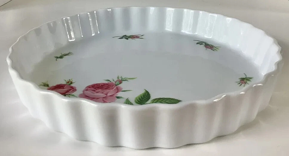 Moss Rose 10-inch round quiche baking dish. Very pretty, surrounded by pink roses inside. Fluted edges. No chips. Vintage.