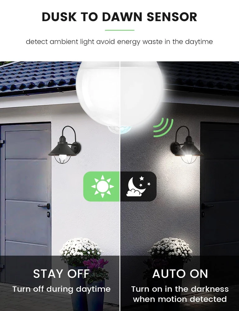 【Sensitive MOTION SENSOR】The motion sensor bulb will light up automatically while detects motion within 8-16FT in the dark, and off after motion ceased or disappeared about 45 seconds. NOTE: Make sure the sensor pointing down within proper distance and angle. To increase the sensitivity, you can adjust the Angle and Height of the bulb installation toward the direction people 【Dusk to Dawn Sensor】Built-in photocell sensor, deactivates the motion detecting function during the daylight hours (the bulb stays off all daytime-brightness above 40lux ), smarter and more energy saving 【Super Bright, Energy Saving & Life-span】13W 1100lm E26 Motion Sensor bulb, equivalent to 120W traditional bulbs, super Bright. Saves up to 85% energy. Last longer and energy saver 【Perfect Choice for Home Security】When stranger walks by your house, our outdoor motion sensor bulb will suddenly light up automatically, scaring them away and reminding you, bring safety to your families. (Tips: 1. Keep the security light bulb away from moisture and extreme heat. 2. It's best to mount the sensor light bulb 6-15ft above the ground, and position the motion sensor towards to the sensitivity zone. 3. It can not work with enclosed fixture, the motion sensor must exposed outside.) 【Wide Application & Quality assurance】5000K daylight motion sensor bulb is a perfect addition in a hallway, basement, porch, garage, storage room, or laundry room. E26 socket and recommended for Indoor use. Working Temperature: indoor and outdoor use if outside temperature is between 14°F(-10°C) and 95°F (35°C). If any problem or need support, please feel free to contact us on Amazon directly.(90-days free return, 5-years technical support)