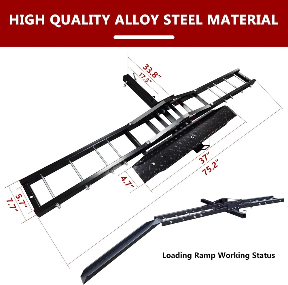 Store New Arrivals Add to Favorite View Feedback Contact Motorcycle Hitch Carrier, 500LBS Heavy Duty Steel Dirt Bike Carrier with Loading Ramp, Anti-Tilt Locking Device, Motorcycle Rack for Dirt Bike Hitch Hauler Description Item dimensions L x W x H 38.4 x 8.5 x 11.8 inches Vehicle Service Type Motorcycle, Scooter, Bicycle, Trailer Material Alloy Steel Mounting Type Hitch Mount Item Dimensions 38.4 x 8.5 x 11.8 inches Color Black Material Type Alloy Steel Load Capacity 500 Pounds Compatible with Vehicle Type Motorcycle, Scooter, Bicycle, Trailer Is Foldable No Versatile Transportation Tool: 500 lbs. maximum weight capacity. Ideal for mounting on car trailers, transporting dirt bikes, scooters, bicycles, buggies, light motorcycles and more. Comes with a self-storing ramp that can be secured to the transport vehicle during transportation. High Quality Material: Our motorcycle hitch carrier adopts heavy steel structure, high strength, more durable. Surface black coating, not easy to rust. The overall dimensions of the carrier are 75.2"x 7.7", with the loading ramp measuring 37"x 4.72". This carrier is designed for use with 2" square receivers. Safe and Stability: Removable loading ramp design, allows you to load and unload motorcycles from both sides. In addition, motorcycle trailers are equipped with anti-tilt locking devices. Even on bumpy roads, it can prevent the motorcycle behind from shaking. The ramp can be temporarily stored while driving and is equipped with pluggable screw. Quick assembly: Our buggy hitch rack comes with a full range of accessories and all mounting holes match perfectly. The instructions are clear and concise, quick and easy to install and operate. NOTE: Before loading your motorcycle, remember to do a final check of all bolts and fixtures to ensure safety. Product Description Vehicle Service Type: Motorcycle, Scooter, Bicycle. Note: 1. Remember to finish final inspection of all bolts and mounts before the loading of motorcycle to ensure safety. 2. If you have any concerns or questions, please feel free to contact. ABOUT US We offer the best prices around on high quality products. Our E-store includes media such as books, movies, music and games while offering electronics, toys, sporting apparel, clothing, tools, general home, garden items and more. SHIPPING We are always working hard to ensure your package arrives as soon as possible. Please understand that some factors like weather, high postal traffic, and the performance of shipping companies are outside of our control. We offer free shipping to the lower 48 states and ship within 2 business days of payment, usually sooner. We do not accept P.O. Boxes. Please provide a physical address. For shipping outside of the continental USA, we only use eBay's Global Shipping Program.The item is shipped to KY and then sent to the rest of the world. International customers are responsible for all duties and taxes. Continue to check out in order to calculate costs for shipping the item to your country. Messages regarding eBay's Global Shipping Program MUST be directed at eBay EXCLUSIVELY. RETURNS We offer a 30-Day Return Policy on items which you are not completely satisfied with. You have the option for a full-refund or an exchange of the item. No returns are available on items shipped outside of the USA. PAYMENT We accept PayPal. CONTACT US This page content is yet to come Please ad us to your favorite seller and visit again later Thank You CUSTOMER SATISFACTION We try our very best to make sure every customer is completely satisfied. If there's a problem, message us! We're happy to help. WE ACCEPT Copyright © 2021 AutoDS. | All Rights Reserved