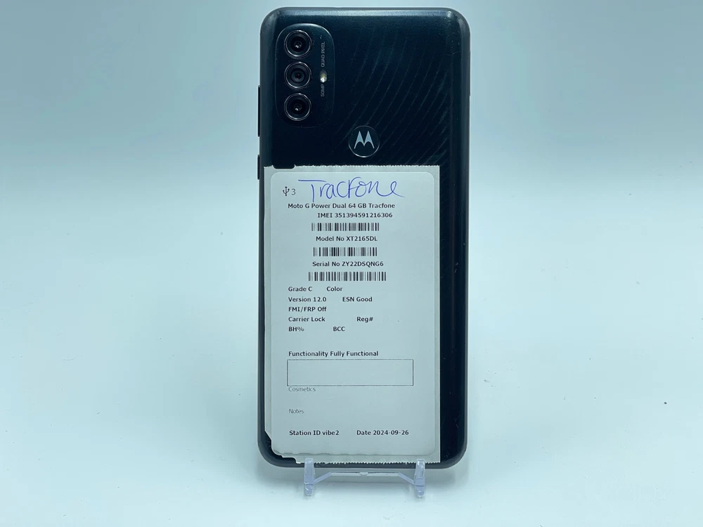 PAYMENT - Payment is due when item is ended. If payment is not received within 4 DAYS , the order will be automatically cancelled resulting in a strike on buyer's account. Buyers with 2 or more unpaid items will no longer be able to make offers or purchases from Warehouse Wireless. RETURNS - Returns are accepted within 60 days of purchase. We do not offer replacements or partial refunds. Original purchase price will be refunded after receipt of return. SHIPPING - USPS requires all electronics with lithium batteries be shipped using Parcel Select. Shipping times vary depending on location and are estimates only. Unfortunately, we are unable to offer USPS Priority, USPS Express, or FedEx Express shipping options. Motorola Moto G Power 64GB XT2165DL (Tracfone) Black Firmware: Android 12.0 - S3RQS32.20-42-10-6-10-5 THE PHOTOS ABOVE ARE REPRESENTATIVE OF THE DEVICE, NOT OF THE ACTUAL DEVICE. This item does not include a charger or any other accessories CARRIER - Tracfone IMEI/ESN - 351394591216306 Device is CLEAR FOR ACTIVATION - Please contact us right away if you do experience any problems with activation. DESCRIPTION - This item is in FAIR cosmetic condition. It reflects MODERATE to HEAVY USE and has MANY scratches and/or blemishes. Functional Condition Test Results: Passed Accelerometer Bluetooth Digitizer Earpiece Flashlight Front Camera Front Camera Quality Glass Condition Gyroscope Headset Port Headset-Left Headset-Right LCD Loud Speaker Microphone Power Button Proximity Sensor Rear Camera Rear Camera Quality Screen Rotation Vibration Video Microphone Volume Down Button Volume Up Button M-Network Connectivity M-Sim Reader 1 WiFi+GPS Failed Sim Reader Test