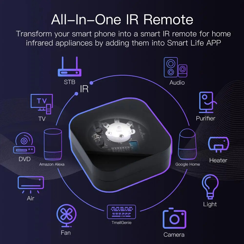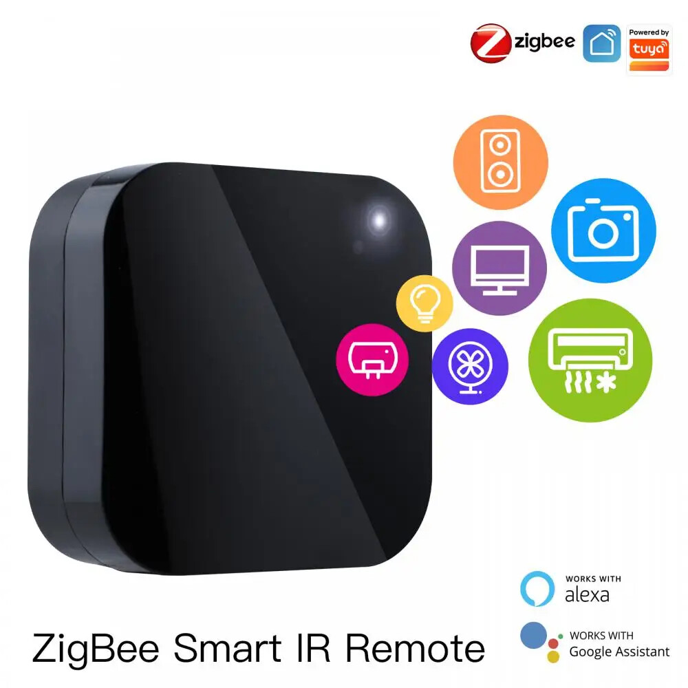 Movable Tuya Smart ZigBee IR Remote Controller Universal Infrared Remotes Work With Hub Alexa Smart Life Battery Powered Description: Power Input:AAA battery ×2 Stand-by Power:≤ 0.5W Controlling Distance:≤8m(Finally effect by environment) IR Frequency:38KHZ Operating Temperature:0°C~50°C Operating Humidity:≤85% RH (no condensation) Wireless Protocol:ZigBee Execution standard:GB/T9254-2008 Product Size:68×68×27mm Specifications: 【Tuya ZigBee Wired Gateway Required】This Tuya smart ZigBee IR remote is designed with Tuya ZigBee wired gateway required APP configuration and smart controls in Smart Life APP.(Note:Only a wired hub is compatible with the ZigBee IR remote,the wireless hub is not supported APP configuration.) 【All-in Control by Smart Phones】All-in- IR remote control devotes to activating house infrared appliances as conditioners, TVs, fans, DVDs, STBs, TV BOXes etc with single MOES SMART IR (Only support Ir (38KHZ ) ,RF not included),adding all compatible devices into the remote wireless remote control by smart phones you like;Control your appliances in advance when you are away home. 【Hands-free Voice Control】Alexa,set A/C to 77 degrees Fahrenheit. A voice command can activate MOES SMART IR controller to remotely control most Infrared Control Devices. Such as A/C, FAN ,TV, DVD, STB, TV BOX etc.(Furthermore compatible brands or devices ,please check attached list or Smart Life APP.) 【Customized Copy Function】If you can not find IR device brand in "smarlife"App,Programable learning function may help to copy same function from remote.Most IR remote control Devices will be applicable such as fireplaces, heater, ceiling fans,please confirm you have a traditional remote of the infrared devices learning by the ZigBee IR remote. 【Battery Powered Flexible Usage】Differs from the old WiFi version,this ZigBee type is designed with battery for power supply to replace USB cable,and you can put anywhere you like for added convenience; single room smart IR is recommended as infrared can not break through the wall with its controlling distance should be less than 8m.Only supports 2.4G WiFi connection. Package Included: ZigBee IR remote*1 AAA battery*2 User manual*1 Notes: Q:Can I add my RF devices for remote control? A:No,this is the IR remote compatible with infrared devices only,with no RF frequency included. Q:Do I need a hub for the remote? A:Yes,this is the ZigBee version with Tuya ZigBee hub required. Q:Is it compatible with Alexa for voice control? A:Yes,it is compatible with Alexa and Assistant for simple voice control. Q:What if I can not find the device in APP? A:There is the learning mode functional if you have a traditional remote for programmable l