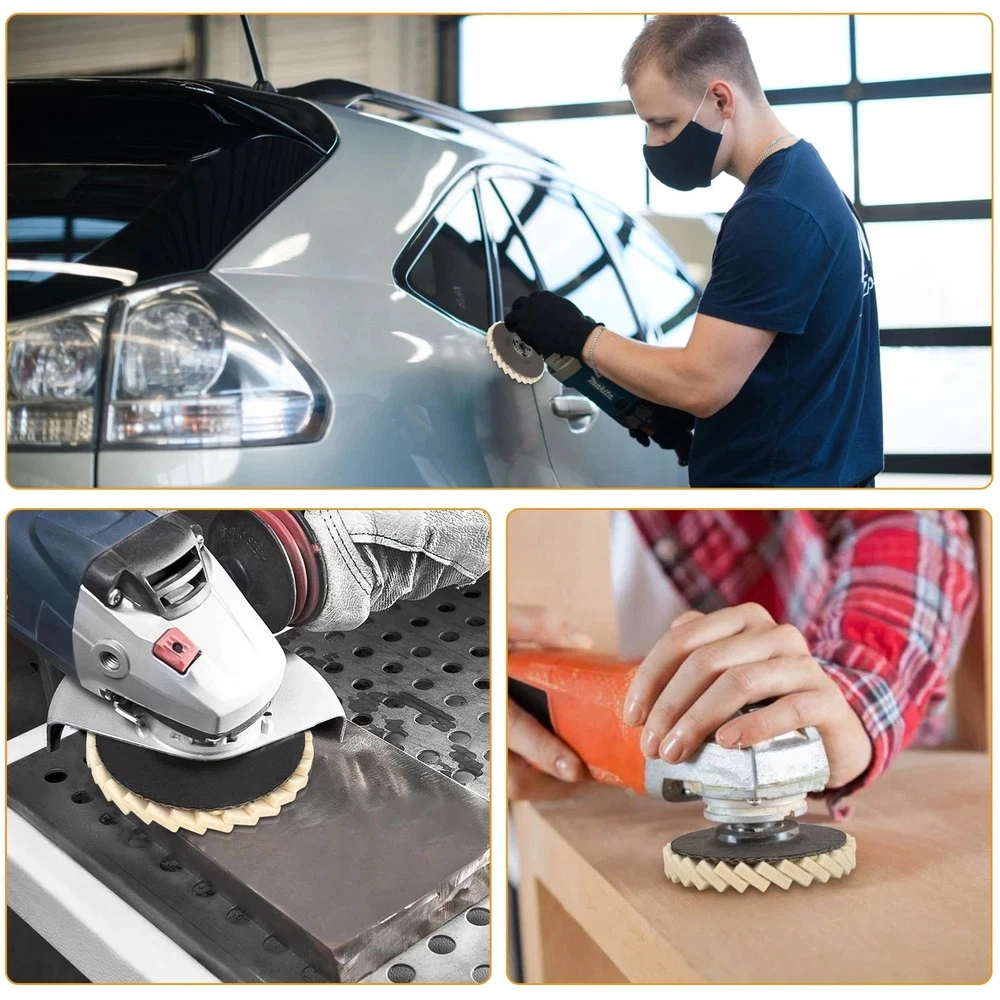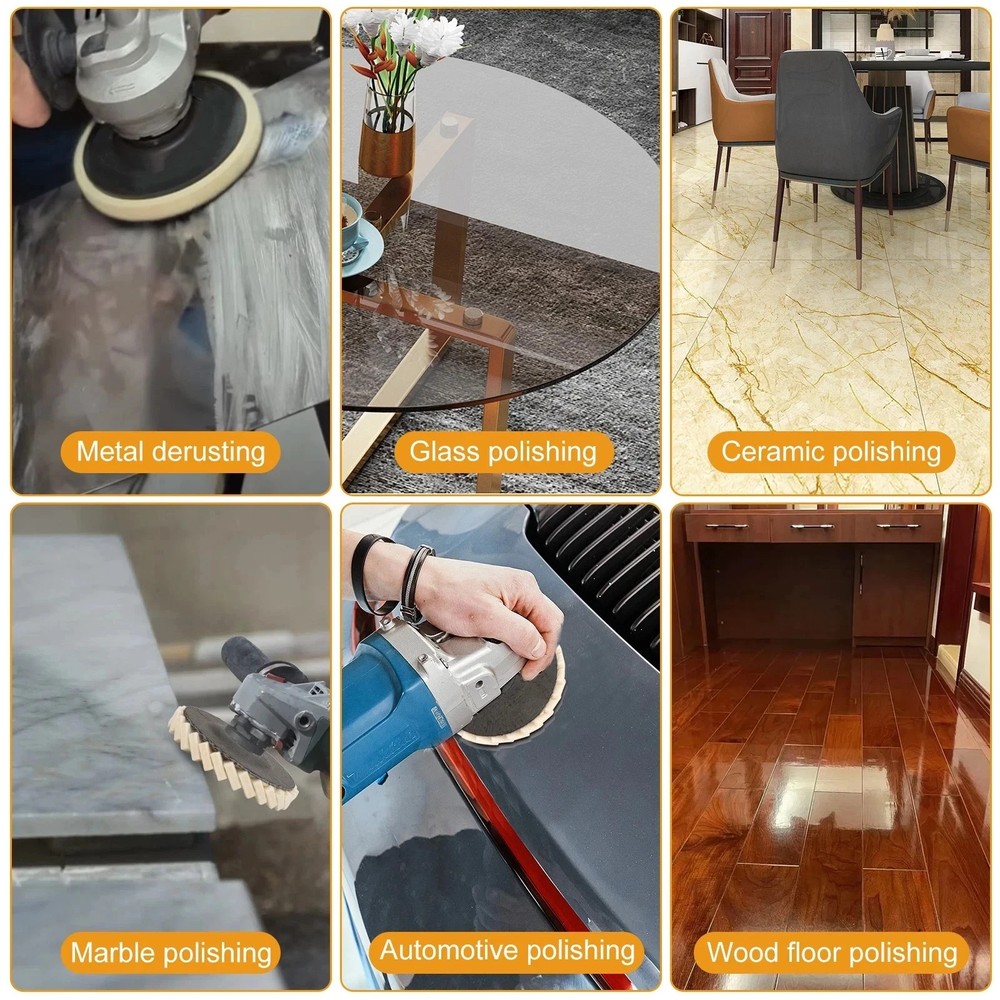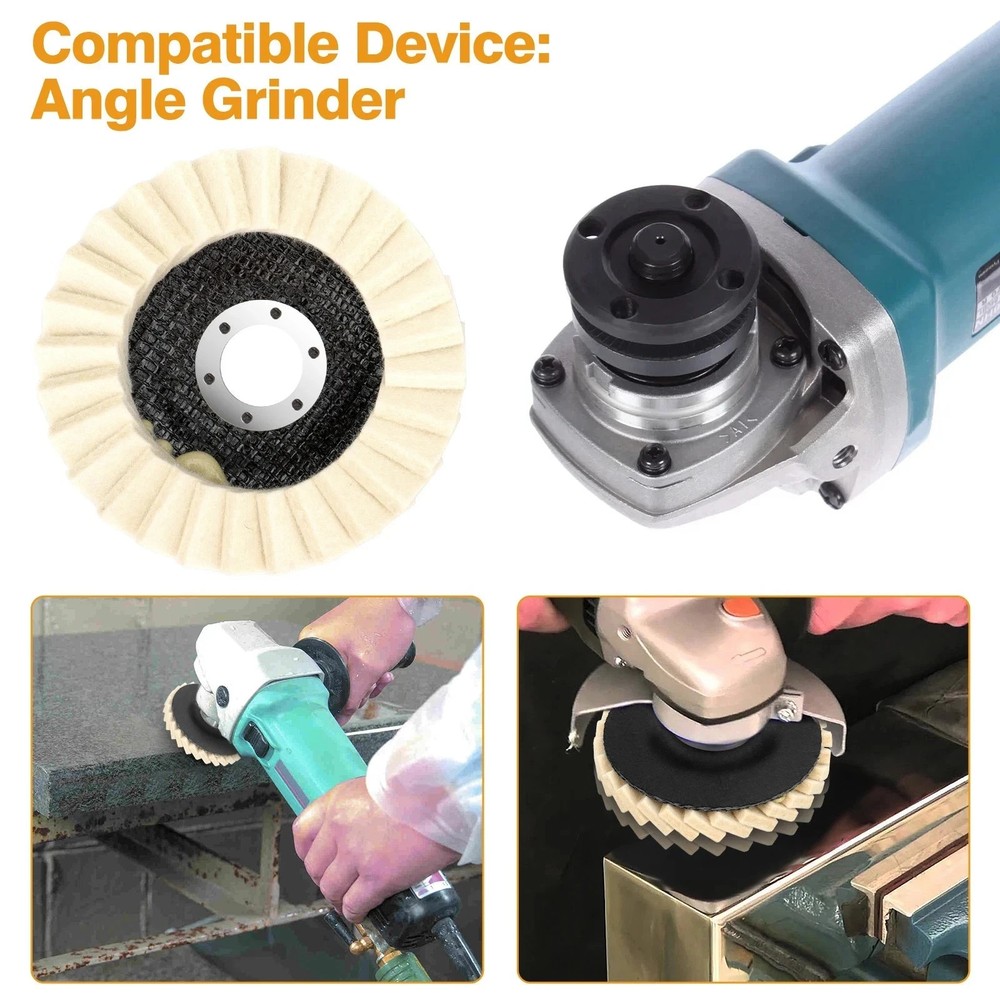 Product Description Upgrade your angle grinder with our wool felt polishing pads. Perfect for grinding, buffing, and polishing metal, wood, stone, marble, and plastic surfaces, these discs restore a smooth, shiny finish with ease. Each set includes 5pcs polishing wheels , designed with a 22mm center hole for universal angle grinder compatibility. Wool felt buffing pad is ideal for furniture scratch repair, paint finishing, and surface restoration. Durable wool fiber construction ensures long-lasting performance. Upgrade your toolkit with this wool flap felt polishing wheel set – the perfect grinder accessory for achieving professional polishing results on a wide range of materials. Product Feature ✅ Durable Wool Fiber: Premium wool felt construction, strong elasticity, long-lasting polishing performance. ⭐ Universal Fit: Standard 22mm arbor hole , fits most angle grinders, sizes available in 125mm (5”) . 🔧 Wide Application: Perfect for metal, wood, marble, stone, plastic, paint, and furniture scratch repair . 🔹 Smooth & Shiny Finish: Wool felt buffing pad is ideal for buffing, grinding, and surface restoration, leaving a polished look . 🔥 Value Pack 5pcs: Comes with 5 polishing pads per set, cost-effective and ready for multiple projects. Product Specification Type Felt Polishing Wheel / Buffing Disc Color White Material Wool Fiber Diameter 125mm (5") Hole Diameter 22mm Quantity 5pcs per pack Compatible Device Angle Grinder Suitable For Metal, Marble, Stone, Wood, Plastic, Painted Surfaces Features Smooth Finish, Long Service Life, High Efficiency, Easy Installation Application Polishing, Buffing, Grinding, Scratch Repair Package Included 🎁Please choose your desired quantity. Shipped according to your order size