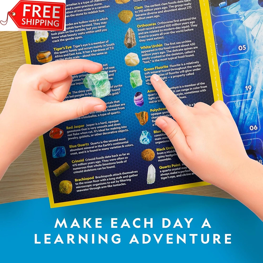 Store New Arrivals Add to Favorite View Feedback Contact NATIONAL GEOGRAPHIC Rock Collection Advent Calendar 2024 - Advent Calendar for K Description Condition New: A brand-new, unused, unopened, undamaged item in its original packaging (where packaging is ... Brand Does not apply Type Does not apply Item model number NGRMFADVENT2 Warranty Description We're proud to make the highest quality products which are backed Assembly required No Batteries required No Product Dimensions 7.28 x 1.69 x 10 inches Material Crystal,Gems Country of Origin China Item Weight 1.19 pounds Color Advent Calendar Theme Advent Age Range (Description) 6 years and up Included Components Advent Calendar, Minerals & Fossils, 24 Gemstones eBay NATIONAL GEOGRAPHIC Rock Collection Advent Calendar 2024 - Advent Calendar for Kids with 24 Gemstones, Minerals & Fossils for Kids, Complete Gem & Fossil Collection Christmas Countdown Calendar STUNNING SPECIMENS FROM AROUND THE WORLD - The polished rocks, gems, and fossils in this advent calendar include Geode; Pyrite; Rose Quartz; Red, Black, and Green-Spotted Jasper; Agate; Tiger's Eye; Brachiopod; Black Urchin & more! 24 DAYS OF TREASURES - Each day leading up to Christmas, kids open a panel to reveal a special rock, mineral, fossil or gemstone! With this Christmas countdown calendar, they can start a rock collection they will enjoy all year round, with storage bag included! DIG OUT A SPECIAL CRYSTAL ON THE FINAL DAY - The final piece in this collection is a stunning Rose Quartz specimen that kids will unearth from a mini dig brick. Dig tool and brush included, with a magnifying glass for looking at all the pieces up close! A HOLIDAY GIFT THAT LASTS A LIFETIME - Rock and mineral collecting is a popular hobby, and this rock collection kit is the perfect way to inspire a lasting love of geology for kids, and teach them about the fossils, rocks and crystals inside! HIGH-QUALITY EDUCATIONAL TOYS - National Geographic is proud to make the highest quality hands-on science toys, and all are backed by exceptional service and a commitment to your satisfaction. Product Description NATIONAL GEOGRAPHIC 2024 Rock, Mineral & Fossil Collection Advent Calendar The video showcases the product in use. The video guides you through product setup. The video compares multiple products. The video shows the product being unpacked. Celebrate the season with science and the National Geographic 2024 Rock, Mineral & Fossil Advent Calendar! Each day as Christmas approaches, kids will open an exciting new specimen to add to their collection, complete with collector's pouch! Celebrate the season with the 2024 Rock & Fossil Collection Advent Calendar! Kids love rocks, gems, and fossils, and this exciting Christmas countdown calendar will give them a new specimen to add to their collection each day as the holiday approaches. The fun and excitement culminate on the final day, as kids unearth a shimmering rose quartz specimen from the included mini dig brick, just like a real geologist! This educational take on a classic holiday tradition includes the following rocks, gems, and fossils: Agate, Green Aventurine, Green Fluorite (Rough), Geode, Tiger's Eye, Snowflake Obsidian, Pyrite (Fool's Gold), Red Jasper, Blue Quartz, Red Agate, Amethyst, Blue Calcite (Rough), Polychrome Jasper (Rough), Quartz Point, Rose Quartz (in dig brick), Crinoid, Brachiopod, Orthoceras, Bi-Valves, Gastropod, Clam, White Urchin, Coral, and Black Urchin. This advent calendar also includes a pouch for storing their treasures, as well as a magnifying glass and identification sheet for closer examination of their new collection. Rock and mineral collecting is a fascinating and popular hobby kids love, and the 2024 National Geographic Advent Calendar is a great introduction for boys and girls with an interest in geology. They'll love collecting and learning about these premium rock, fossil and mineral specimens that were formed over millions of years! Put a scientific twist on the holidays this year with the National Geographic Rock, Mineral & Fossil Advent Calendar! We make the highest quality hands-on science toys, and all products are backed by exceptional service. With a mission to inspire people to care about the planet, the National Geographic Society is one of the world’s largest nonprofit scientific and educational organizations. Countdown to the Holidays with National Geographic Advent Calendars! 24 Magic Tricks & Experiments Kids will perform a fun magic trick or cool science experiment each day! Gems, Jewelry Settings & More! Discover one of 24 gorgeous gemstones each day leading up to Christmas! 24 Experiments & Specimens Kids will conduct an experiment or uncover a rock or fossil specimen each day! Celebrate with Science! Celebrate the season with science and magic fun for the whole family! Celebrate with Science! Explore the wonders of geology and start a collection with these specimens! Celebrate with Science! Celebrate the holidays with hands-on science and geology fun for everyone! Item model number NGRMFADVENT2 Warranty Description We're proud to make the highest quality products which are backed by exceptional service. Assembly required No Batteries required No Product Dimensions 7.28 x 1.69 x 10 inches Material Crystal,Gems Country of Origin China Item Weight 1.19 pounds Color Advent Calendar Theme Advent Age Range (Description) 6 years and up Included Components Advent Calendar, Minerals & Fossils, 24 Gemstones Shipping Fast shipping is very important for us. Our standard US shipping service is FREE. Your order will be shipped within 1-3 business days upon full payment received. Your order will be delivered within 1-3 business days after the handling time. We reserve the right to cancel any order for any reason at any time. We are not responsible for undeliverable addresses. Returns and payment We offer a 30-day return policy from the date of payment received. This return policy covers Incorrectly Shipped items, Br