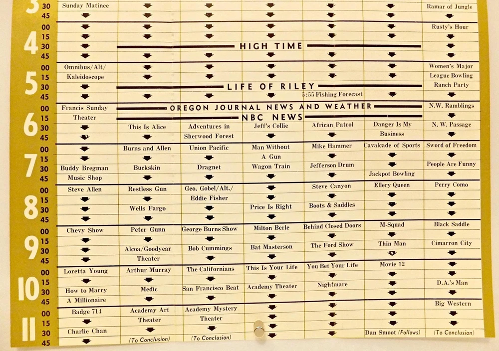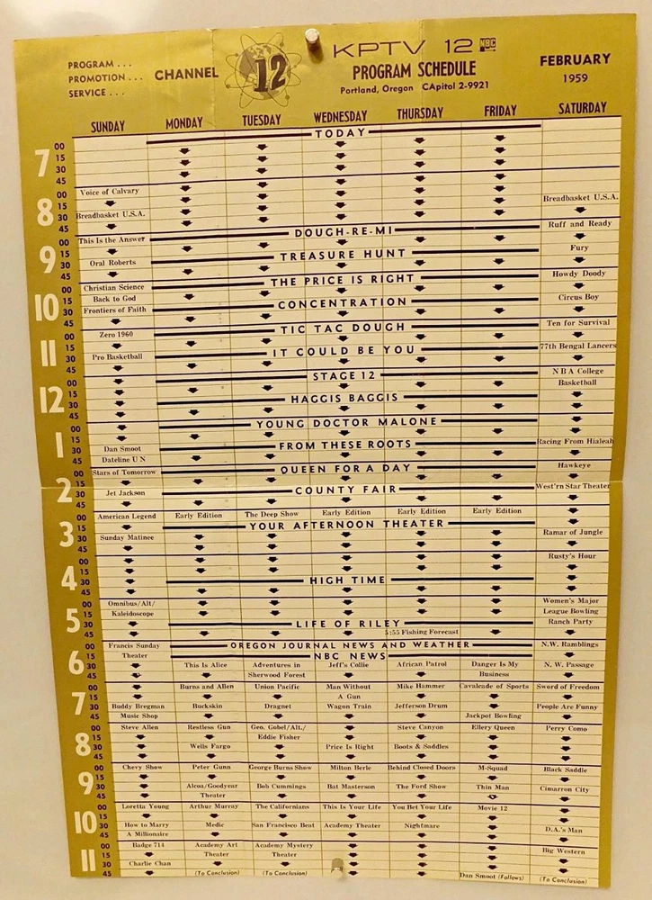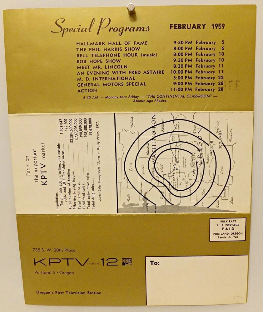 KPTV - NBC TV STATION ADVERTISERS PROMO: 1 Vintage 1959 KPTV TV Advertising Promo (Portland, Oregon), KPTV was the NBC Affiliate - Back Says "Oregon's First Television Station" - Purpose: Promoting Business Clients to Buy Local TV Commercial Air Time - Dated Feb. 1959 - Interior: TV Line-up Schedule - Cover: Darren McGavin as "Mike Hammer" & Rusty Nails TV Clown - Size: 8-1/2" x 11-1/4", B&W & shiny Gold, printed on thick white paper (stiff, not cardstock), 1 sheet folded, has 2 folds for mailing - Low Print Run for Local TV Station use only - The item you see is the item you will receive - SEE SCANS - Very Good+++ Condition or Better: Nice, flat, Clean, used, No Image Creases/tears, Not Faded, Has wear, Has Corner & border wear, dings, dents & or wrinkles, Has age yellowing, Sold As-Is. NBC KPTV TV 1959 PROMO Program Schedule COMMERCIAL ADVERTISING - PORTLAND OREGON NBC KPTV TV 1959 PROMO Program Schedule COMMERCIAL ADVERTISING - PORTLAND OREGON Click images to enlarge Description 1959 KPTV - NBC TV STATION ADVERTISING PROMO: You are Bidding on 1 Vintage 1959 KPTV TV Advertising Promo (Portland, Oregon), when KPTV was the NBC Affiliate at that time - Back Says "Oregon's First Television Station" - Used for Promoting Business Clients to Buy Local TV Commercial Air Time - Dated Feb. 1959 - Interior shows their TV Line-up Schedule - Ready for Display! Cover Shows Darren McGavin as TV's "Mike Hammer" & Rusty Nails TV Clown & Kids TV Host - Size: est. 8-1/2" x 11-1/4", B&W and shiny Gold, printed on thick white paper (kinda stiff but not on cardstock), 1 sheet folded, has 2 folds for mailing - Not postally sent - Has wear but very nice - Low Print Run for Local TV Station use only - The item you see is the item you will receive - SEE IMAGES for Sharpness & Defects. Very Good+++ Condition or Better: Nice, flat, Clean, used, No Image Creases, No Image tears, Not Faded, Has some wear, Has Corner & border wear, dings, dents & or wrinkles, Has age yellowing, Sold As-Is - Stored away flat for Decades - Any Questions Gladly Answered - Suitable for Framing - A Nice Addition to Any Collection or Give it as a Gift! Payment USA BUYERS ONLY : Accepted Methods of Payment: Paypal.com, Visa, Mastercard, Discover, American Express, Google Pay (G Pay), and Other Ebay accepted forms of Payment. All items are Shipped Boxed, Fully Insured & Packed well to prevent damage in shipping. I am sorry we do not ship worldwide at this time, Please contact me for possible exceptions. All Questions Gladly Answered. Shipping All Items are sent with the US Postal Service, via USPS GROUND ADVANTAGE (formerly 1st Class Service), Fully Insured, with Delivery Confirmation. Always "GORILLA - PROOF" Packaging ... Every item is Bagged & Shipped Boxed for Protection Against damage during shipping. About Us In Business Since 1970 ... Selling Quality Vintage Collectibles on Ebay since 1997. See My Great Feedback of Happy Customers. Buy with Confidence! Contact Us E-mail Me Anytime with Your Detailed Want-List. Let me know & I can List items on Ebay for your viewing . I have a Huge Inventory of items for sale, Circa 1900-1985 that are Not online. Get images that make Supersized seem small. Showcase your items with Auctiva's Listing Templates! THE simple solution for eBay sellers. Track Page Views With Auctiva's Counter