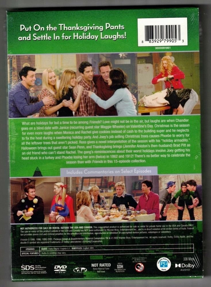 Region 1 DVD set is brand new, still sealed, and comes with all original artwork and packaging, including a cardboard slipcase --- featuring the series' beloved stars in stills from the show --- which was created exclusively for this retail package. DVD set contains 15 selected holiday-themed episodes from across the incredible decade-long run of the hilarious series. Featured episodes include: The One With the Candy Hearts [S1, E14] The One With Phoebe's Dad [S2, E9] The One With the Football [S3, E9] The One Where Rachel Quits [S3, E10] The One with the Thanksgiving Flashbacks [S5, E8] The One with the Inappropriate Sister [S5, E10] The One with the Routine [S6, E10] The One Where Chandler Doesn't Like Dogs [S7, E8] The One with the Holiday Armadillo [S7, E10] The One with the Halloween Party [S8, E6] The One with Ross' Step Forward [S8, E11] The One with the Rumor [S8, E9] The One with Rachel's Other Sister [S9, E8] The One with Christmas in Tulsa [S9, E10] The One with the Late Thanksgiving [S10, E8] Audio tracks and subtitles are in English. Total running time is approximately 340 minutes. Buyer agrees to pay within three days of auction closing; item will ship within one business day following valid payment. INTERNATIONAL BIDDERS ONLY - PLEASE NOTE: Because of the protections that it offers sellers, I will ONLY use eBay's Global Shipping Program to ship items to Canada and to all participating international destinations, and I will make NO exceptions to this policy for any reason, so please be clear about that fact before you decide to bid on and/or purchase this item. The GSP sets its own fees and shipping methods for the items it processes. I HAVE ZERO CONTROL over either the mail or the customs process, so PLEASE BE AWARE if you decide to bid on this item that extreme delivery delays may be possible. Please email me with any further questions, and please check out my other auctions! I will happily combine shipping, with deep shipping discounts on multiple items! Thanks for looking, and happy bidding!