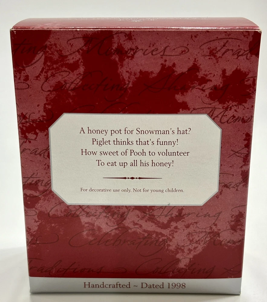 gtin13:015012457766Franchise:Winnie the PoohType:OrnamentSubject:BuildingYear Manufactured:1998Character:Piglet, Winnie the PoohOccasion:ChristmasBrand:HallmarkTheme:HolidayShape:SnowmanCollection:OrnamentsUPC:015012457766