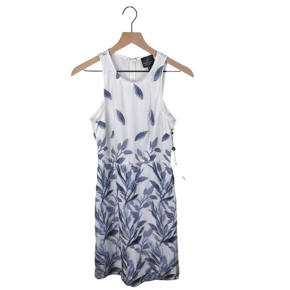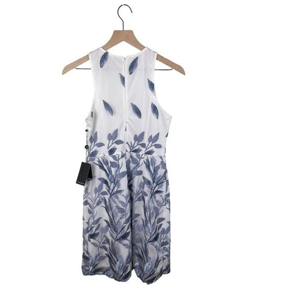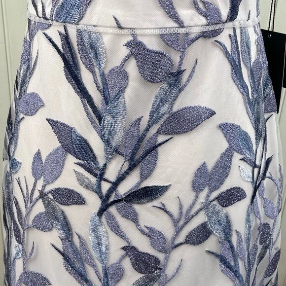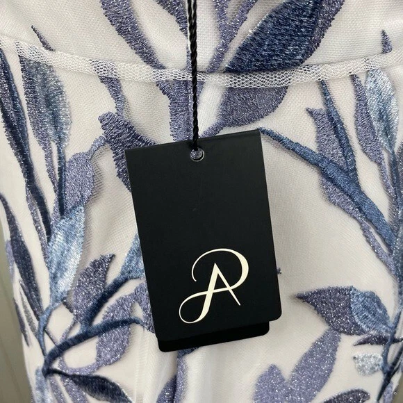 Adrianna Papell Leaf-Embroidered A-Line Dress in Blue Multi A simple, chic dress, beautifully printed and embroidered in a leaf pattern and delicate piping at the waist and a touch of metallic threading for added shine. A streamlined silhouette is fitted through the hips and is eased with a slight A-line hem. Sleek back zip closure. Fabric Content: 100% Polyester Lining: 100% Polyester Care Instructions: Dry Clean US Size 2 Shown on a size 2-4 mannequin Brand new with tags! Approximate measurements: Pit to pit: 16” Waist: 13.5” across Length from shoulder: 36”