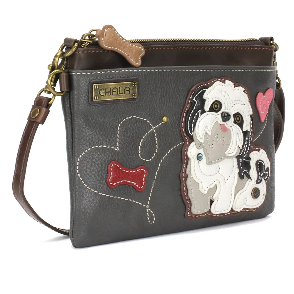 SHIH TZU DOG Mini Crossbody Cell Phone Bag by CHALA ~DESCRIPTION~ Front Pocket has a BEAUTIFUL DOG with zipper closure Character has detailed stitching with metal accents BONE zipper pull Top zipper closure Inside has 3 credit card slots Inside has zipper pocket Rear slide pocket Extra padding to protect your cell phone ~FEATURES~ *8 x 6" x 1" *Faux Leather *Nice sturdy quality bag *inside patterned lining *designed in California *adjustable wide strap 7"-30" Check out our eBay store for more Chala Bags Thank you for looking!!! For more of what a woman loves, be sure to check out our other items in our eBay Store The Bead 'n Bag Lady!