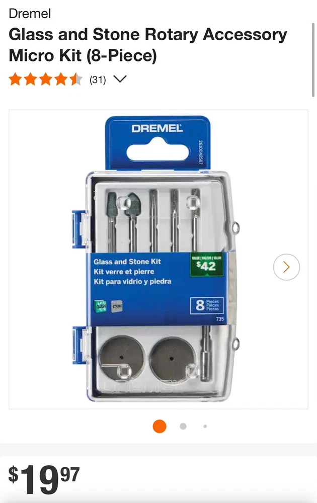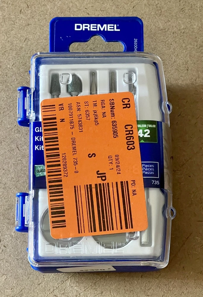 Make the most of your Dremel rotary tools by using our innovative and extensive line of rotary accessories and attachments. Whatever your project, we've got the perfect solution for you. Dremel accessories fit inside your rotary tool to extend it's versatility. Whether you're looking to carve, engrave, cut, sand or grind, there is a Dremel accessory to get the job done with pinpoint precision. That's why our purpose-built Dremel accessories let you get your project right down to the last detail. Dremel accessories are also color-coded into usage categories to make it easier for you to select the right accessory for your project. This 31-piece accessory micro kit is specially curated to perform all sanding and grinding applications. It provides the organized storage of popular Dremel accessories in a small, compact footprint. This accessory set offers a reusable storage case with clear lid and lift-out tray for easy organization of the included bits. The kit consists of aluminum oxide grinding stones, silicon carbide grinding stones, fiberglass reinforced cut-off wheel, sanding discs, sanding drum, sanding bands, EZ Lock finishing abrasive buff and mandrel. Compatible with all Dremel corded and cordless rotary tools. There's no need to hunt for the right collet, all Dremel rotary accessories feature a 1/8 in. standard shank. Specially glass and stone kit for all applications Comes with re-useable storage case and 9 accessories Clear lid, storage bin and removable tray make accessories easy to locate Can stack easily, stand upright or hang on a wall by hook Small footprint saves space Dimensions Product Depth (in.) 4 in Product Height (in.) 6 in Product Length (in.) 4 in Product Width (in.) 2 in Details Application Type Cleaning, Drilling, Engraving, Grinding, Polishing Individual/Set Set Number of Pieces 8 Rotary Tool Accessory Type Assorted Product Set or Kit Set Rotary Types Included Assorted Product Set or Kit Tools Product Type Other