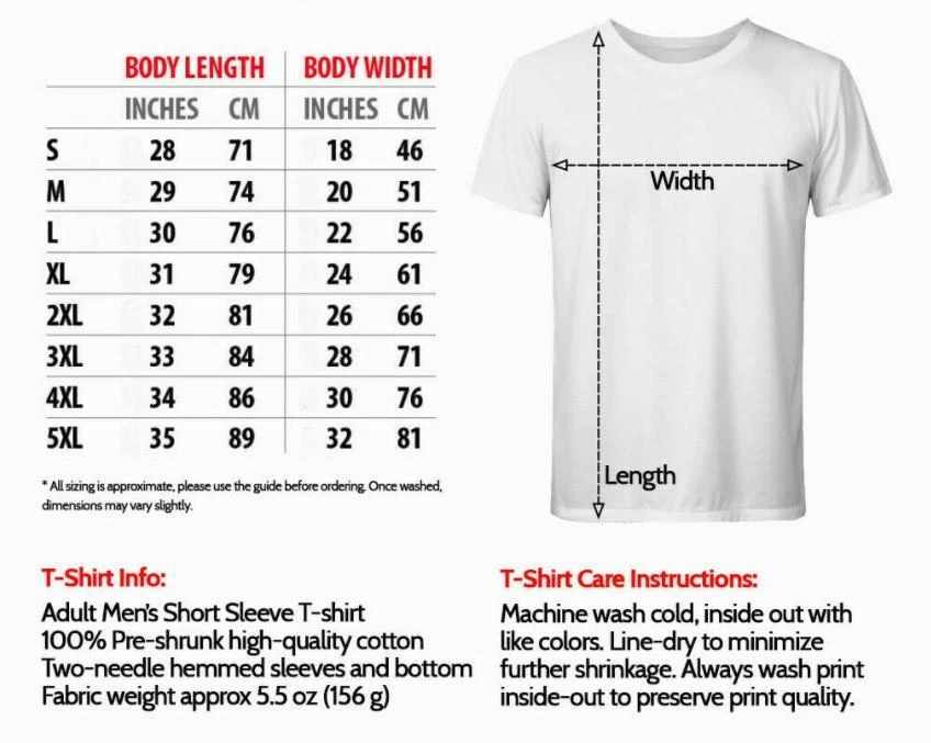Welcome to shopping at our store! If you require specific sizes, designs, or colors, kindly send us a private message Size : S-2XL is available Color : Black, White, Dark Heather, Navy, Sport Grey, Forest Green, Light Pink, Royal Blue, Purple, Gold , Light Blue, Red Print location : Front or Back Product Specification Unisex Heavy Cotton Tee (Gildan 5000) The unisex heavy cotton tee is the basic staple of any wardrobe. It is the foundation upon which casual fashion grows. All it needs is a personalized design design to elevate things to profitability. The specialty spun fibers provide a smooth surface for premium printing vividity and sharpness. No side seams mean there are no itchy interruptions under the arms. The shoulders have tape for improved durability. 100% Cotton (fiber content may vary for different colors) Medium fabric (5.3 oz/yd² (180 g/m²)) Classic fit Tear away label Runs true to size Size Guide (Inch) Note: Allow for a tolerance level of 1 inch. S M L XL 2XL 3XL 4XL 5XL Chest Width 18" 20" 22" 24" 26" 28" 30" 32" Height 28" 29" 30" 31" 32" 33" 34" 35" Features and further details : This heavy cotton tee has the classic cotton look and feel. Casual elegance will make it an instant favorite in everyone's wardrobe. Fabric : Made from specially spun fibers that make very strong and smooth fabric, perfect for printing Without side seams : Knitted in one piece using tubular knit, it reduces fabric waste and makes the garment more attractive Ribbed knit collar without seam : Ribbed knit makes the collar highly elastic and helps retain its shape Shoulder tape : Twill tape covers the shoulder seams to stabilize the back of the garment and prevent stretching Fiber composition : Solid colors are 100% cotton; Heather colors are 50% cotton, 50% polyester (Sport Grey is 90% cotton, 10% polyester); Antique colors are 60% cotton, 40% polyester Care instructions : Machine wash: warm (max 40C or 105F); Non-chlorine: bleach as needed; Tumble dry: medium; Do not iron ; Do not dryclean Shipping and Handling : The items will be produced and shipped out within 2-4 business days after payment received. Shipping times for USA Address it takes 1-5 business days for shipment depending on the delivery company and your location. We are not work on Saturday and Sunday. USA : allow up to 7 business days from the ship date ( Please be patient when awaiting shipment) Feedback : We appreciate receiving positive feedback from our buyers. As a newly started ebay business, positive feedback is crucial for us. If you are not satisfied with our products or services, please do not leave negative or neutral feedback before giving us an opportunity to resolve the issue first. We are committed to resolving any problems and ensuring your satisfaction. Contact us We can be contacted at any time through eBay messages if you have any questions, comments or product requests. We will respond to you within 24 hours and do our best to help you out! We encourage our customers to contact us with any questions or concerns! We'd like to be sure you are completely satisfied with your purchase.