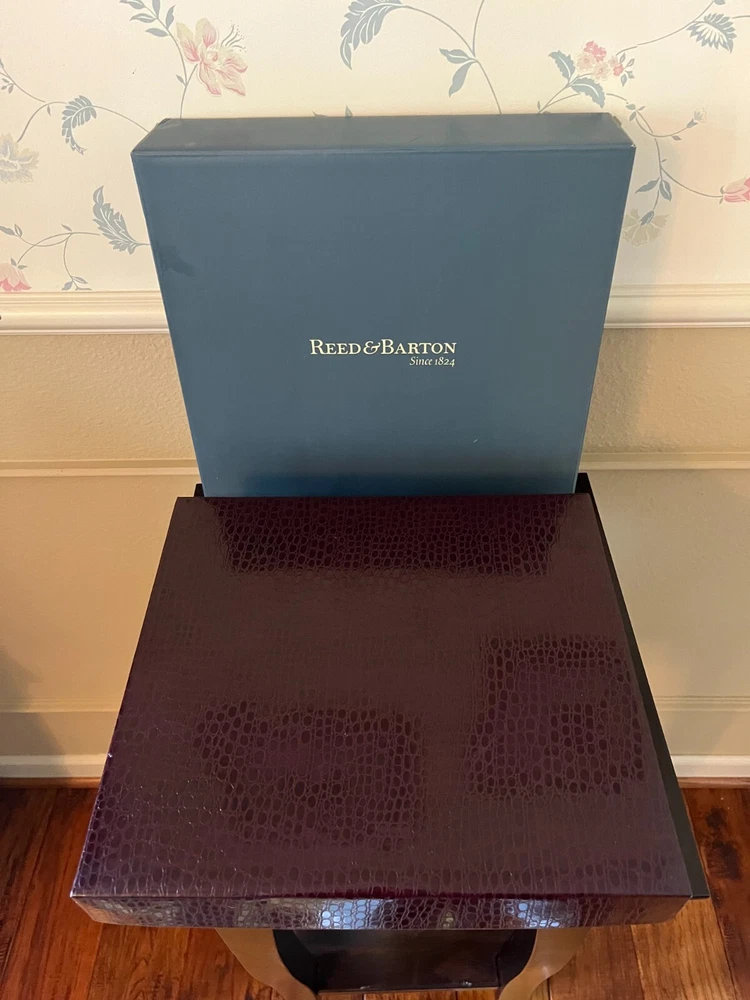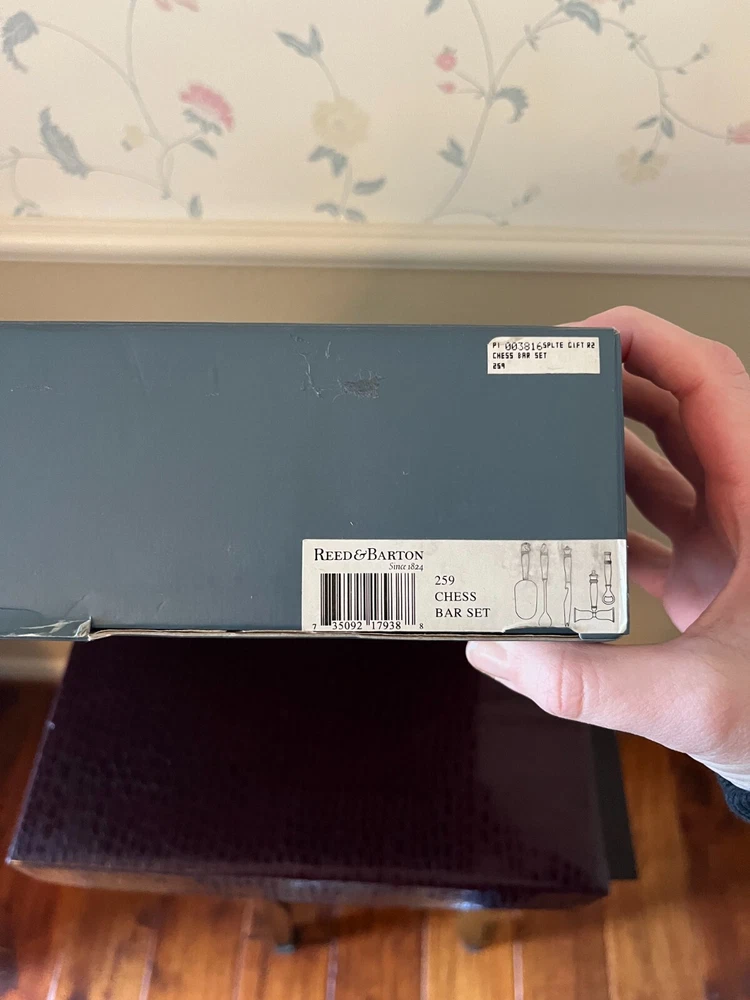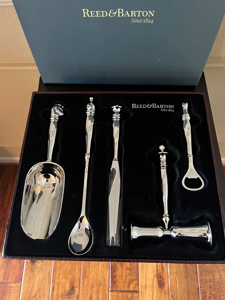 Introducing a brand new Reed & Barton silver bar tools drinks set that comes in its original box. This set has never been used, making it a great addition to your collection or a perfect gift for a loved one. The set includes various bar tools that are made of high-quality silverplate, ensuring its durability and long-lasting shine. The brand is well-known for their high-quality silverware products, and this set is no exception. The set falls under the categories of flatware & silverware, silverplate, silver, and antiques, making it a valuable addition to any collection. Take advantage of the free shipping offer and get your hands on this exquisite set today!