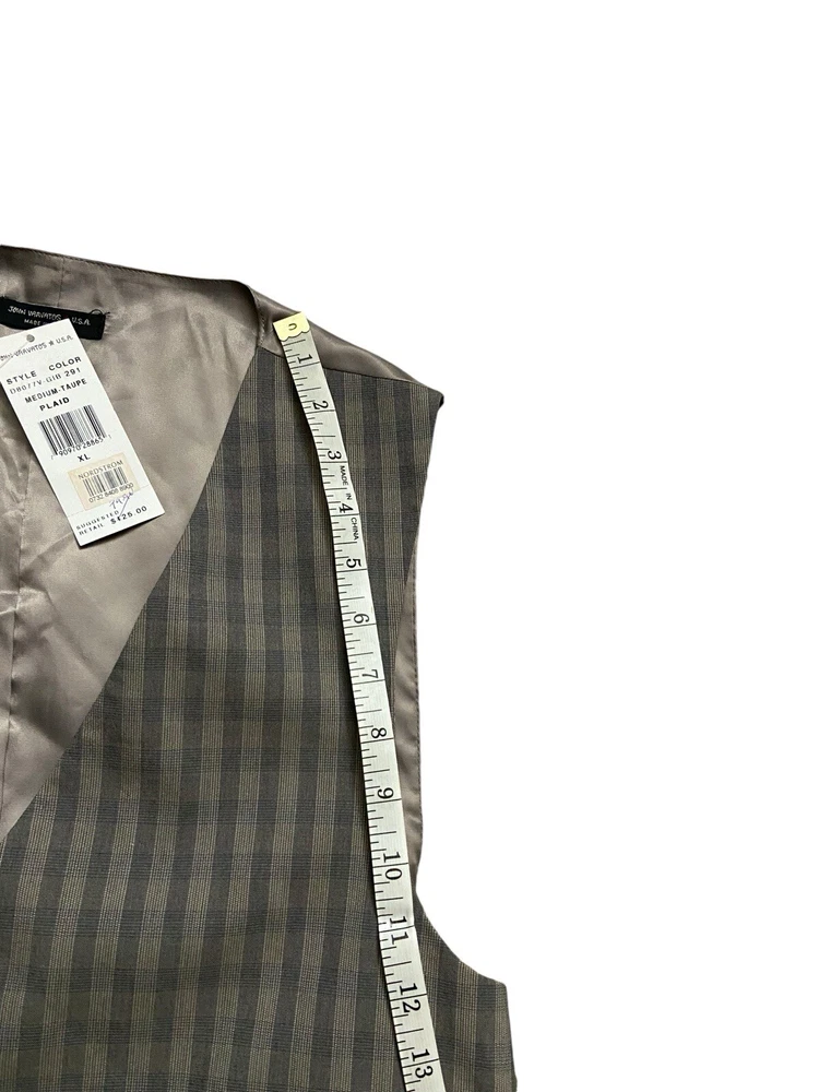 NEW John Varvatos Gibson Taupe Dress Vest Mens XL Brown Plaid Wool Button Front MEASUREMENTS Size tag is XL, however measurements look small for a XL size. For measurements, please see pictures above to ensure adequate fit. ITEM DESCRIPTION New with tags. Please review photos for details of wear/condition. I will ship your item upon payment within the next business day (Mon - Fri) excluding holidays and weekends. If you have any questions, please send me a message through eBay and will respond as soon as possible. Returns are accepted within a 60-day time window. Returned items must be in the same condition as it was shipped/received in including tags if applicable. Thank You for Stopping By! P.S Check my store for other clothing items. New items added daily waiting for a new home!