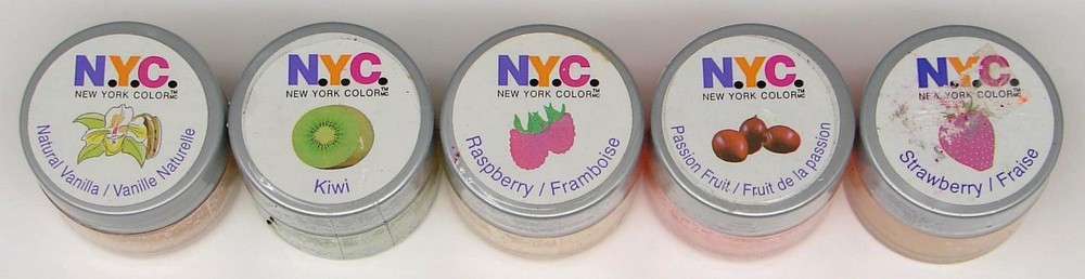 This Lot INCLUDES : FIVE different flavors of SEALED New York Color (NYC) FRUIT FLAVORED LIP GLOSS in lip balm jars, including ONE EACH of: 501A STRAWBERRY 502A RASPBERRY 503A NATURAL VANILLA 504A KIWI 506A PASSION FRUIT These are discontinued, and getting hard to find, but I found a few - get 'em while they last! All are still SEALED ; each jar contains 8 grams. * * * ALL 5 FOR ONE LOW PRICE! * * * Please keep checking Saler's other items for MORE of the Neat & Unique! Be sure to add me to your favorites list ! Sign up for my email newsletters by adding my eBay Store to your Favorites Additional Keywords: Makeup, Discontinued, retired, OOS, Out Of Stock, Legacy, collectible