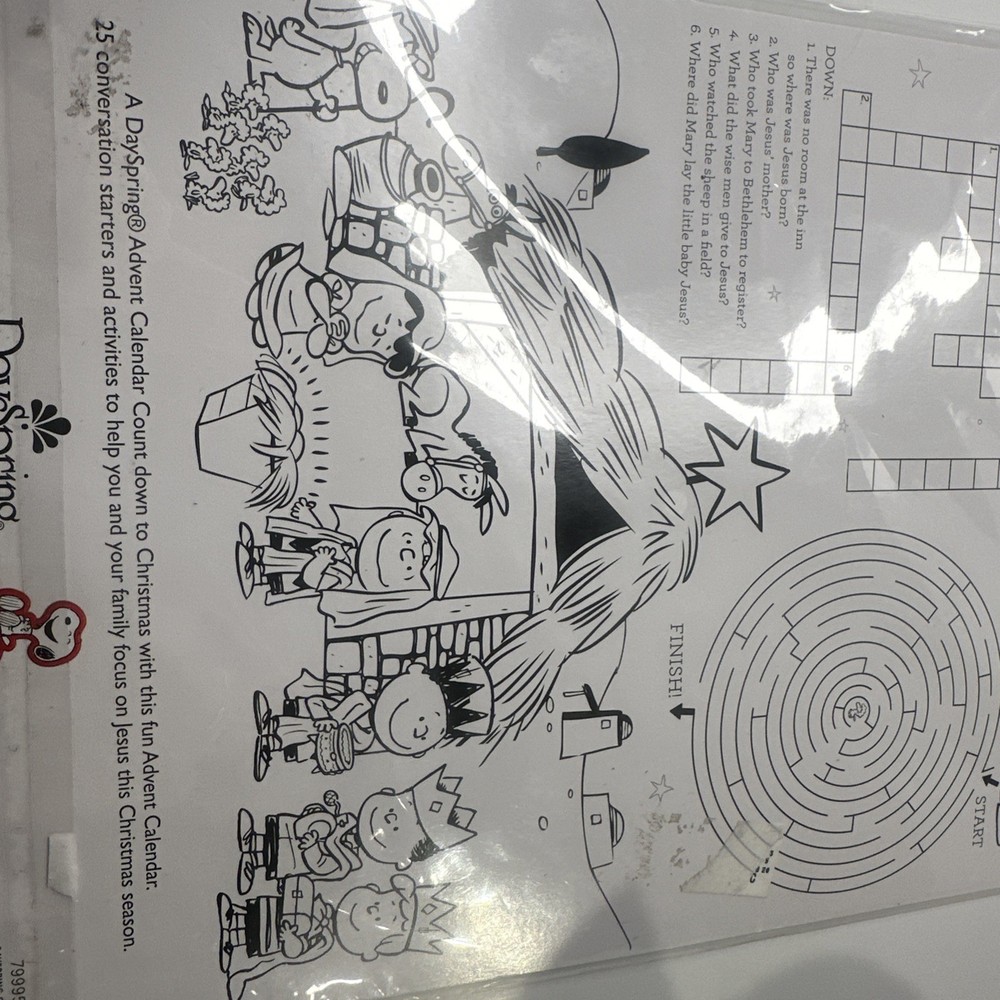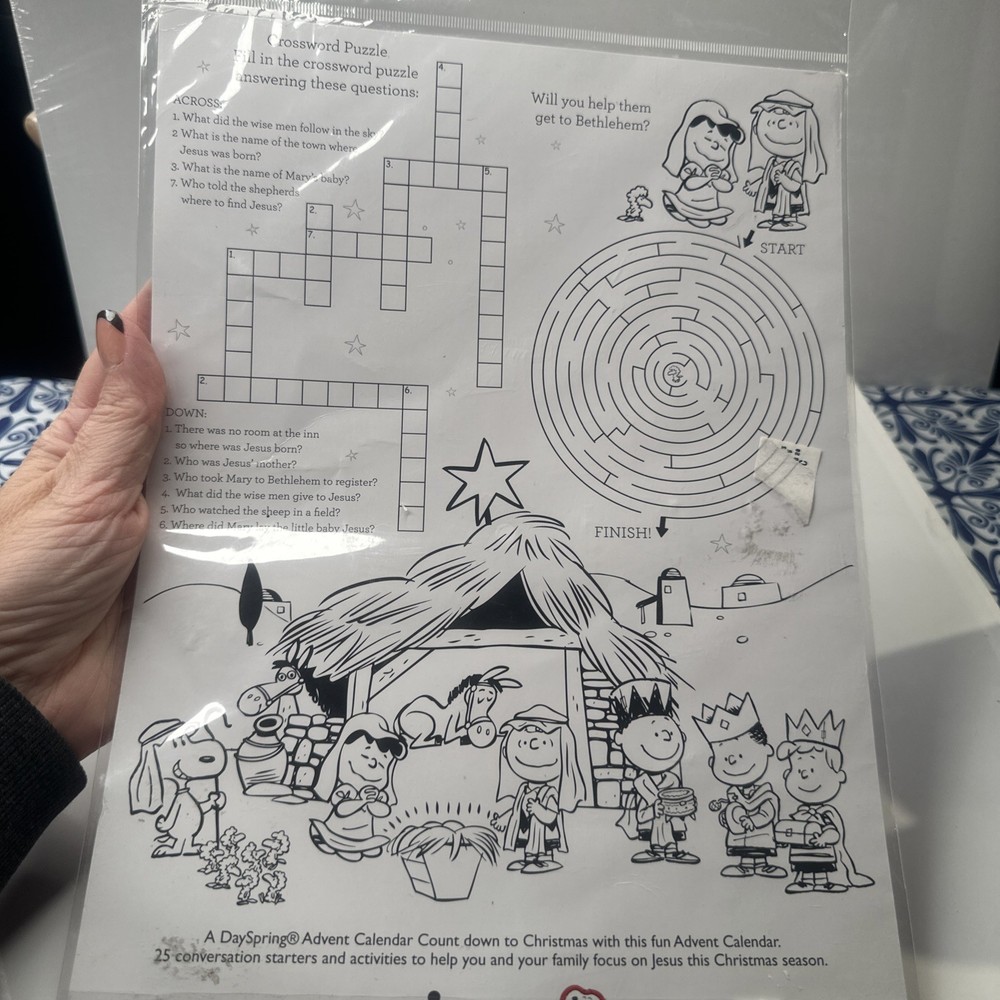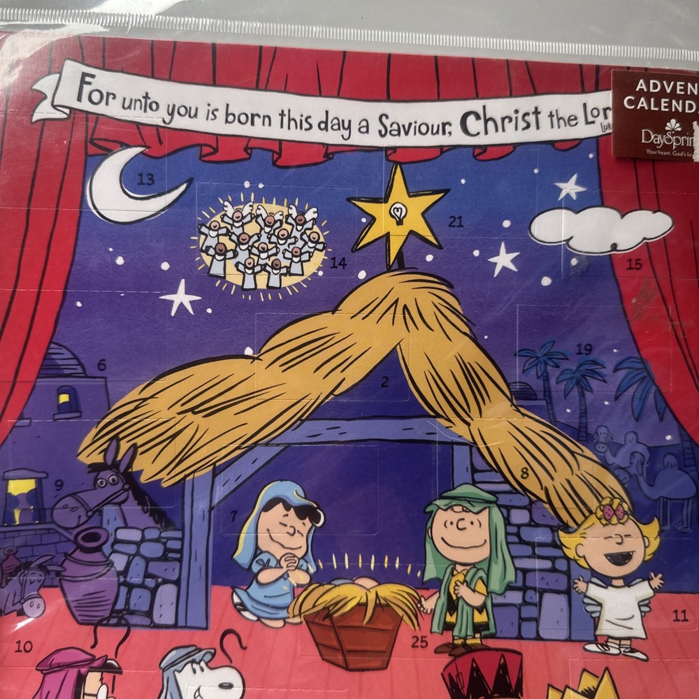 This product is a NEW, sealed Peanuts/Snoopy Advent Calendar by DaySpring Hallmark. It features a rectangular shape with a multicolor design, perfect for Christmas decor. Made of cardboard, this medium-sized calendar includes a nativity scene and is part of the Peanuts character family. With no filling and a door type of rectangle, this calendar is a festive addition to your holiday celebrations, measuring 9 inches in length and 12 inches in height. Made in China, this advent calendar brings the spirit of Christmas to your home in a charming and nostalgic way. This has 25 Conversation starters & activities