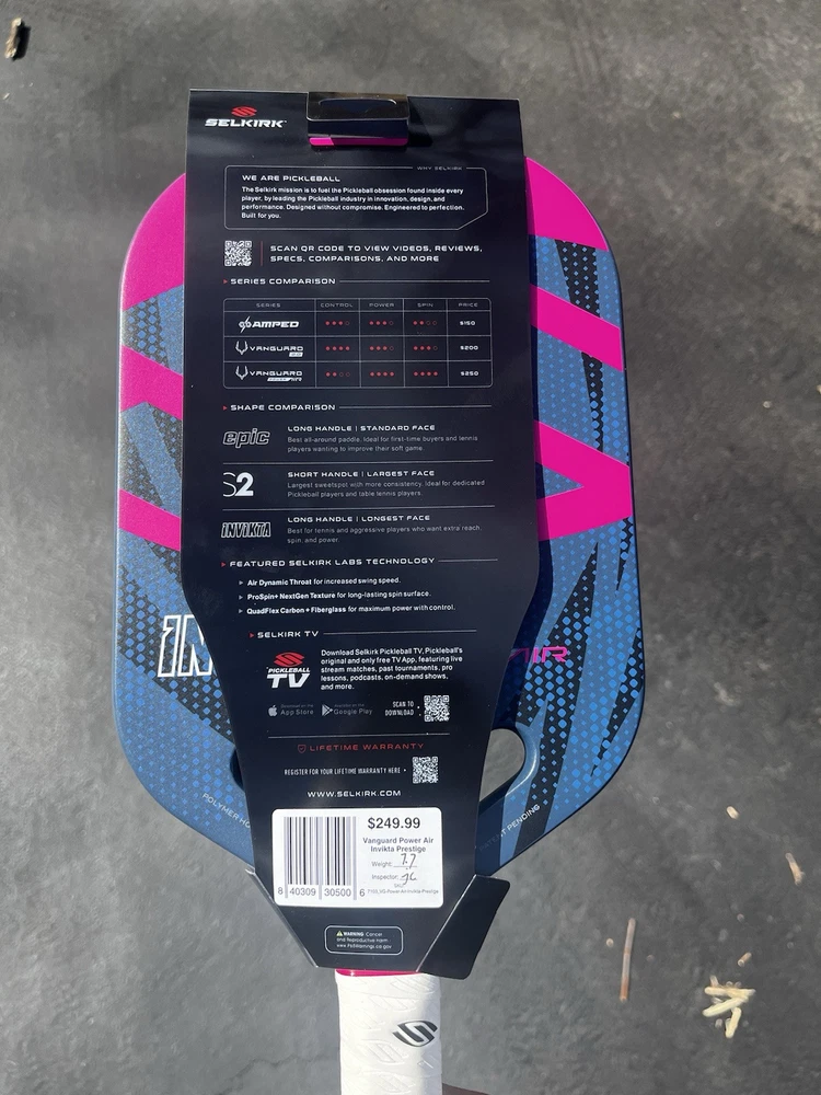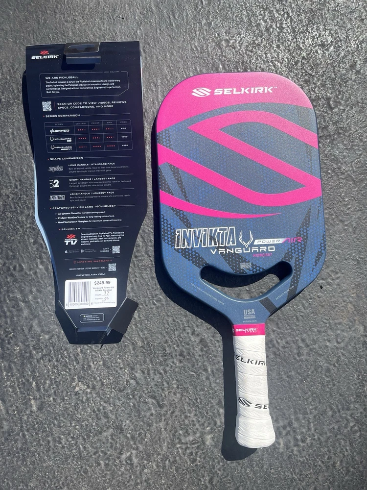 The Selkirk Invikta Vanguard Power Air Midweight Pickleball Paddle in Pink/Blue is a high-quality pickleball paddle designed for players who want power and control on the court. Made in the United States by Selkirk, a trusted brand in the tennis and racquet sports industry, this paddle is sure to impress. With its sleek pink and blue design, this paddle is not only functional but also stylish. The midweight design provides a comfortable feel, while the Vanguard Power Air technology delivers exceptional power and control. Whether you're a beginner or an experienced player, this paddle is a great choice for anyone looking to up their game on the court.
