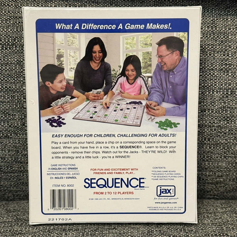 This challenging Sequence board game is perfect for kids and adults alike. With a minimum of 2 players, this game is sure to provide hours of fun and strategic gameplay. The game board features a variety of sequences to choose from, making it great for beginners or those looking for a relaxed game. The game is manufactured by Jax and was released in 1995. It falls under the category of contemporary manufacture and is recommended for ages 7 and up. The game's theme is strategy, making it a great choice for those who love to challenge their friends and family. Please see pictures for details. What you see is what you get Returns accepted in same condition as received. No Exceptions Handling We will ship all orders within 1 business day of payment. Delivery US We Do Not Ship Outside of the Continental US. International Delivery We ship to international customers only via the eBay Global Shipping eBay international Program, please see the price quote in the listing. Return Policy Please see our return policy. Feedback We take our reputation seriously, we buy and sell online, so we understand the value of trust. If you are unsatisfied with your order, please contact us and we will work with you to resolve it to your satisfaction.