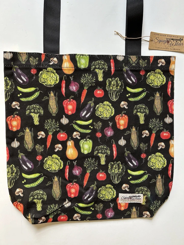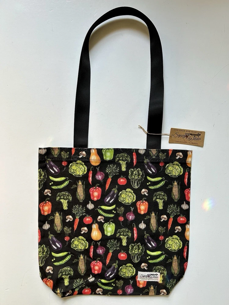 This fantastic tote bag from Sipsey Wilder—a woman-owned, eco-conscious small business from Tuscaloosa, Alabama—is in perfect, brand new condition, with tags. It features adorable “Fresh Veggies” artwork in bright colors over a black background. I love the overall effect of all this produce over black! I also love how sturdy and spacious this bag is! It’s seriously roomy and capable of holding a LOT of stuff! Tote measures 15"H x 15"W x 4"D Double handles Handle drop measures 13 in Limited Edition. From Sipsey Wilder: A healthy harvest of bright and delicious vegetables pop on a black background. Commit to plastic-free shopping! Adorable reusable shopping bags in eye-catching prints! Includes gusseted structure and an inner pocket for your personal items! Measures 15" x 15" x 4" with a 13" drop strap Includes open pocket inside for personal items or small items. Gusseted structure Cotton Canvas