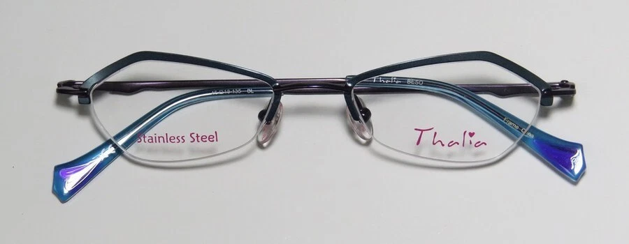 Thalia Beso Eyeglasses - Surplus Bargains Welcome to our store | contact us - Eyeglasses - - Sunglasses - - Reading Glasses - - Eyewear Cases - Thalia Beso Eyeglasses The frame is sold with demo lenses that have a logo stamped on them in ink. The frame can be fitted with real lenses at most optical stores. This frame provides comfortable fit and flatters a variety of face shapes. These eyeglasses are made of corrosion resistant and strong metal. The frame has spring hinges. Spring hinge temples prevent you from stretching the fit of your glasses and ensure that they remain intact and not become loose or out of shape. Please keep in mind that original case is not included with this frame. However, we will include a generic hard case or pouch at no extra charge to keep your eyeglasses protected. This is an authentic piece of eyewear acquired directly from the manufacturer. Please feel free to ask any questions you may have about this item. We have more similar items for sale listed in our eBay store. Condition : New Brand : Thalia Style : Beso Size : 44-18-130 Lens height : 24 mm Color code : bl Frame color : blue / purple Spring hinges : yes Hard case : generic MSRP : $95.00 About STORE CONTACT US if you have any questions or concerns about our eyewear products or online shopping experience. Your feedback is valuable to us, and we are always here to assist you. quick links Listings Contact Us